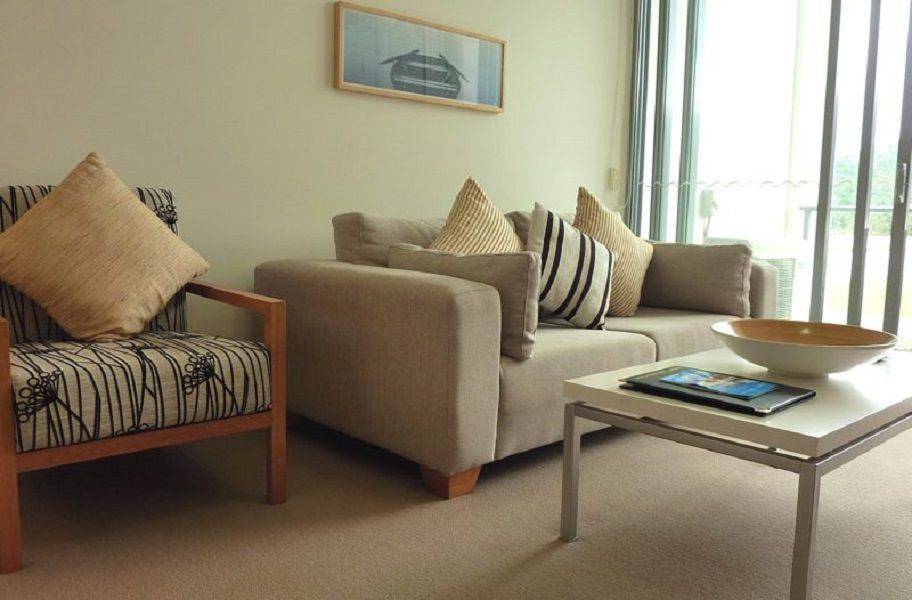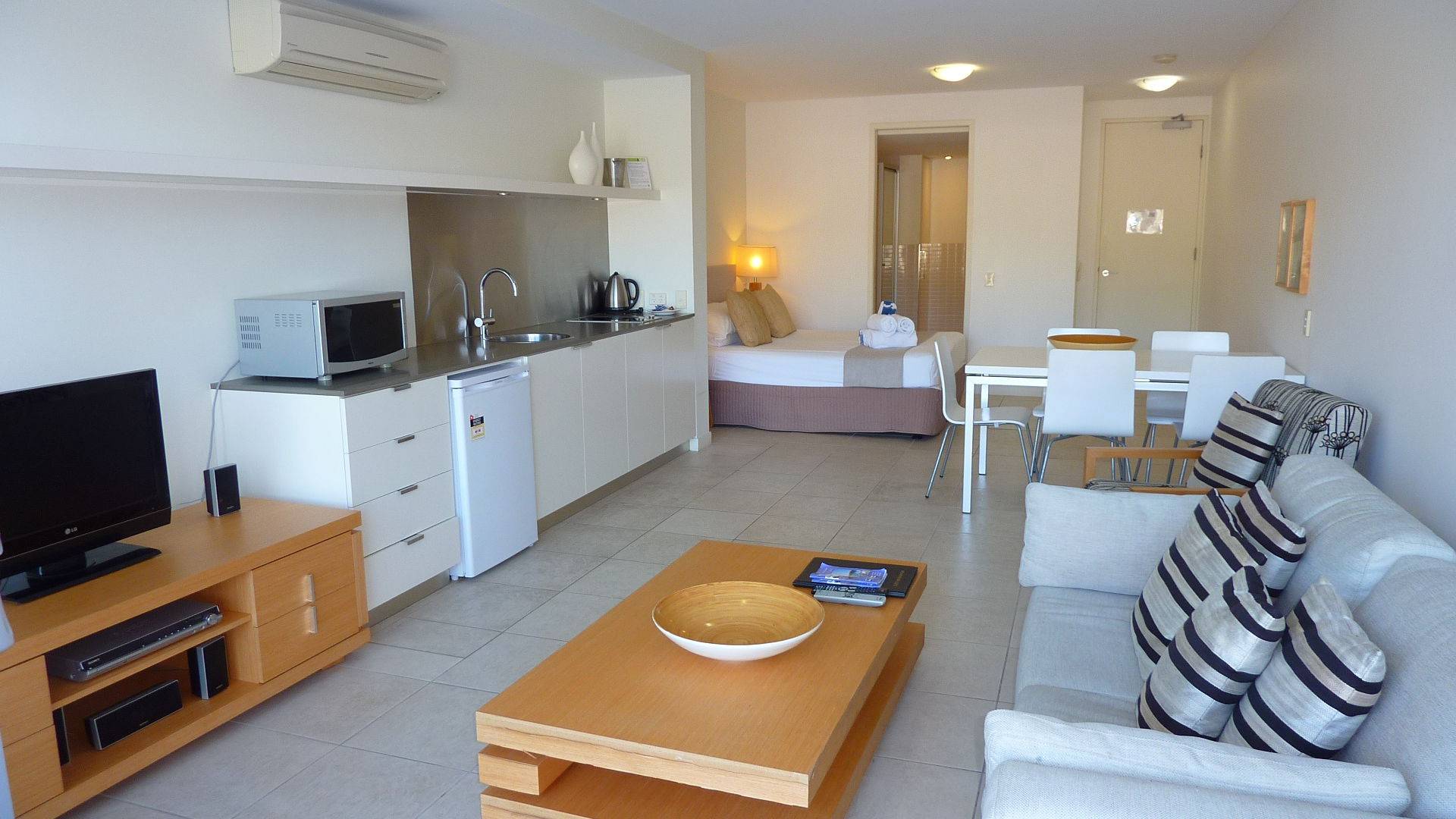 * The larger studio unit is comfortable for longer stays with a kitchenette, dining area, lounge, bathroom and laundry. Floor to ceiling glass doors open onto the balcony with its beautiful water views.