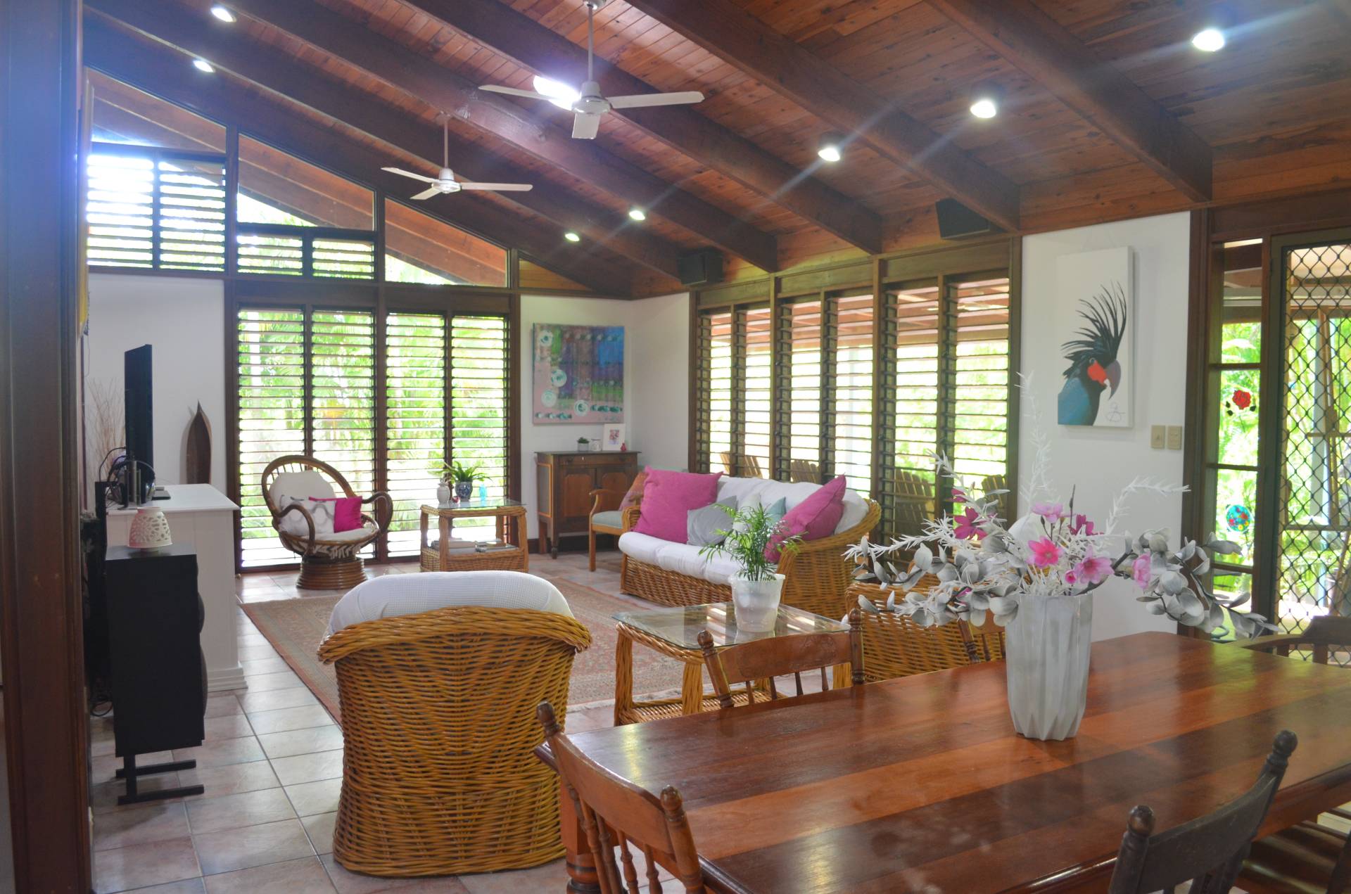 Situated on a large 1195m2 corner block, this beautiful character home has been built with the care and attention to detail not often found in many of today's builds. Designed for the tropics, walls are open with large banks of timber louvres and french doors providing constant cooling breezes while giving a wonderful feeling of space and light. The house is wrapped on all sides by wide timber decks that are perfect for outdoor tropical living. The decks are surrounded by the lush tropical gardens with a brand new pool to cool off in on those hot summer days.