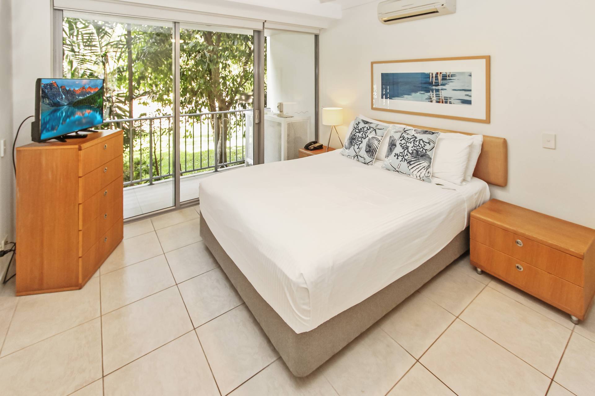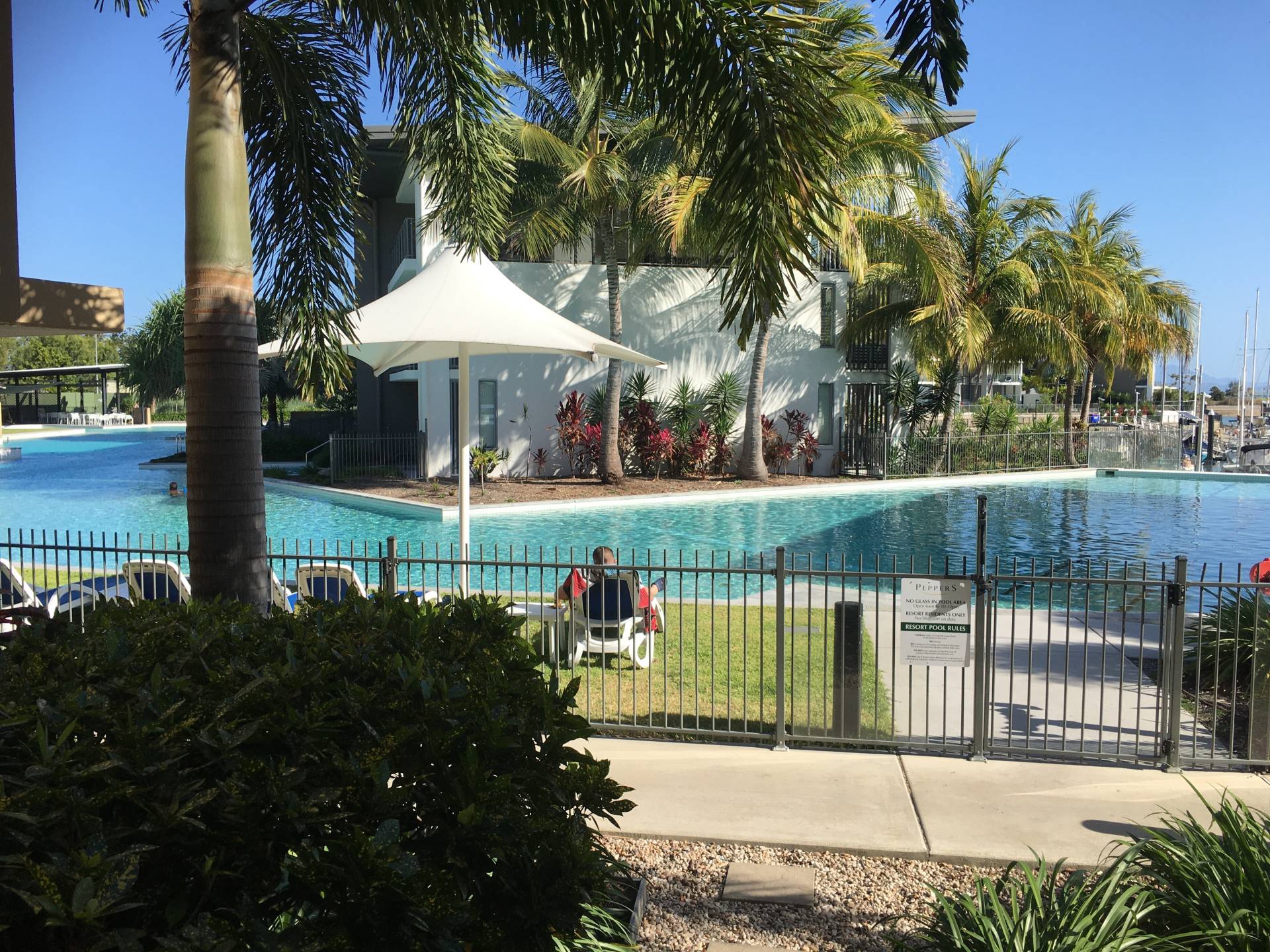 With endless views over the enormous lagoon pool, across the marina and all the way to the mainland in the distance, this spacious ground floor apartment is currently a popular holiday rental with families who can sit on the shady covered verandah and keep an eye on the kids in the pool just in front or those who don't want to have to climb lots of stairs.