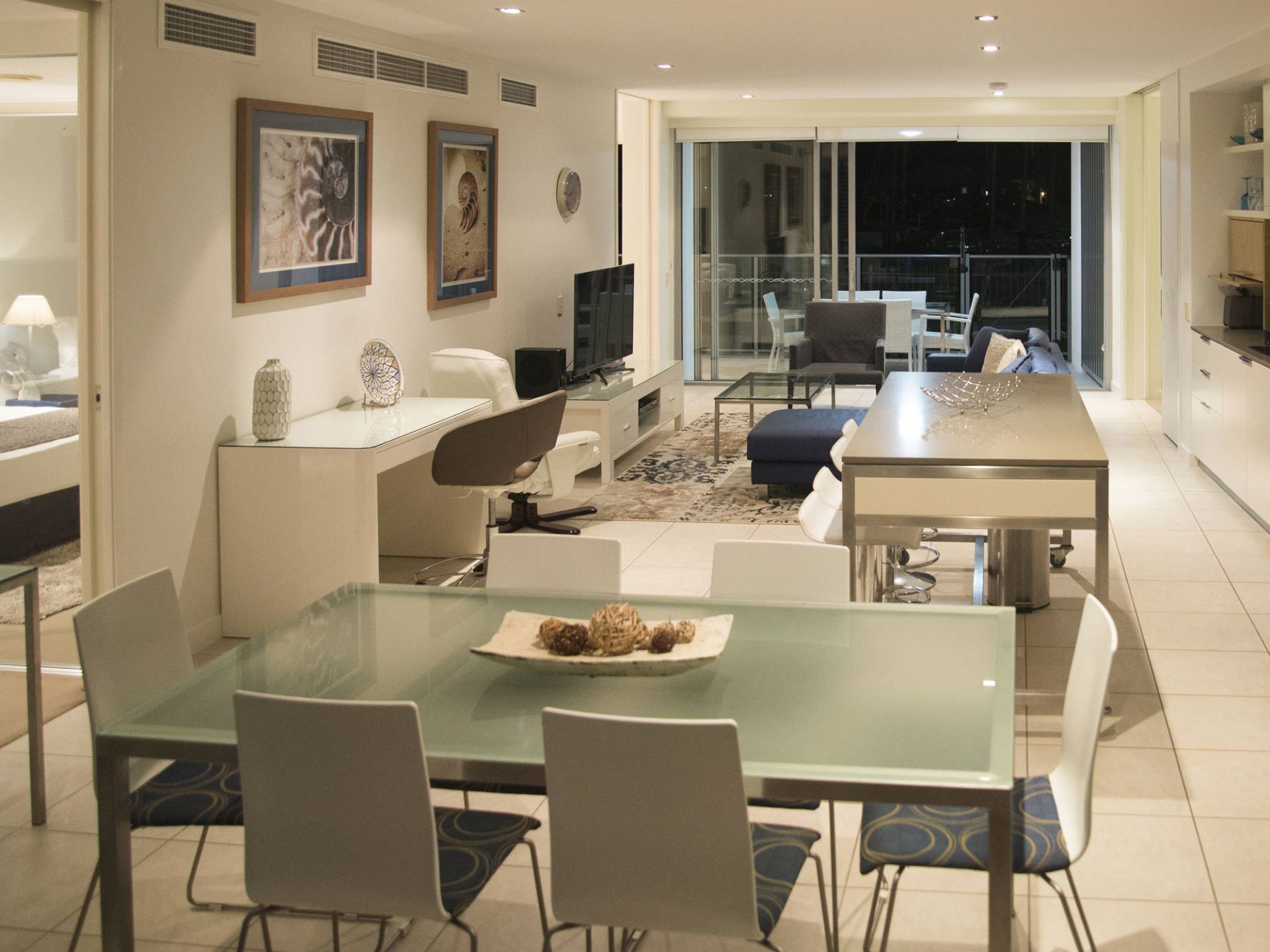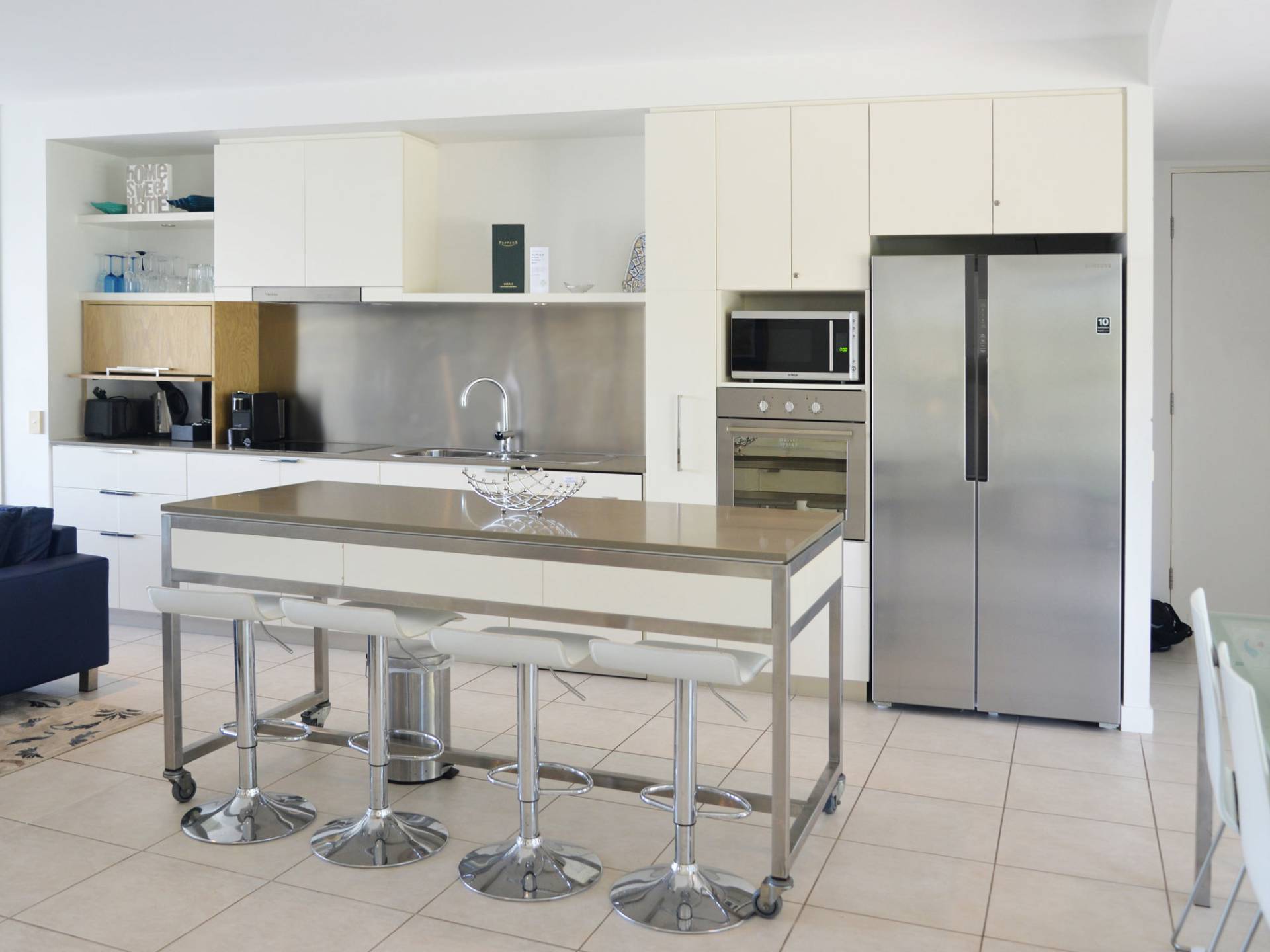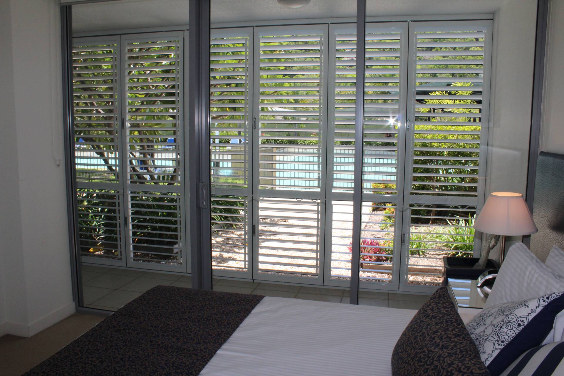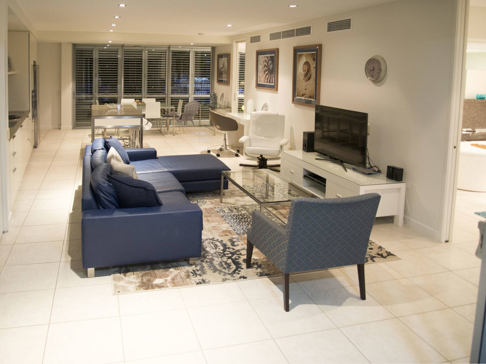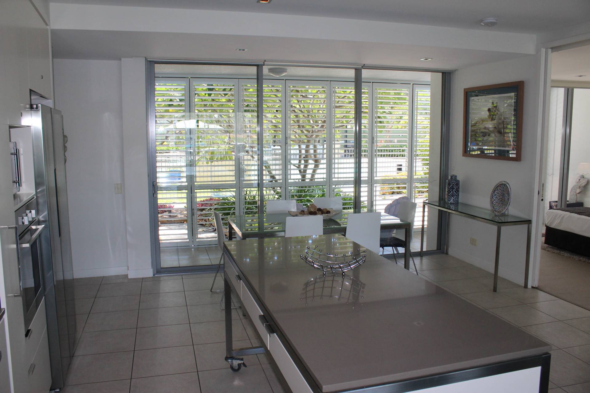 * Open-plan living area allows water views from the moment you step through the front door. Light, bright, airy and private - this premium apartment has been upgraded with bi-fold plantation shutters to the rear patio that can be opened or closed partially or fully to allow full use of the back patio and security to the whole apartment whilst still allowing the beautiful cross-breezes.
