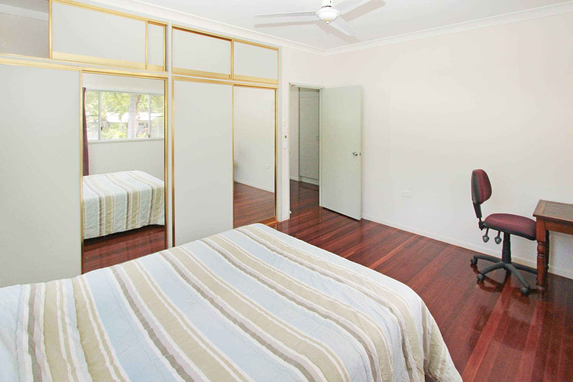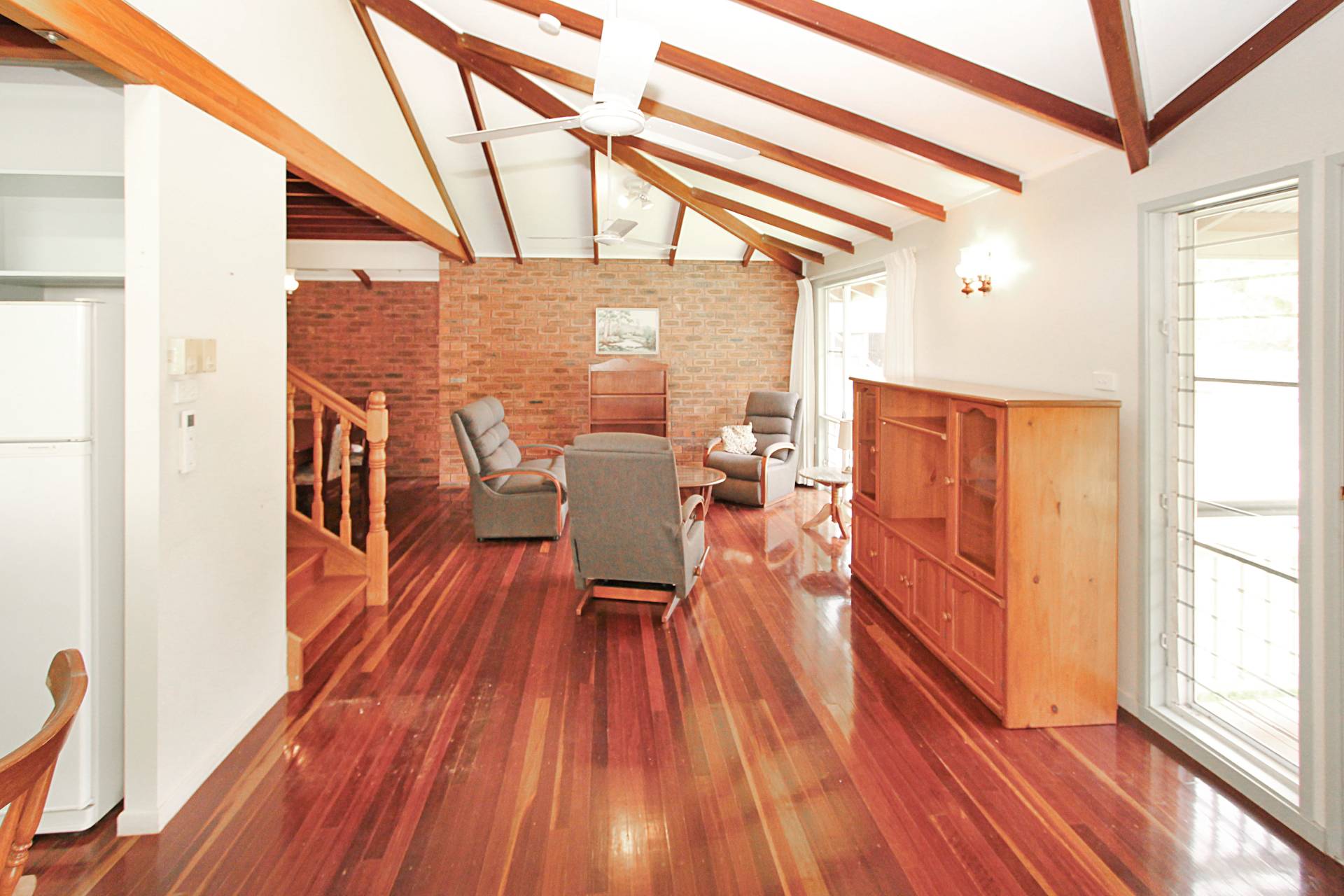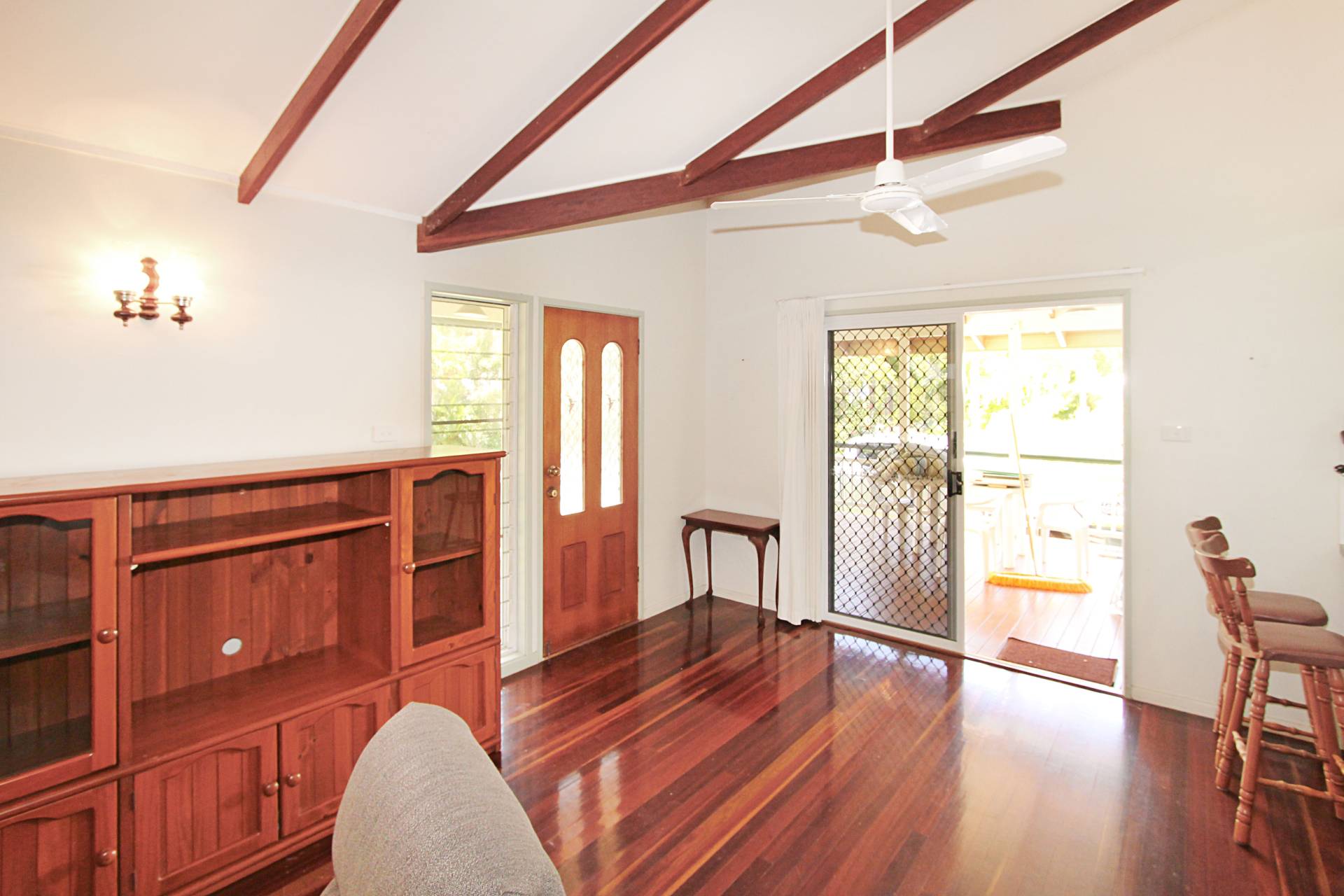 The large covered deck catches both the south-easterly and northerly breezes perfectly and affords lovely mountain views. There's a formal front door and a sliding glass door to the side to enter into the living area with its raked ceiling adding character and a sense of space. Beautiful polished wood floors feature throughout the house and add to the solid feel of this home, built by a professional local builder in 1994.