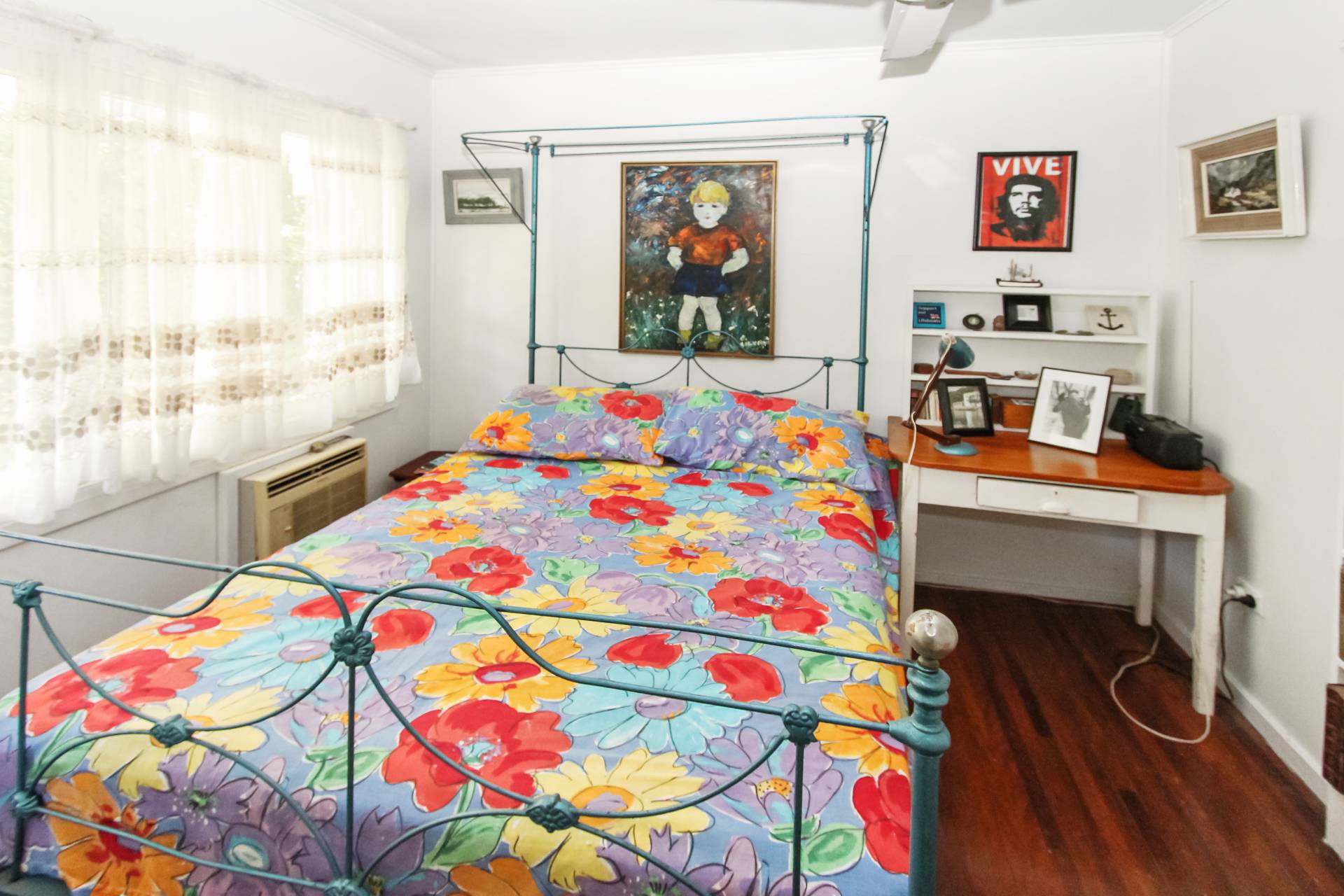 There's a total of four bedrooms, two large main bedrooms with built-in-wardrobes and two smaller bedrooms, all with hardwood flooring. The two bathrooms are of the original style and in keeping with the property's quirky artistic character, with half baths, separate shower and vanity and adjoining separate WC.