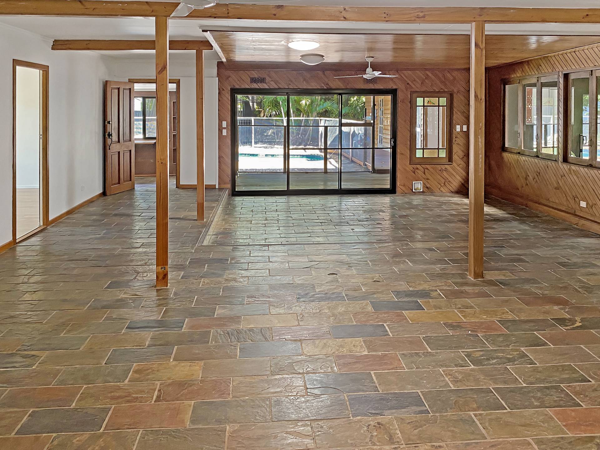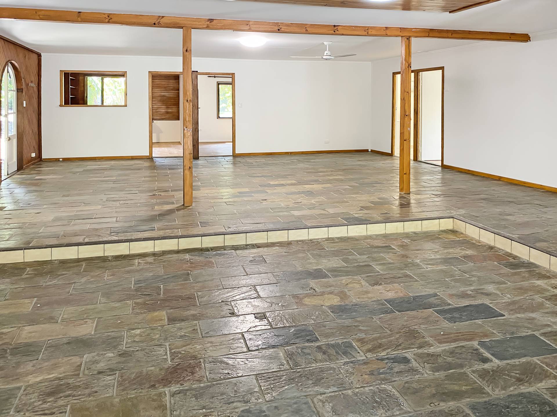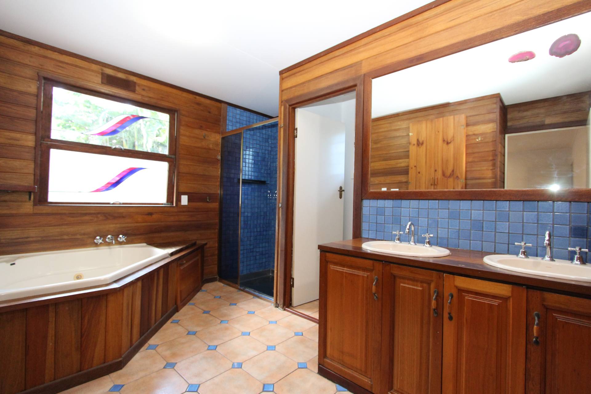 The open-plan living area is huge, with slate floors and a sunken lounge area opening onto a covered deck and looking out onto the pool. The first room to the left of the front door is set up as an office and the master bedroom is adjacent which features ensuite bathroom with corner bath, separate shower, large double vanity and private WC.