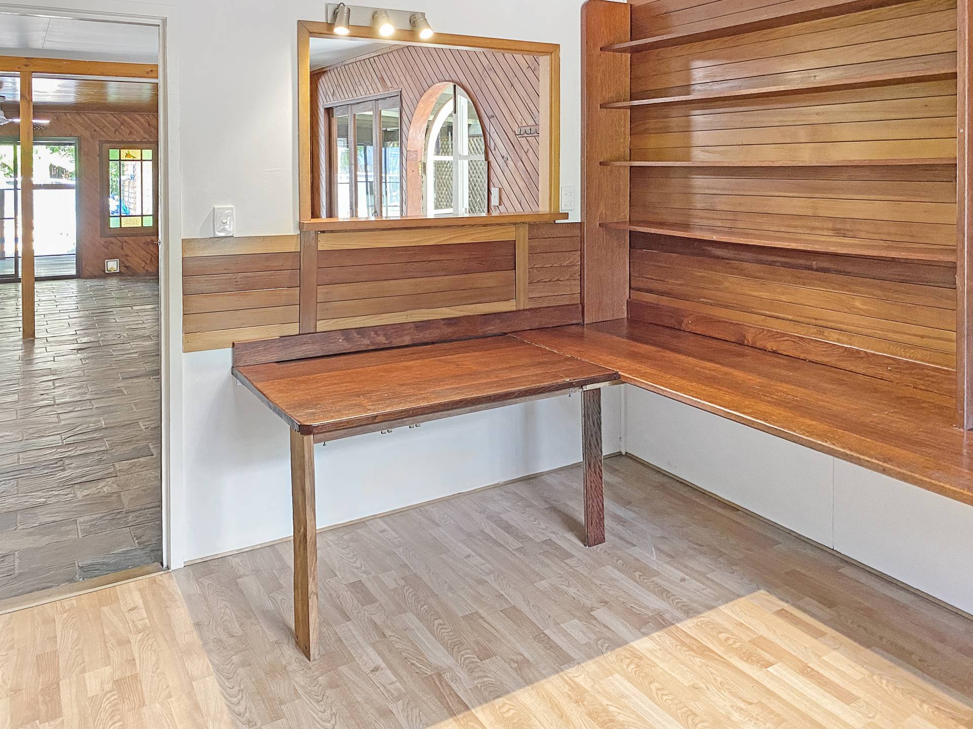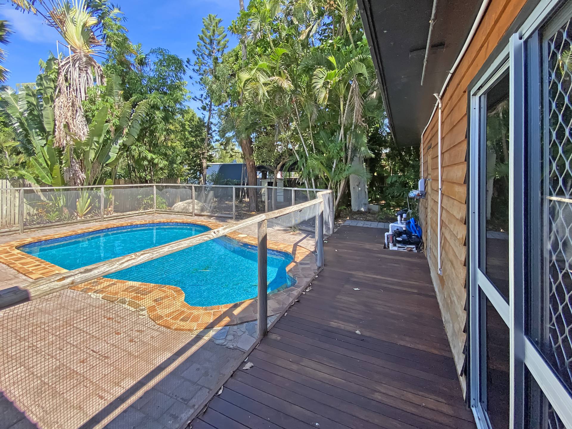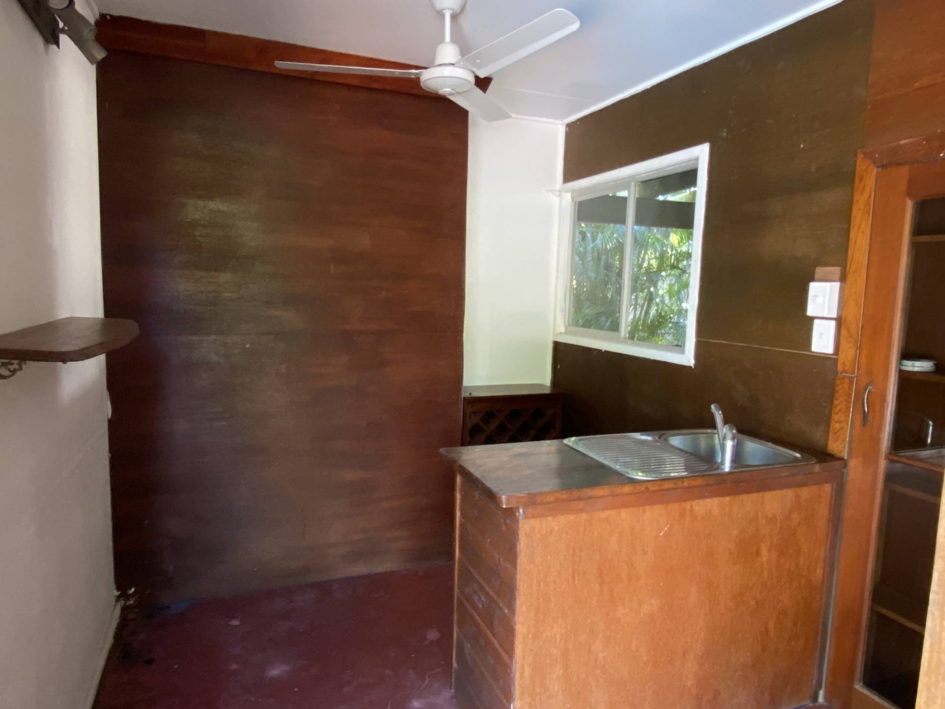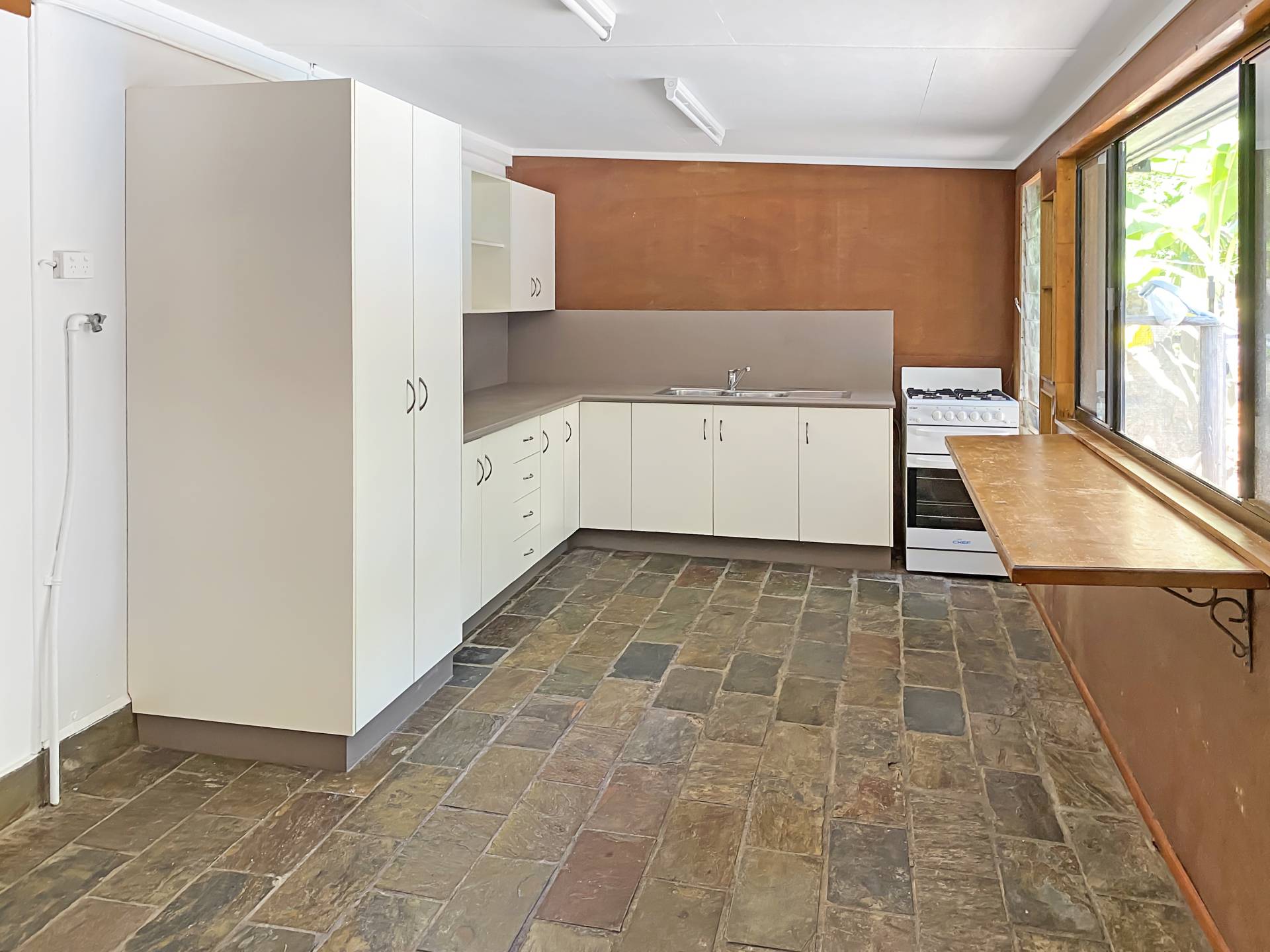The family bathroom has been renovated with shower, toilet and vanity. The kitchen is down a step from the living area, looking out over the pool and opens at one end to the covered deck off the living room.