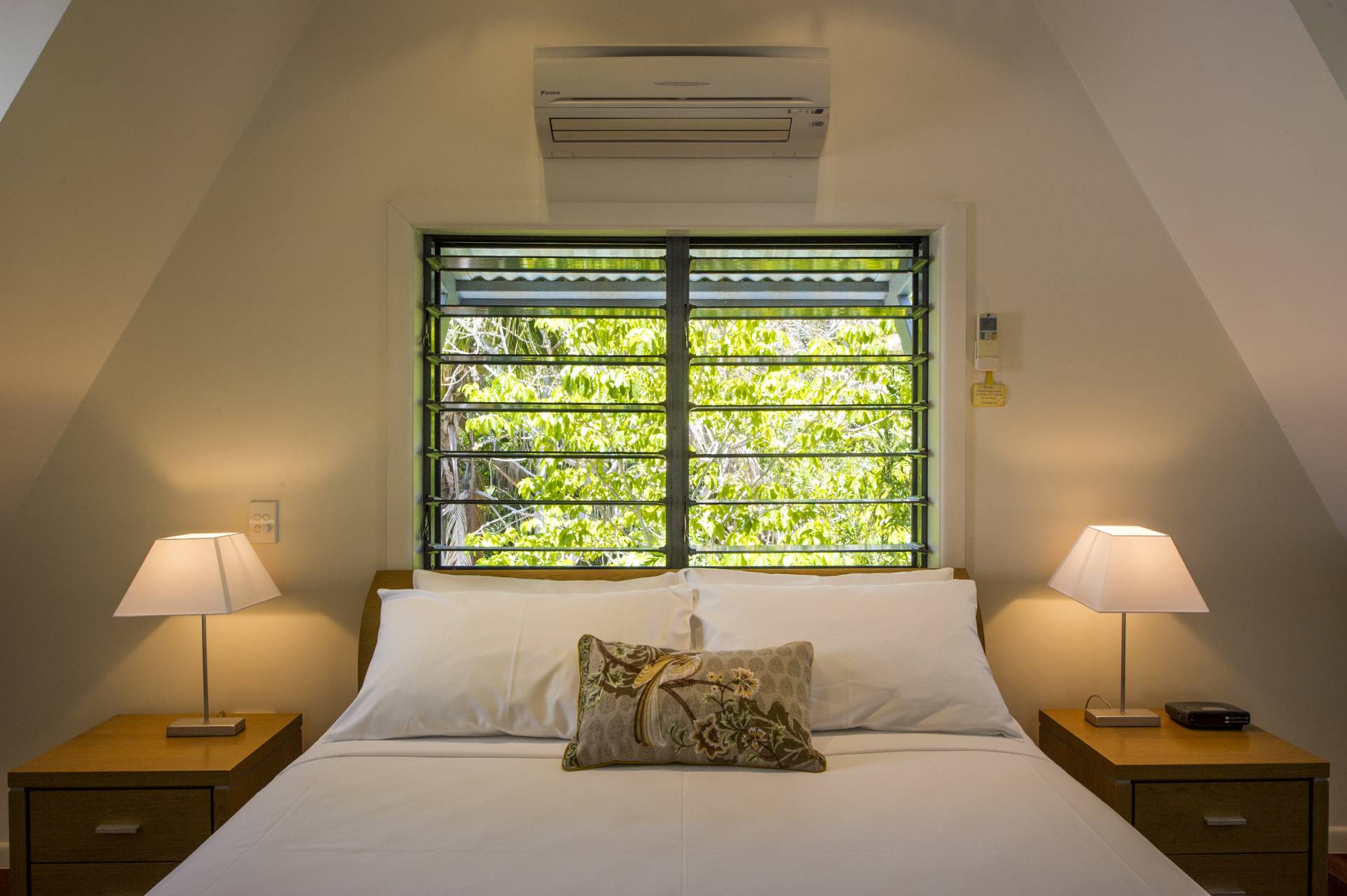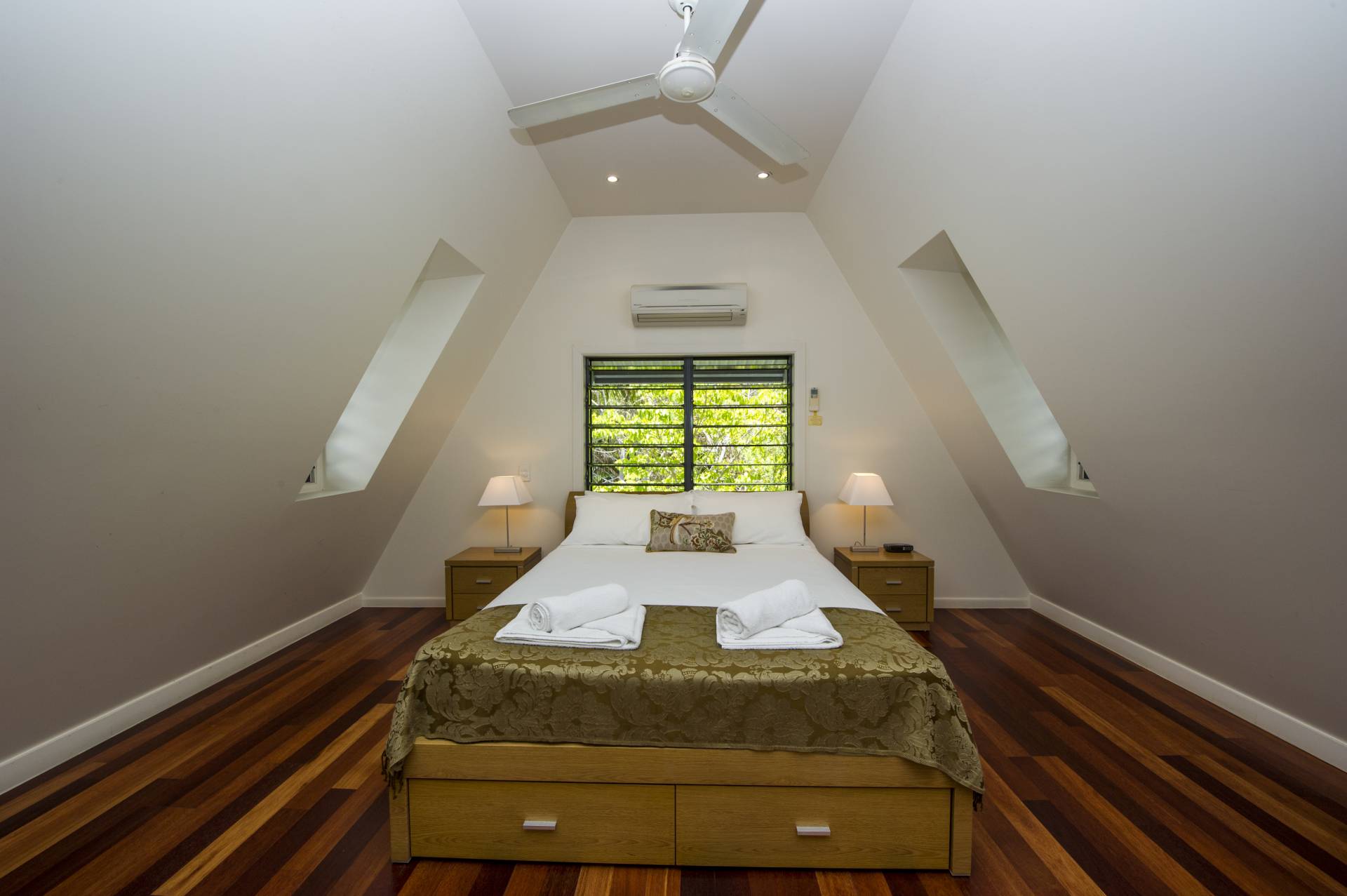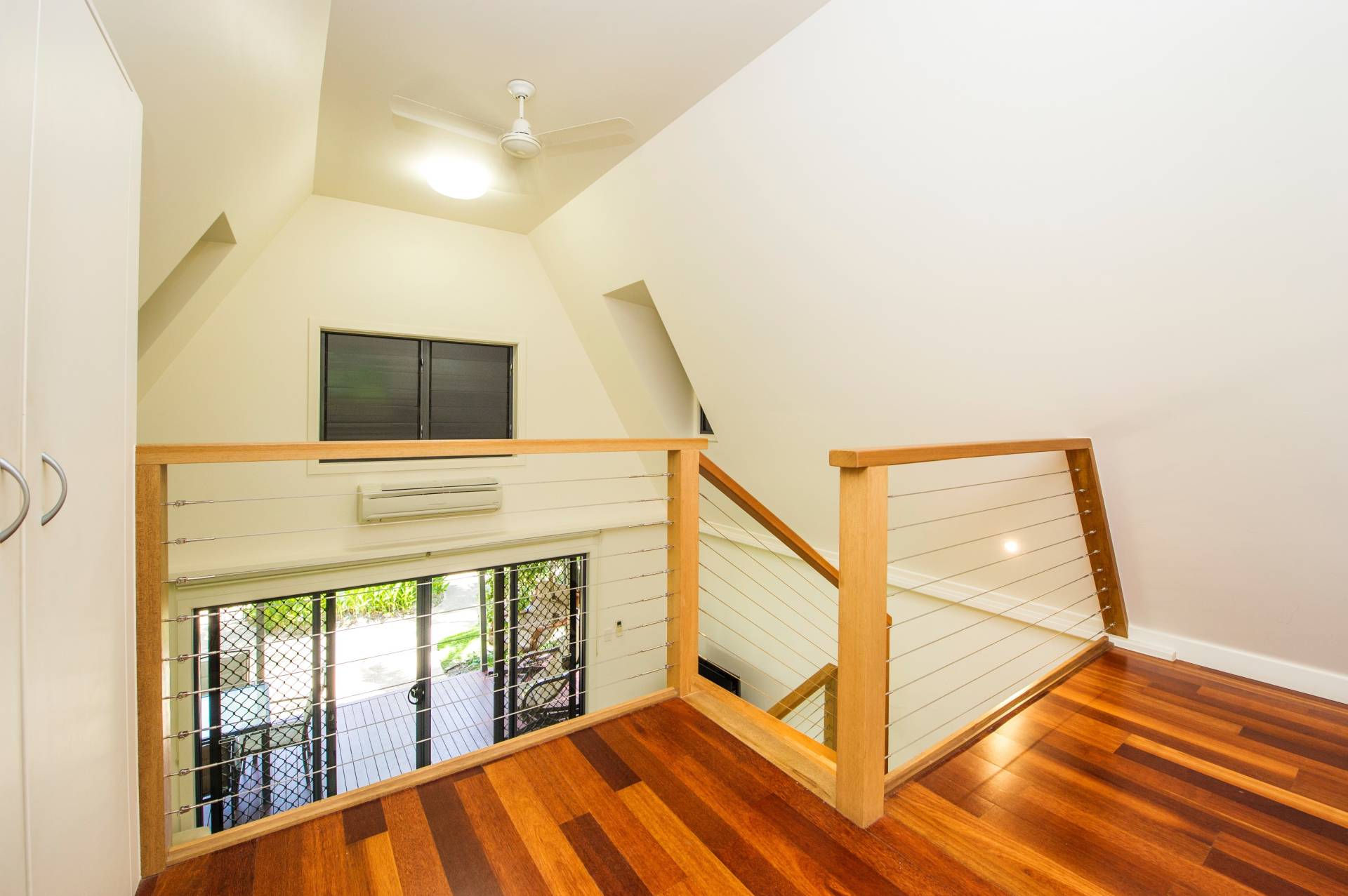 Upstairs, there is a spacious air-conditioned mezzanine master bedroom with polished wood floors, wardrobe and surrounded by louvre windows making it lovely and cool all year round.