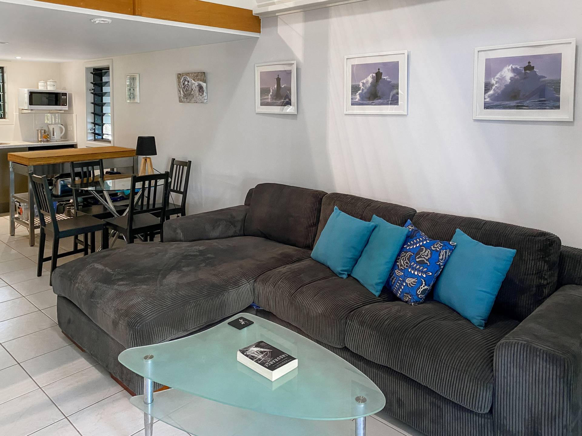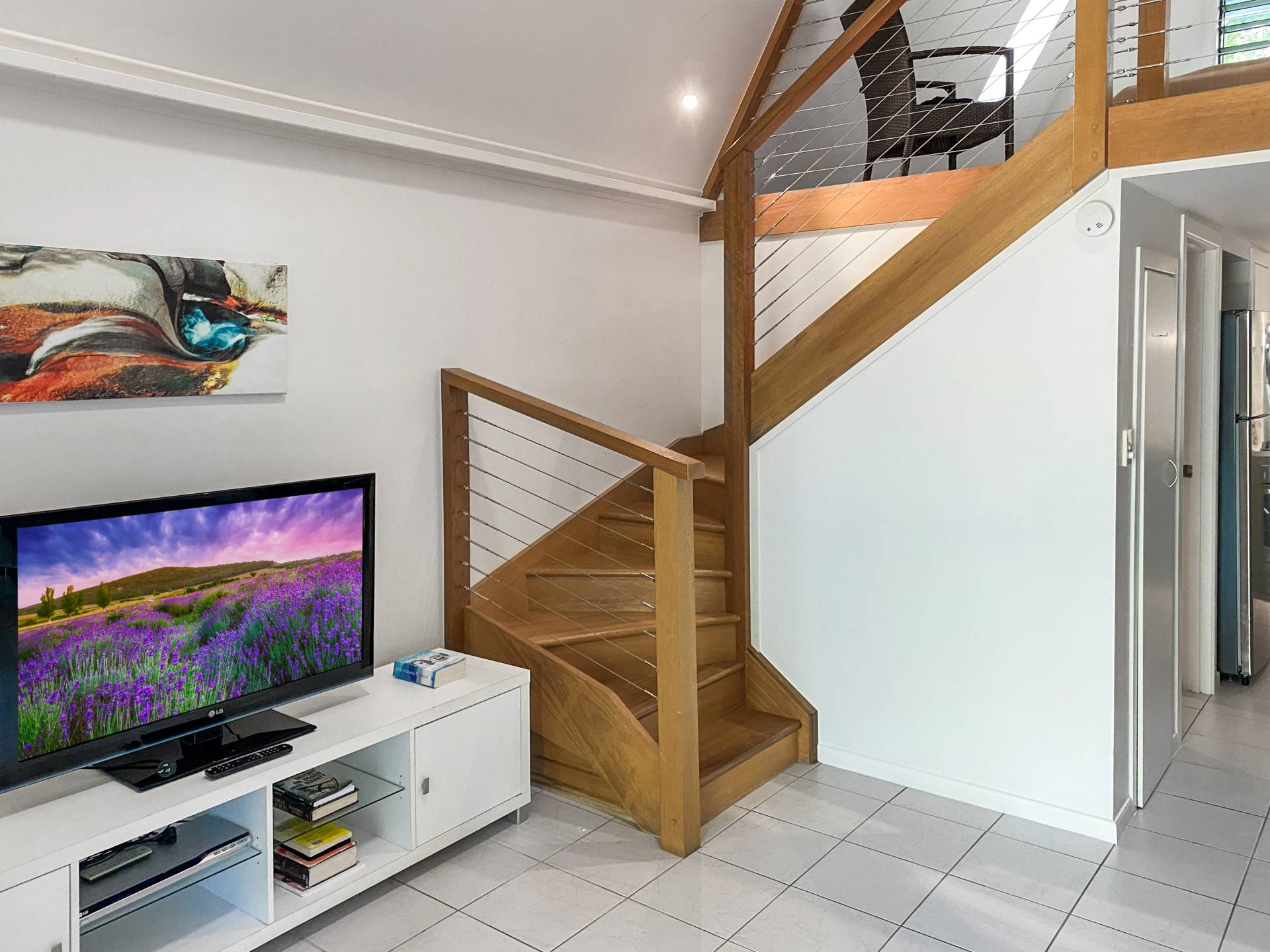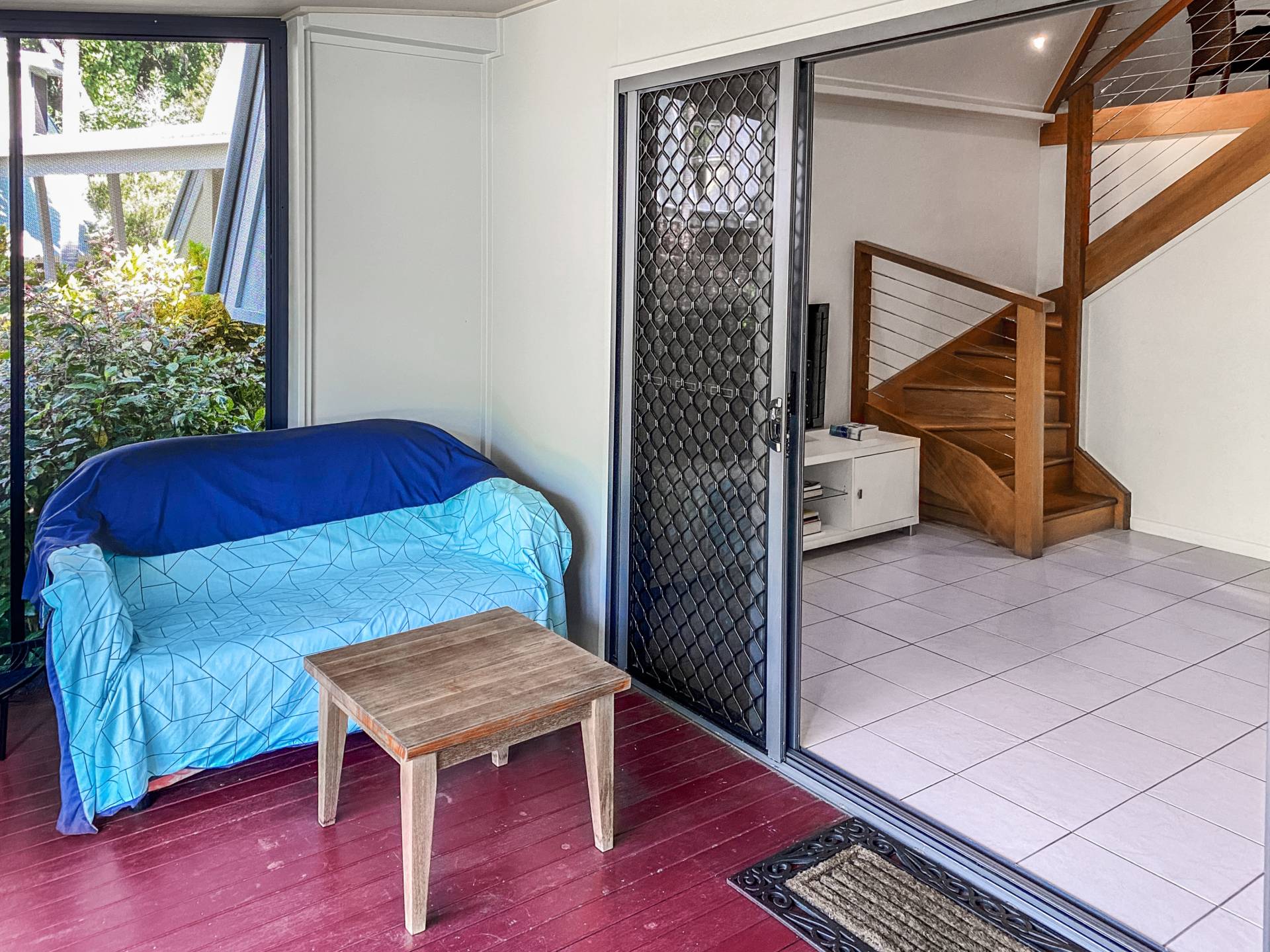 The unit has a lovely covered deck overlooking the gardens and pool which has been enclosed with Crimsafe screens making another room, adding privacy and security yet still feeling like an open deck. Sliding doors from the deck bring you into the open-plan living area with a double height A-frame ceiling providing a spacious feel. The kitchen is fully equipped with electric cooktop, oven and dishwasher and the dining area fits nicely between the lounge and kitchen.