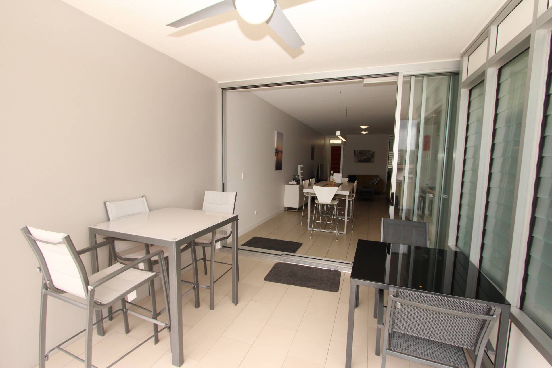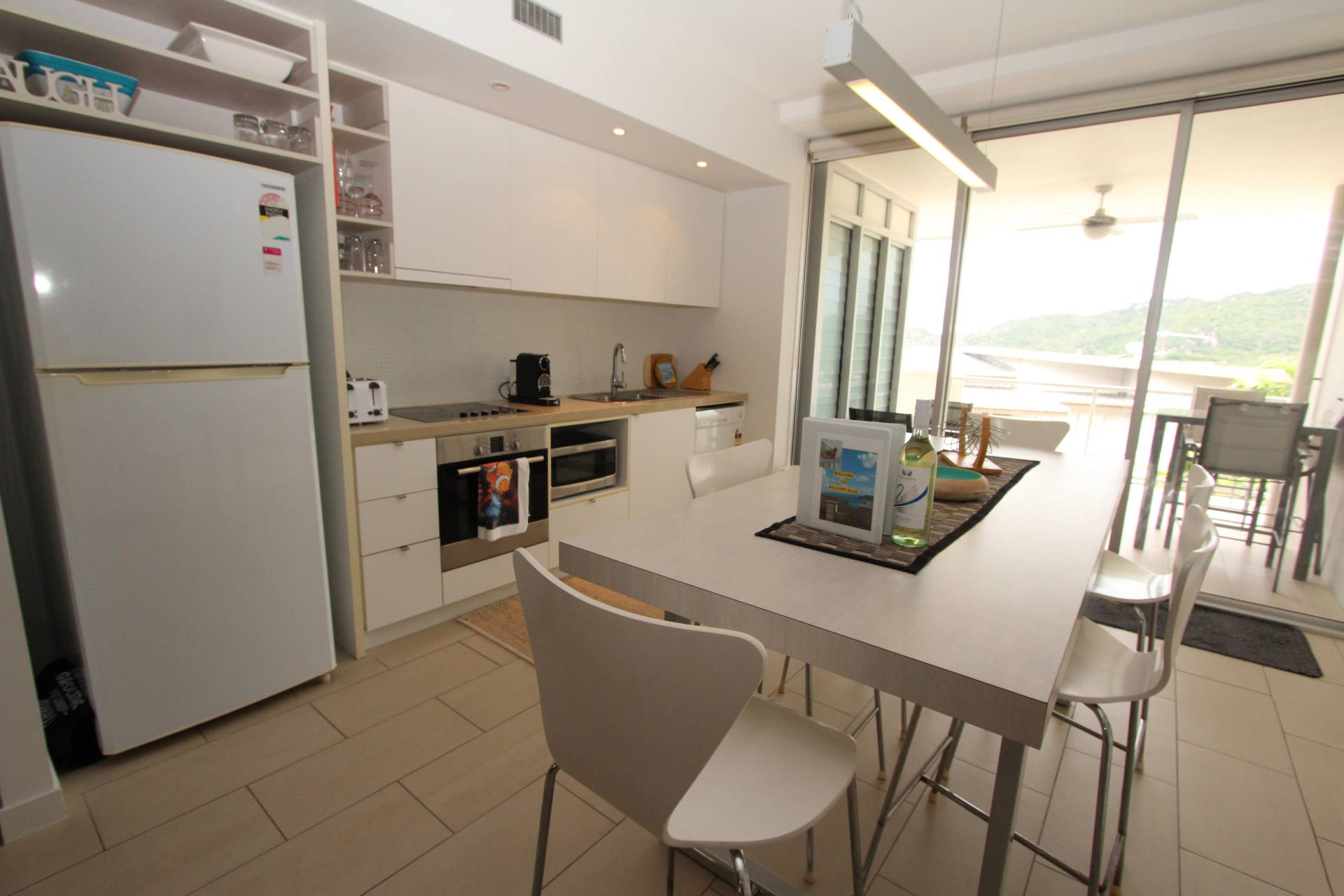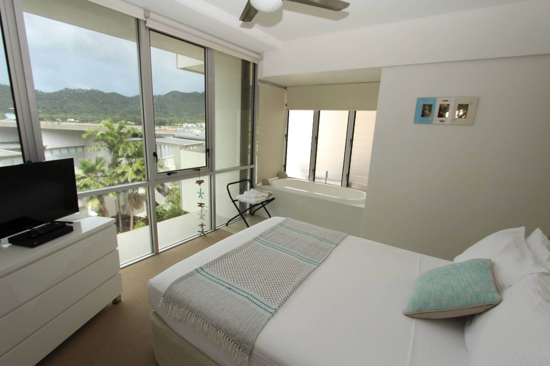 This fourth floor apartment offers water views across the Coral Sea to the granite boulder-strewn mountains of Magnetic Island, Nelly Bay beach and to the twinkling lights of Townsville.