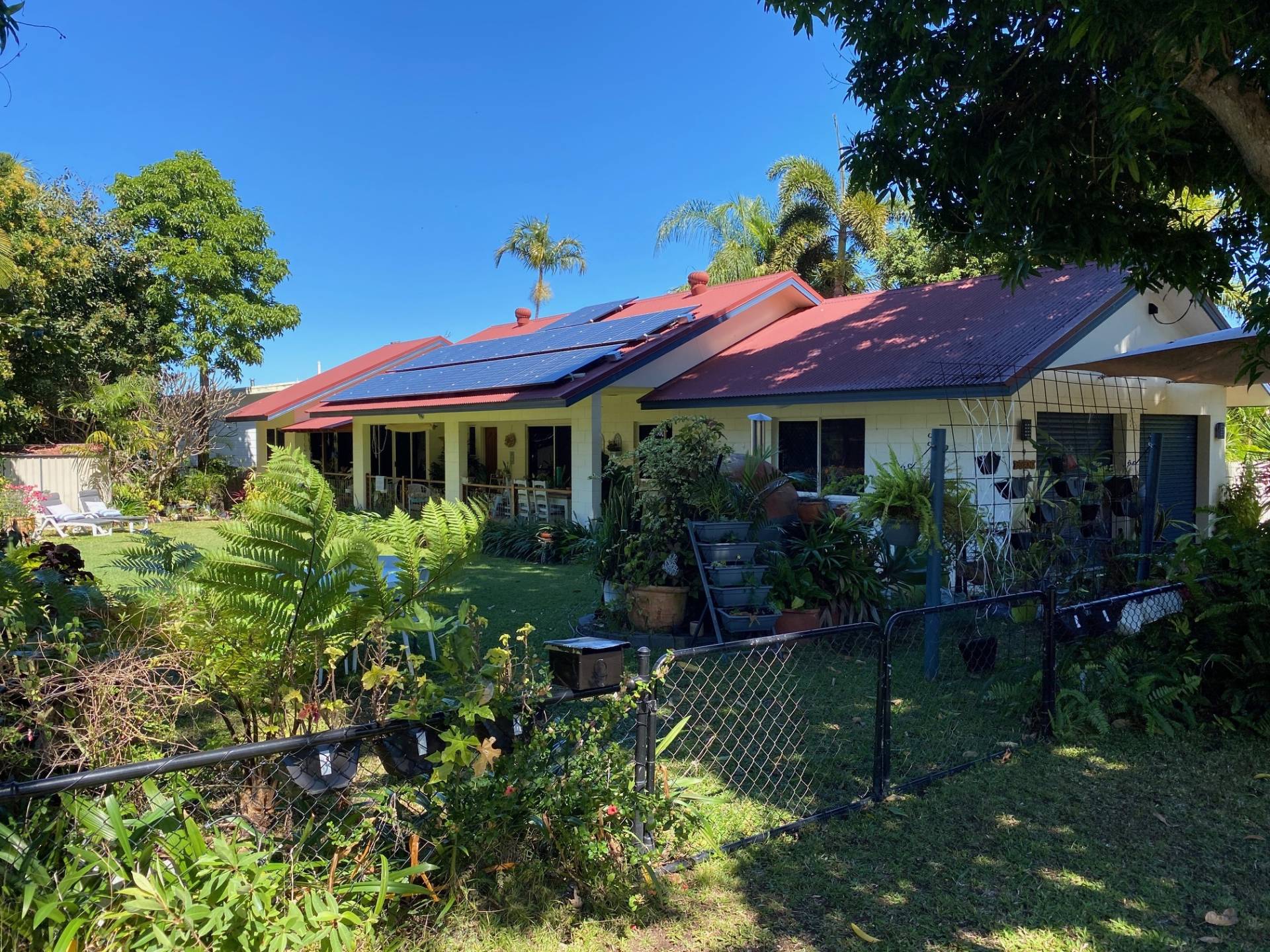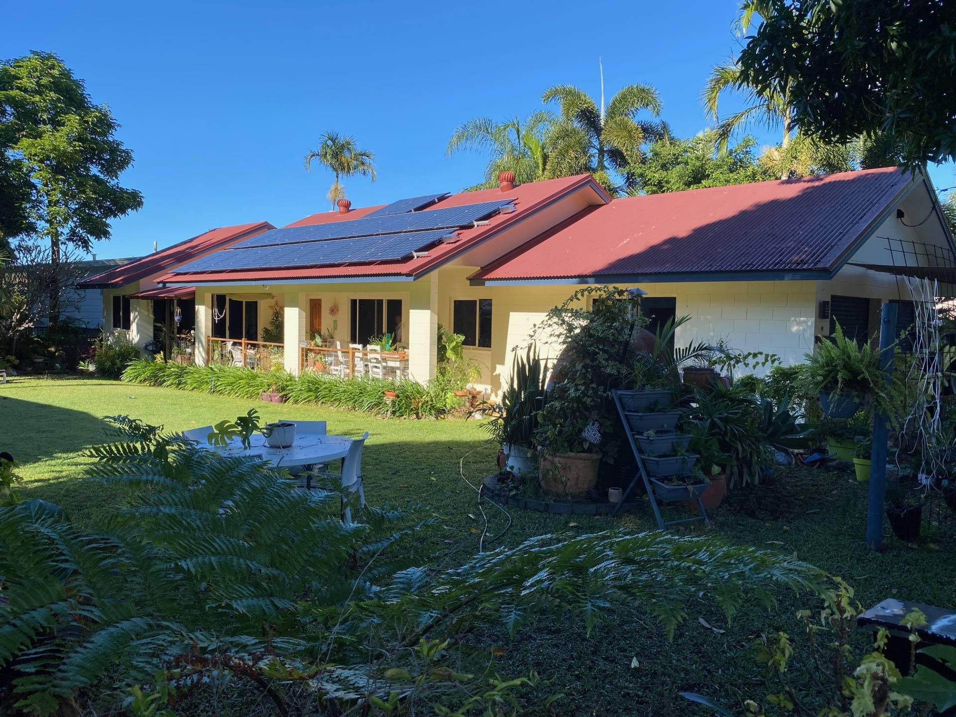 * Open-plan living area with kitchen and plenty of space for lounge and dining with sliding glass doors onto the covered side patio which overlooks the garden. Security screened windows and ceiling fans as well as glass sliding doors also to the rear ensure excellent cross-ventilation, meaning the air-con is rarely used.