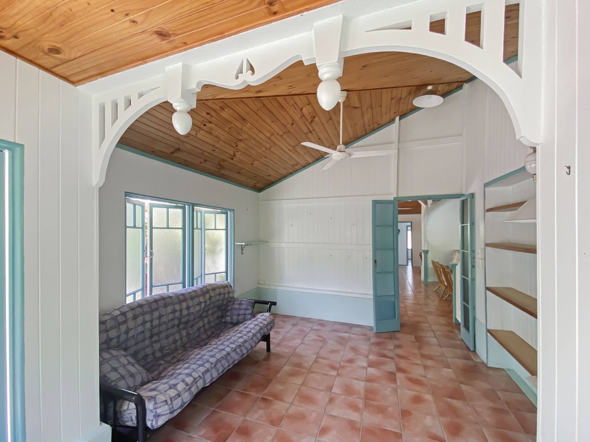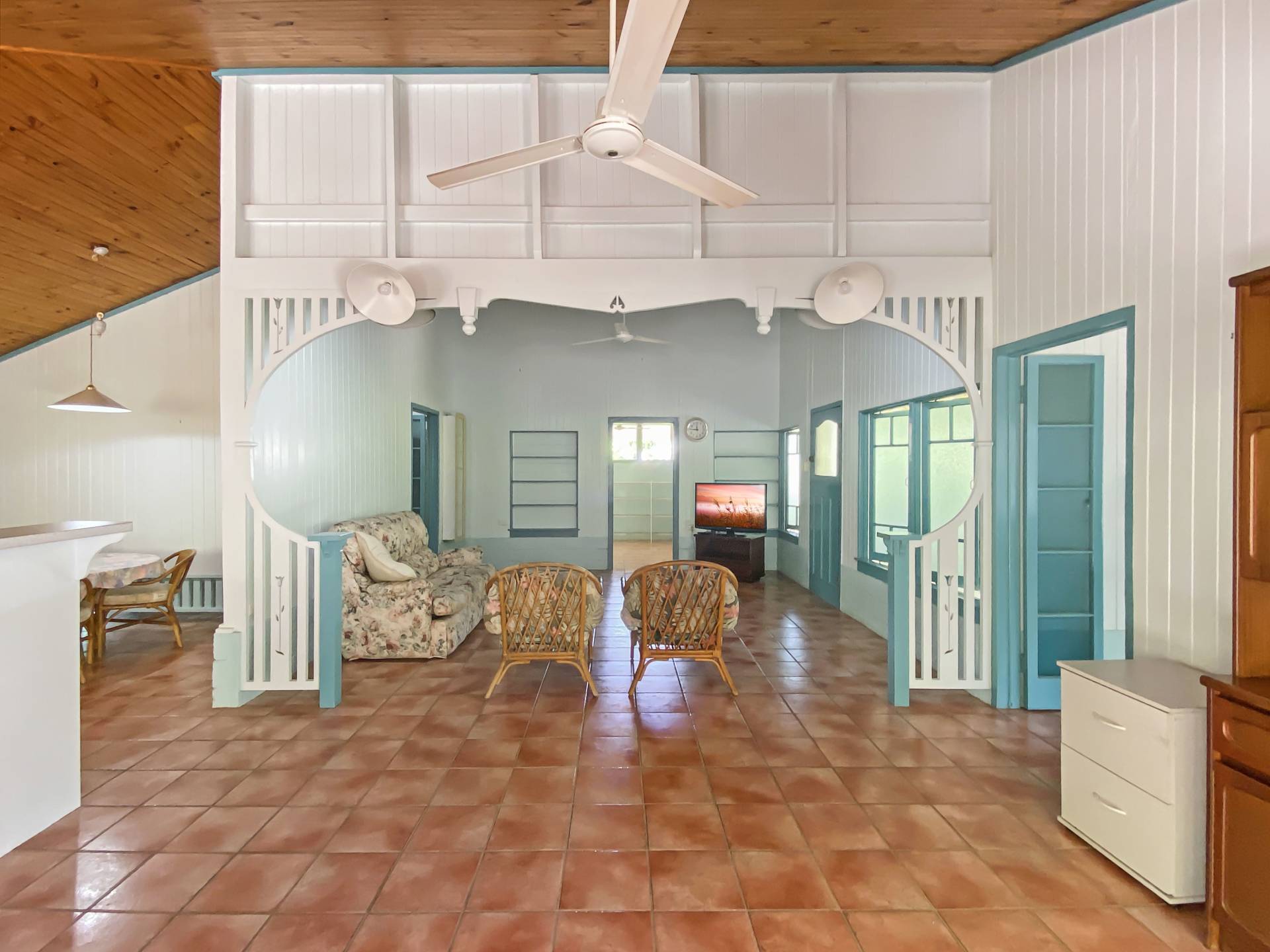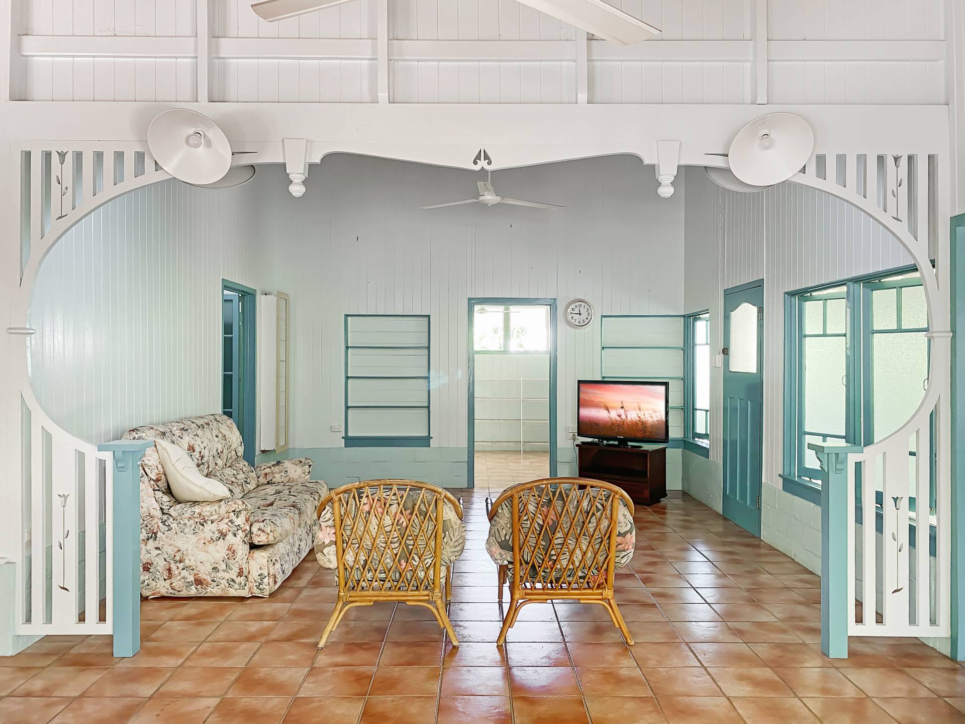 Walking up the garden path, a large covered verandah brings you up to the front door. Entering into the lounge, the extra-high timber-lined ceiling gives a wonderful sense of space yet also warmth, while casement windows and doors, combined with intricate fretwork, make this feel like a real old Queenslander home.