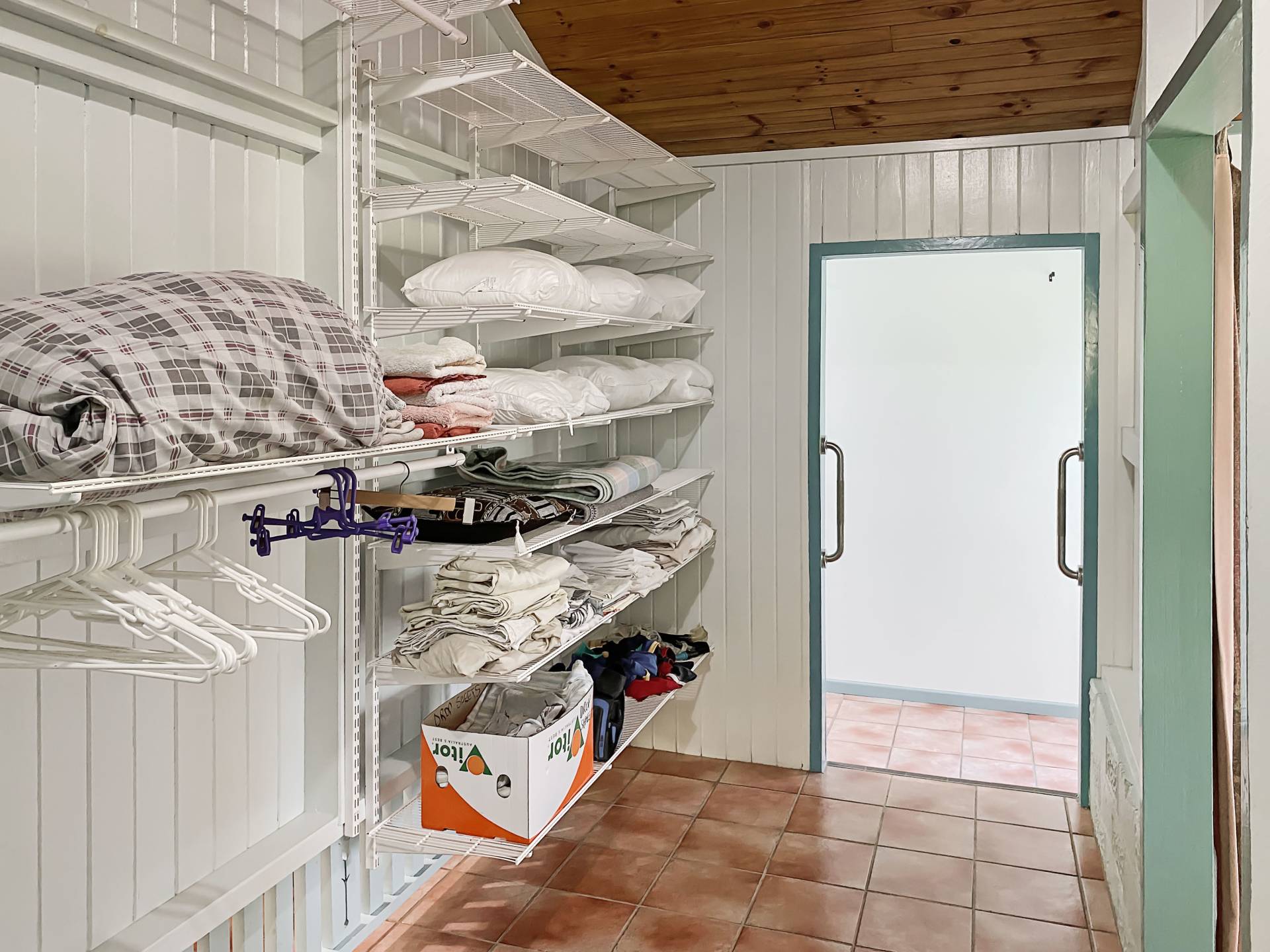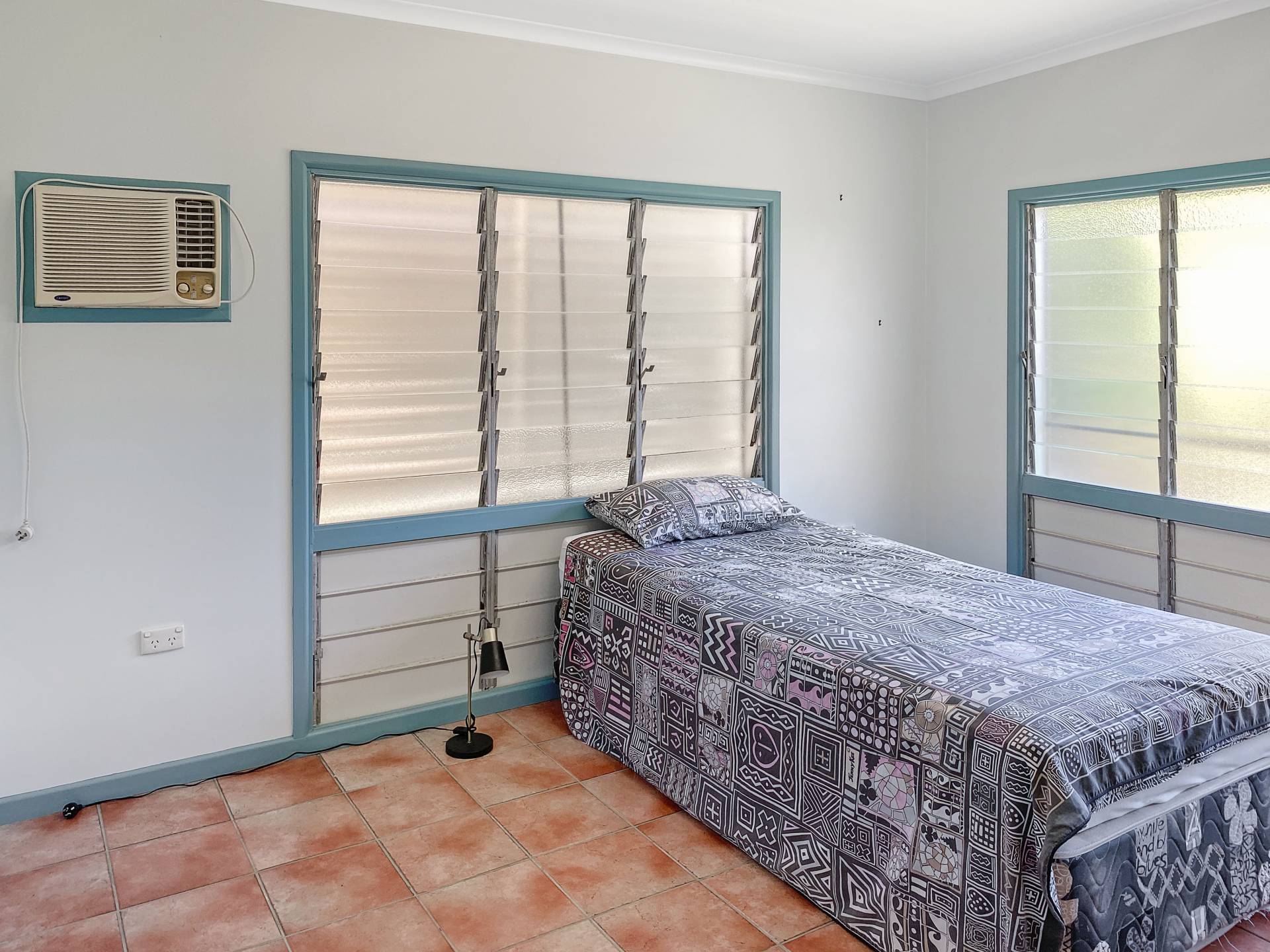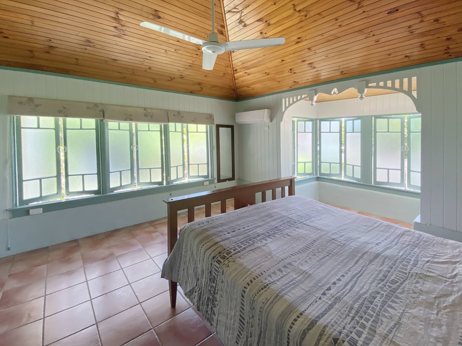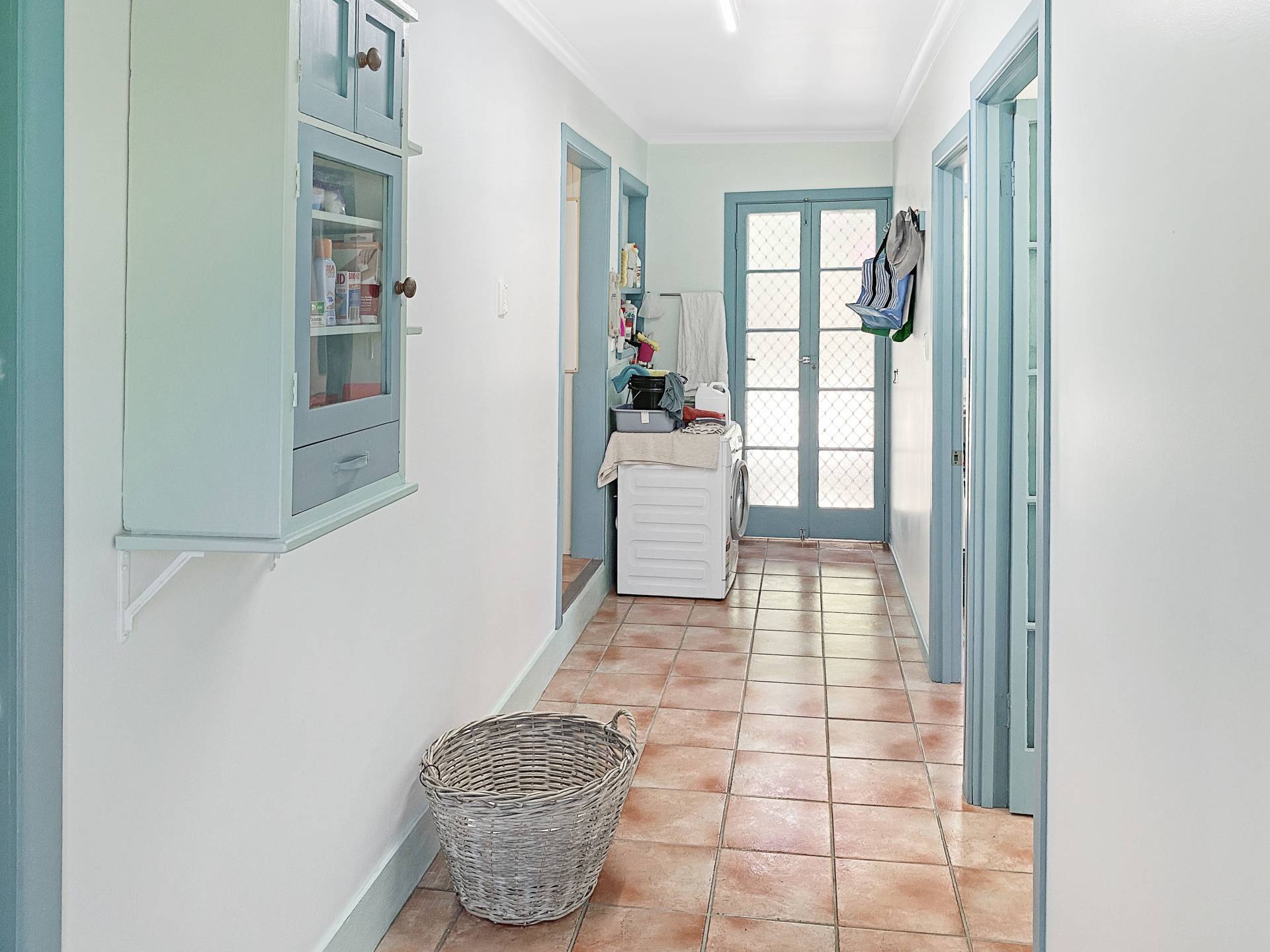 There are two large bedrooms, both with casement bay windows framed by fretwork, and two smaller bedrooms. The main bedroom has a split system air con and opens into a large walk-through wardrobe/store. A light and airy hallway houses the laundry at one end, off which is the bathroom and third bedroom.