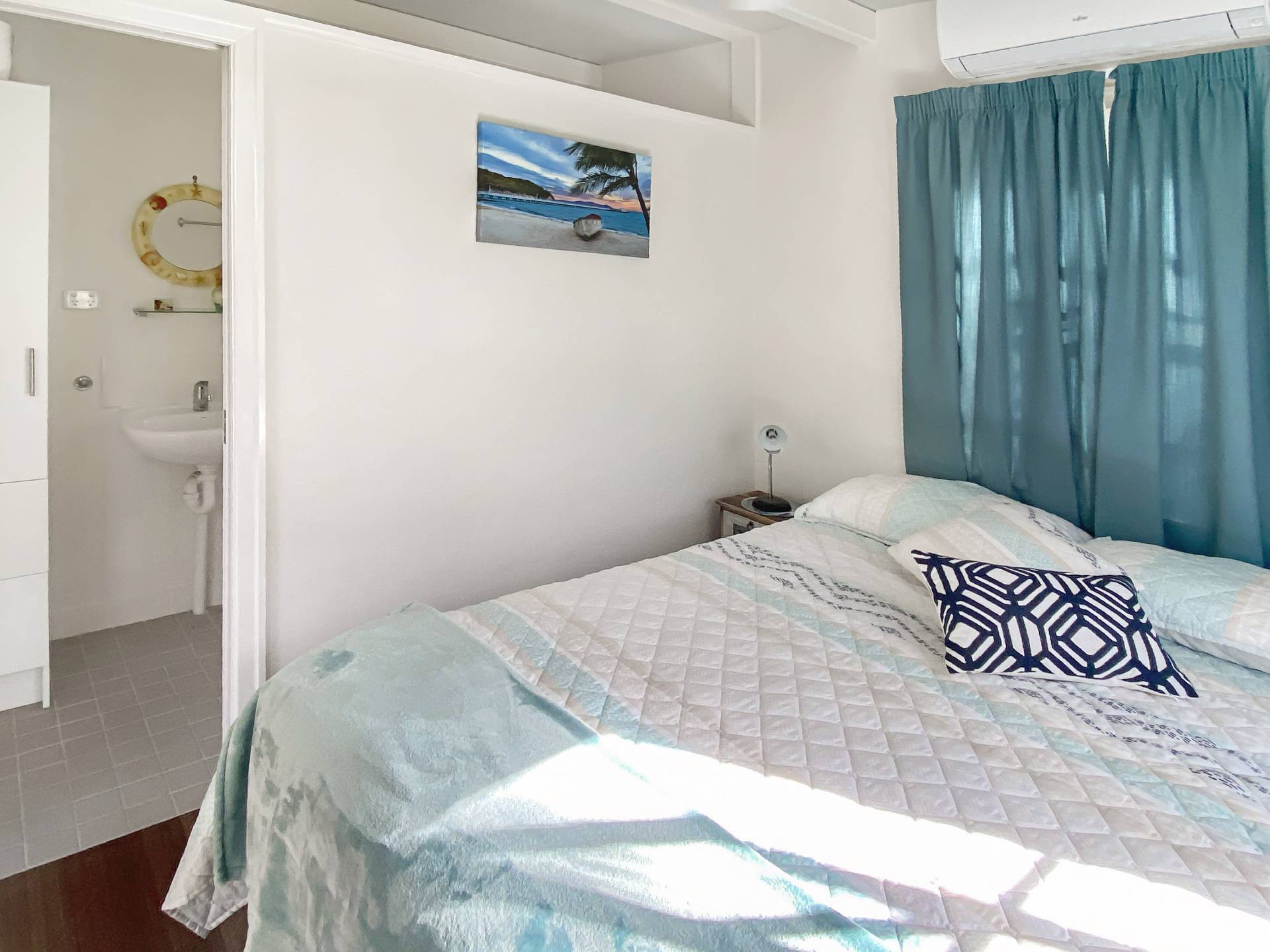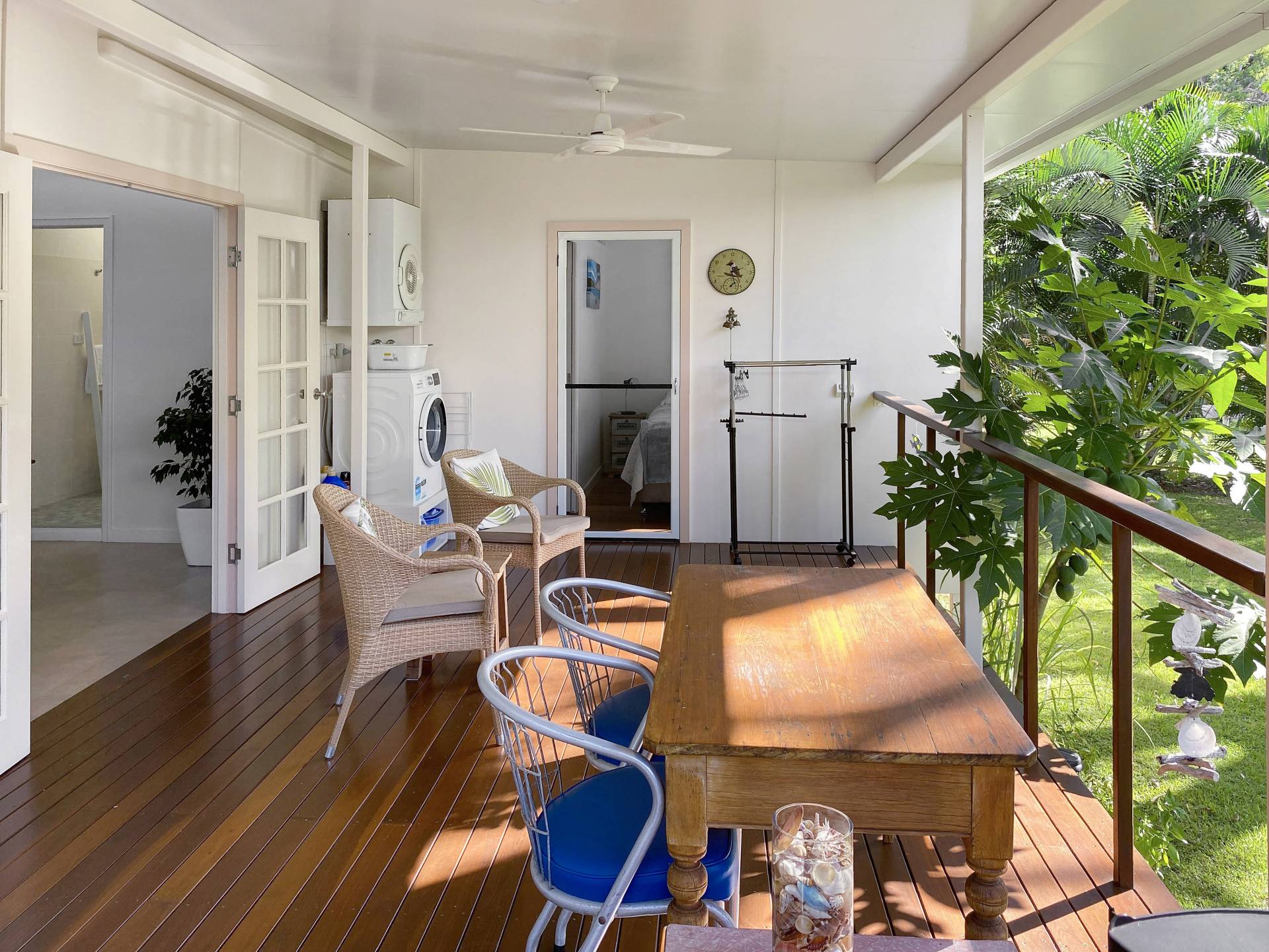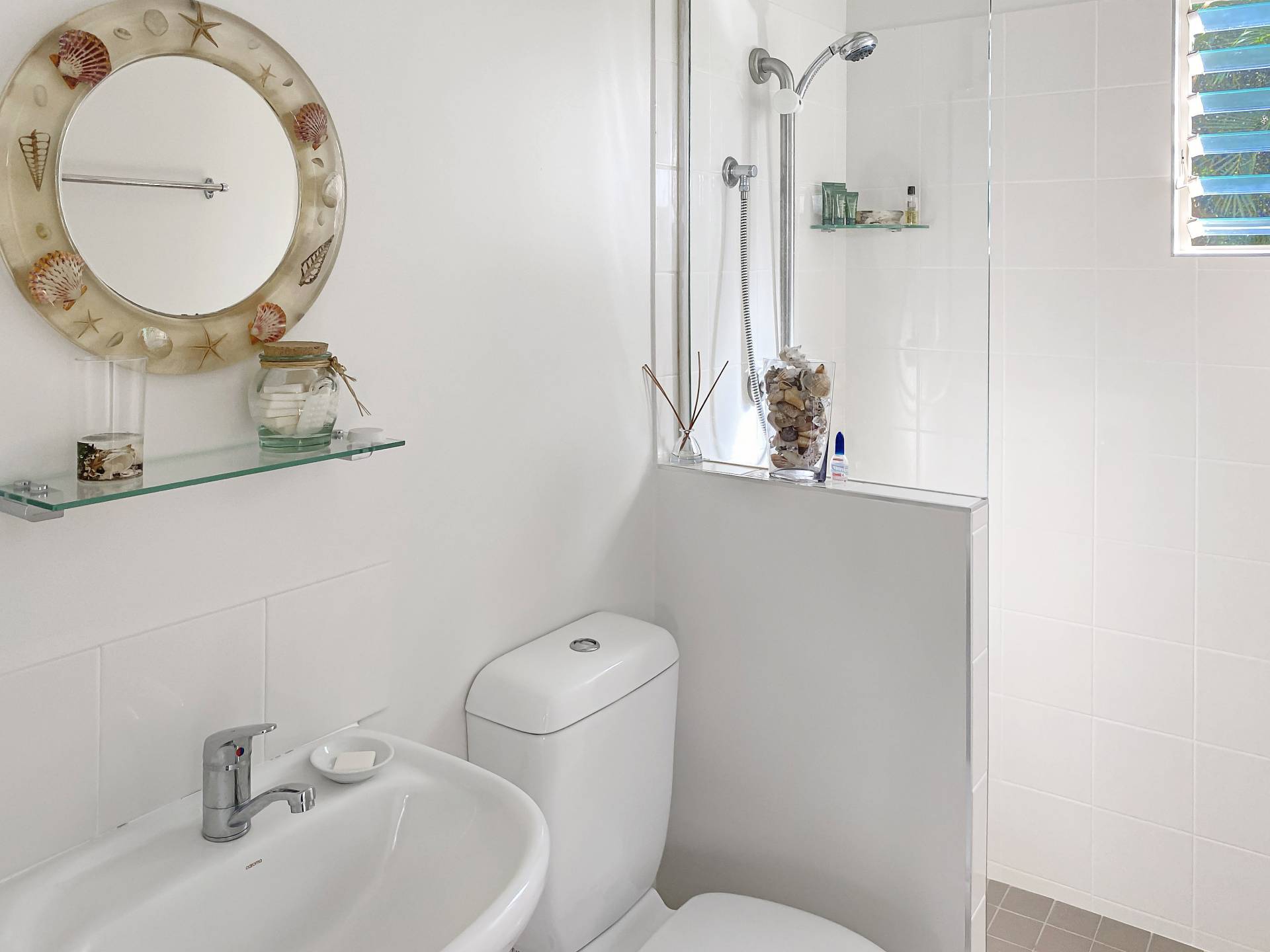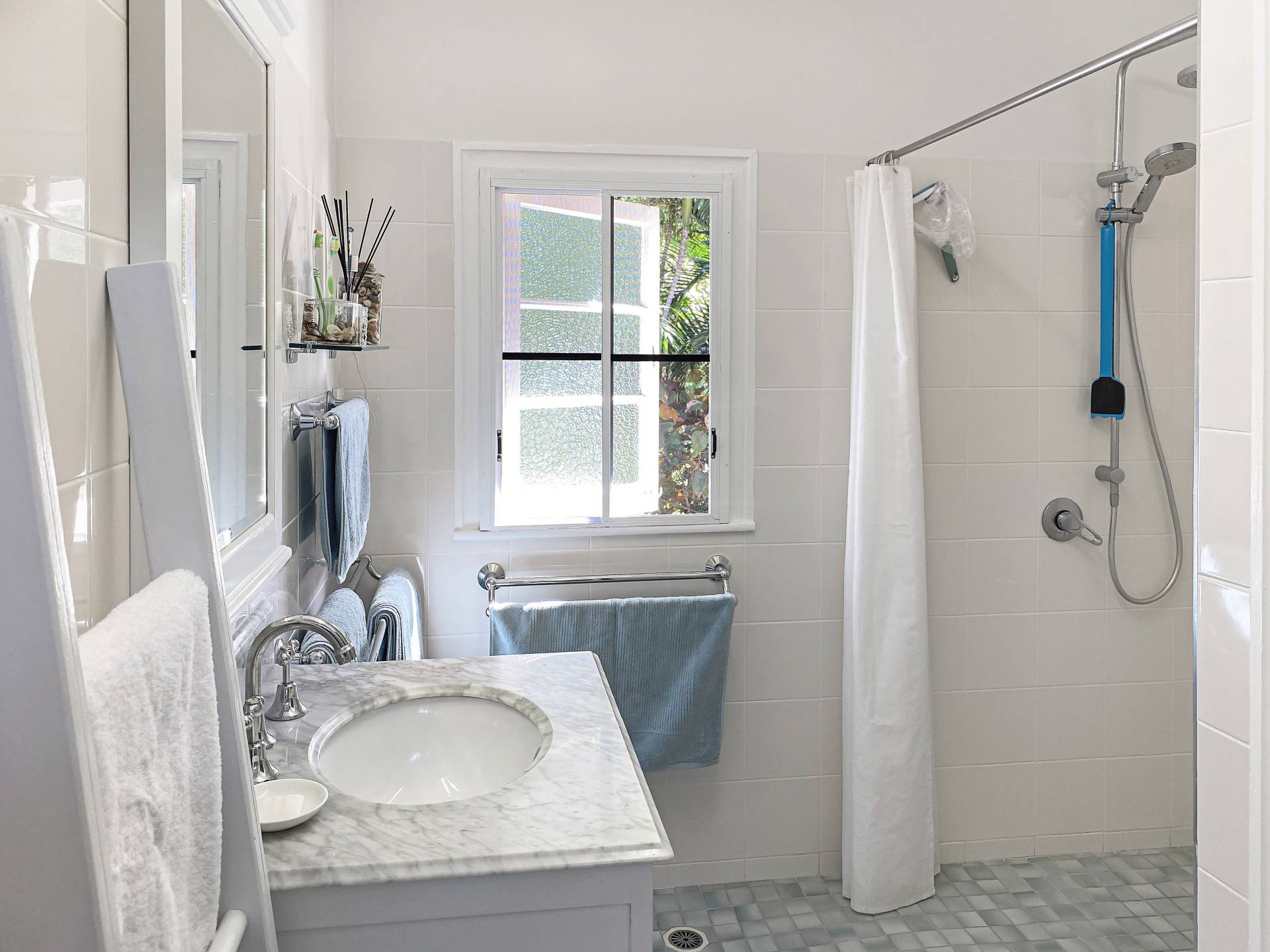 The main bathroom features walk-in shower, stone-top vanity and semi-private WC, whilst an ensuite bathroom, also with shower, vanity & WC is part of a recent extension to add a 3rd bedroom, ideal for guests, with separate entry off the also new covered back deck.
