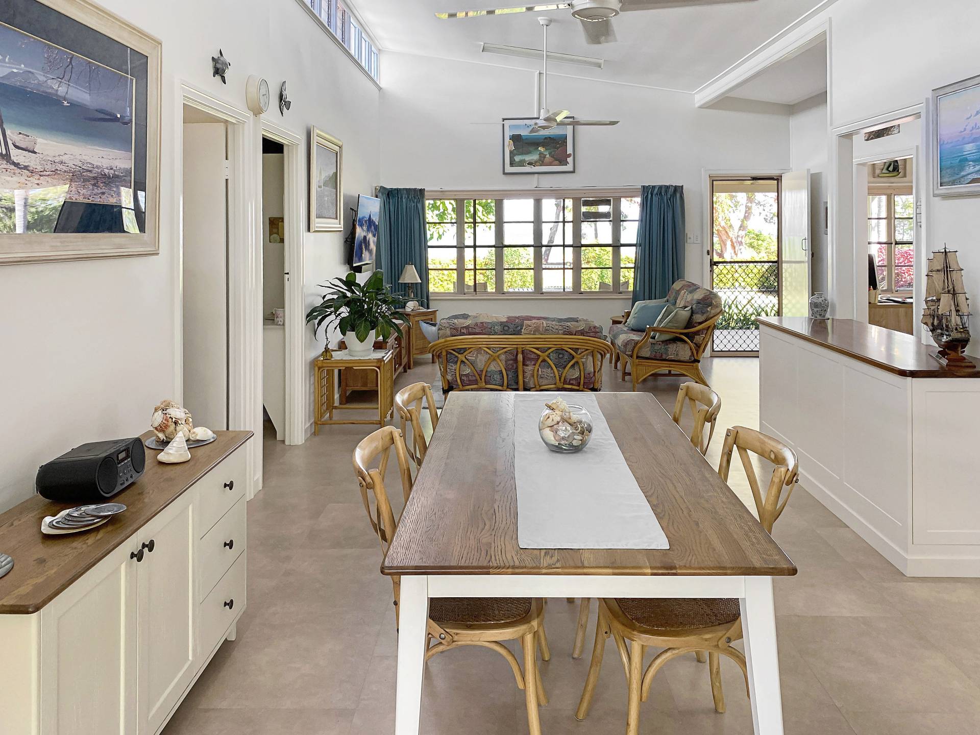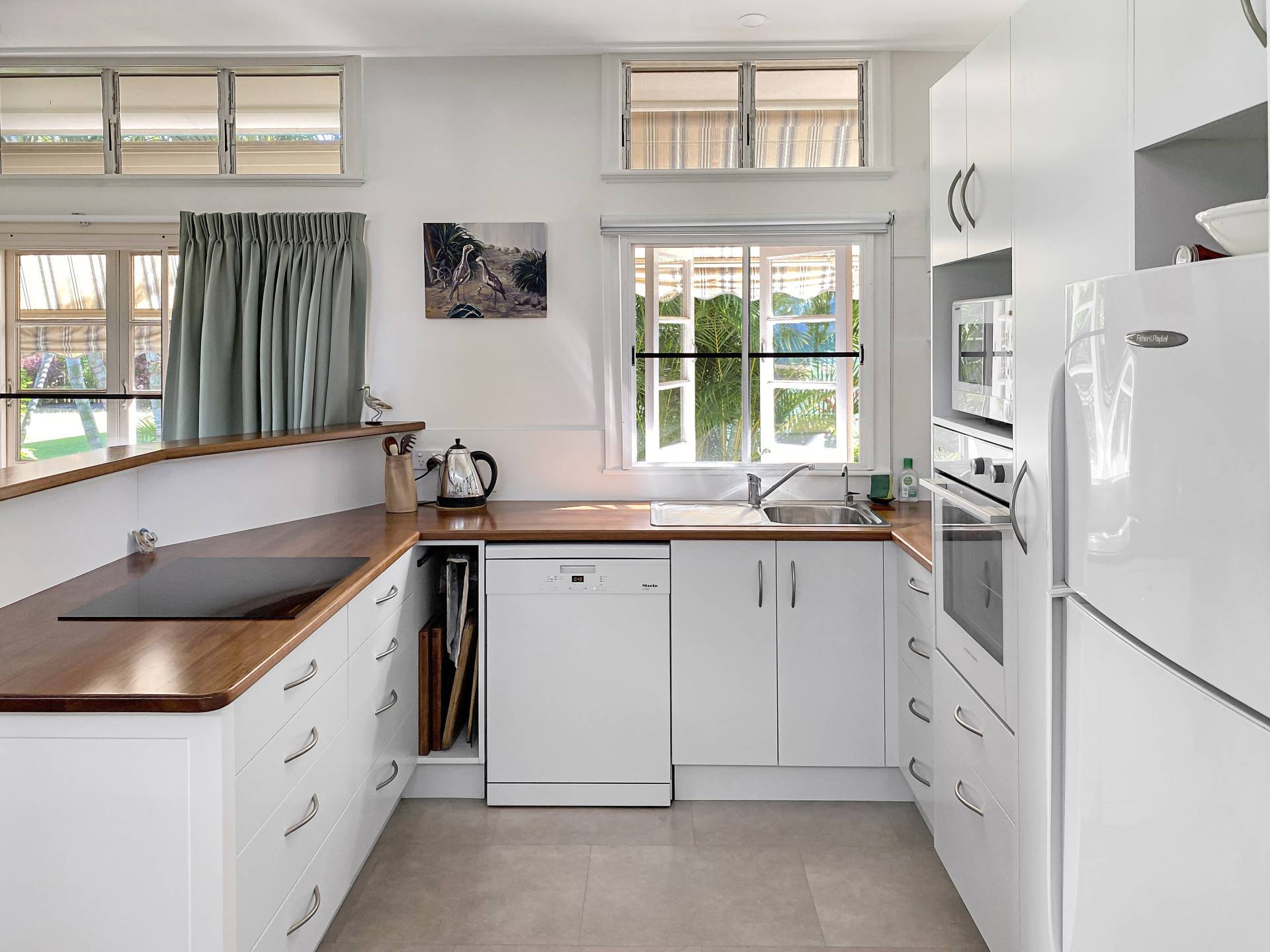 On entering the living area, the feeling of light and air abounds, with raked ceilings complemented by high louvres, and the classic casement windows showcasing the water views to the front, while timber french doors open up across the back for seamless flow from indoor to outdoor living.