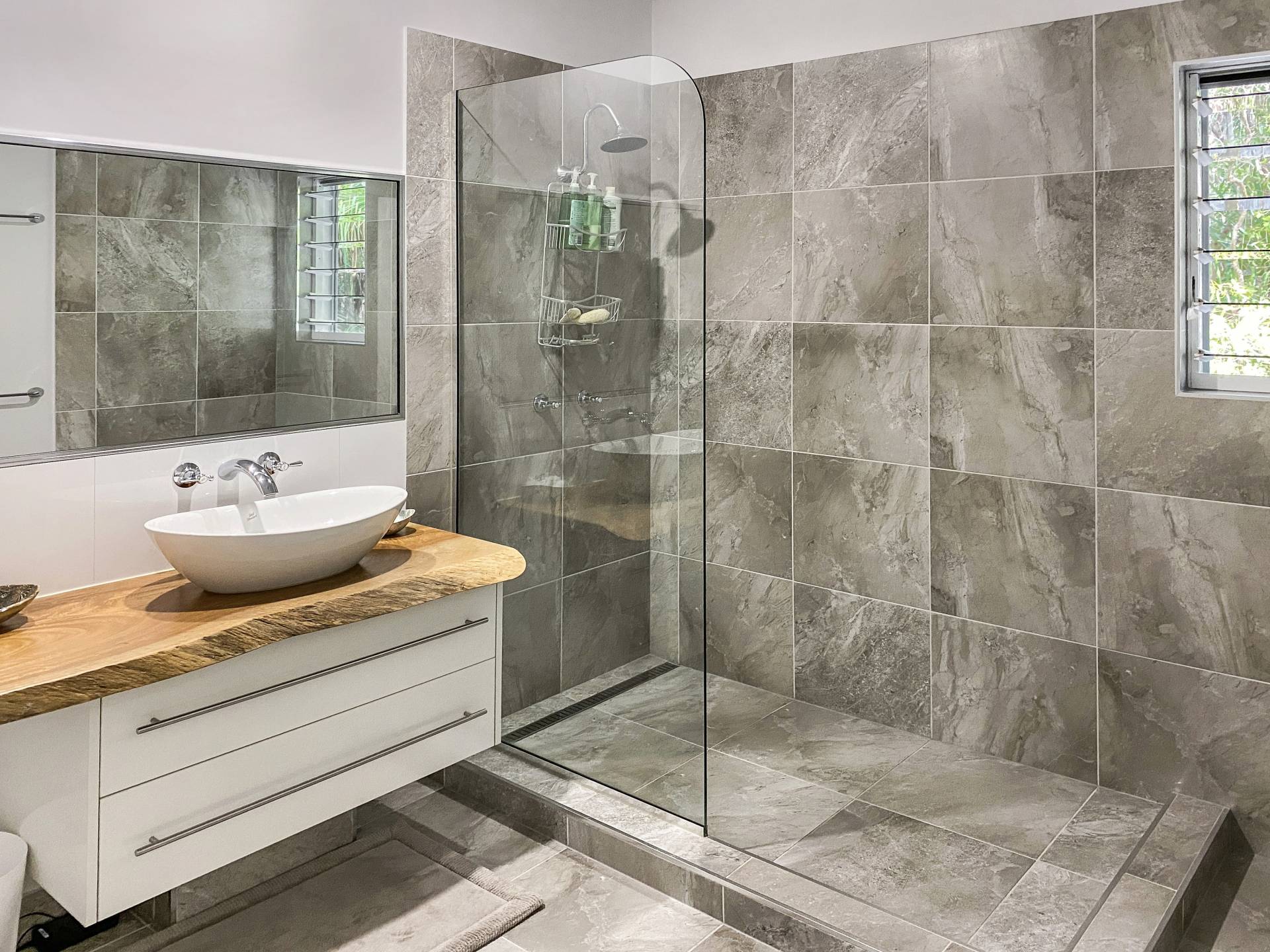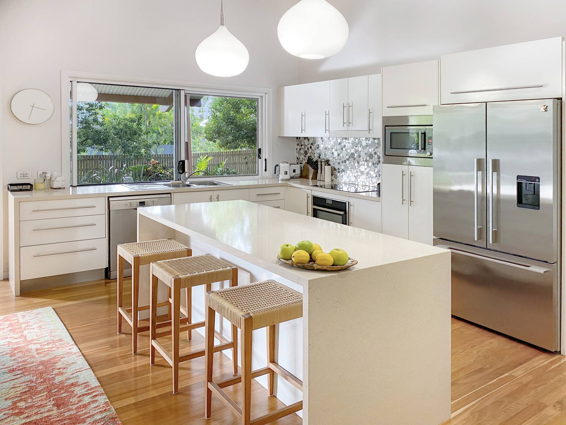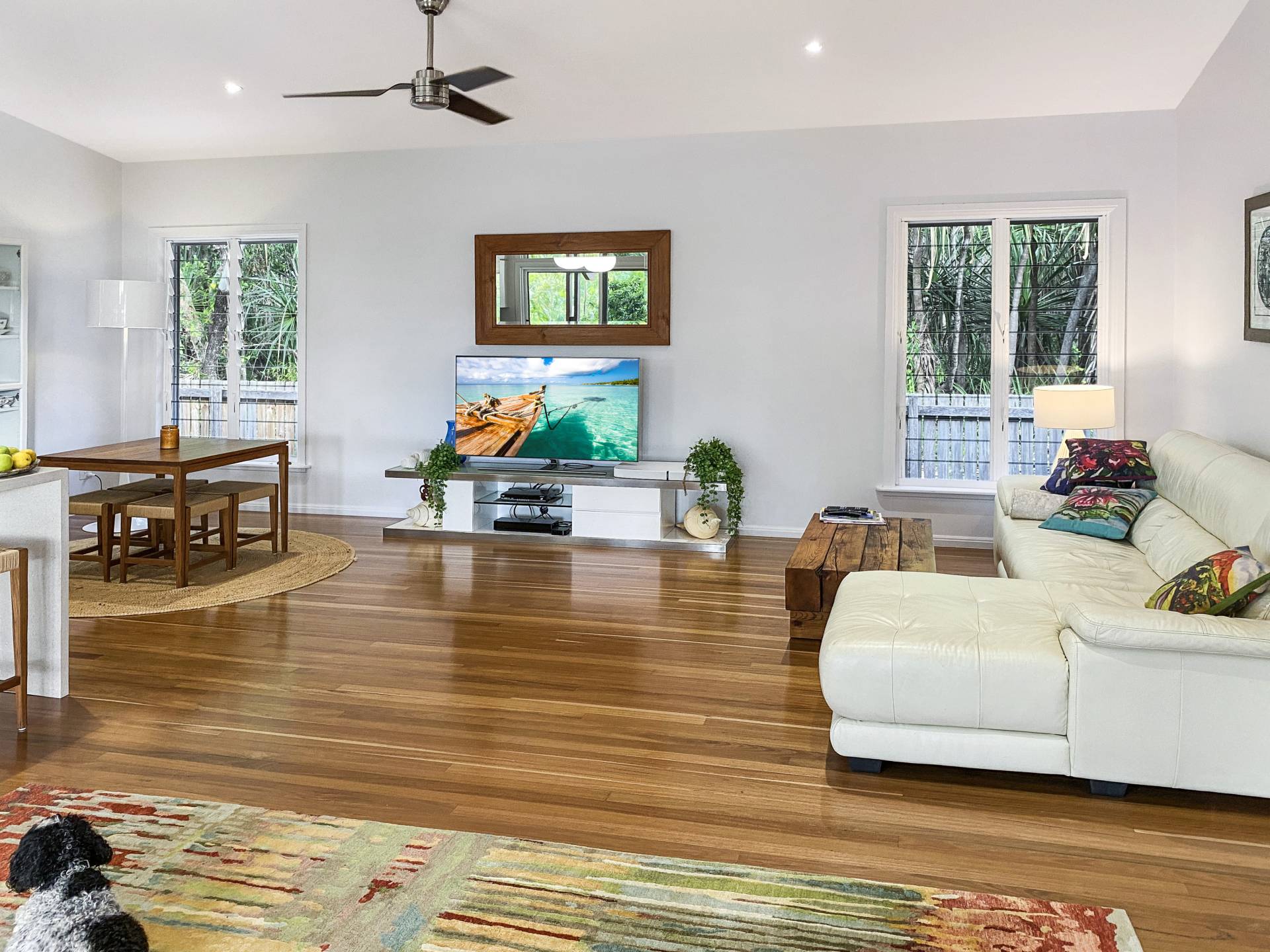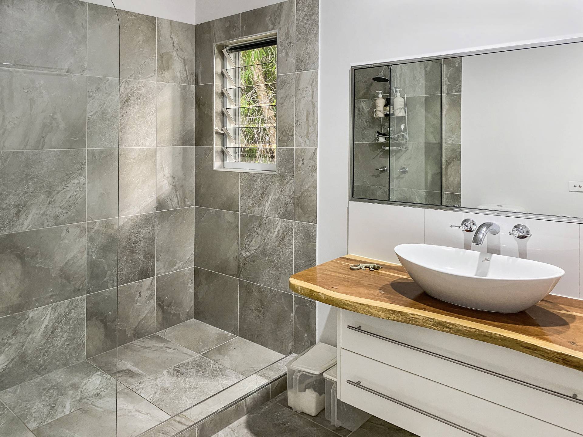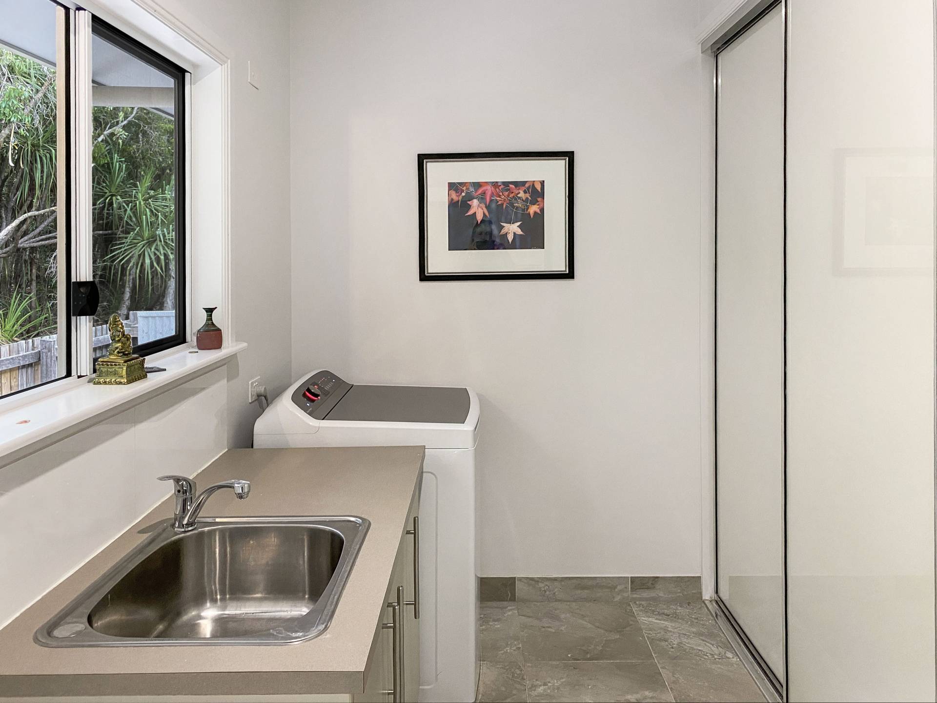 The family bathroom features walk-in shower, mango wood vanity, towel press and separate toilet adjacent. The laundry has a large linen press and direct access to the back of the property where the washing line and efficient heat pump hot water system are located, as well as an outside shower.