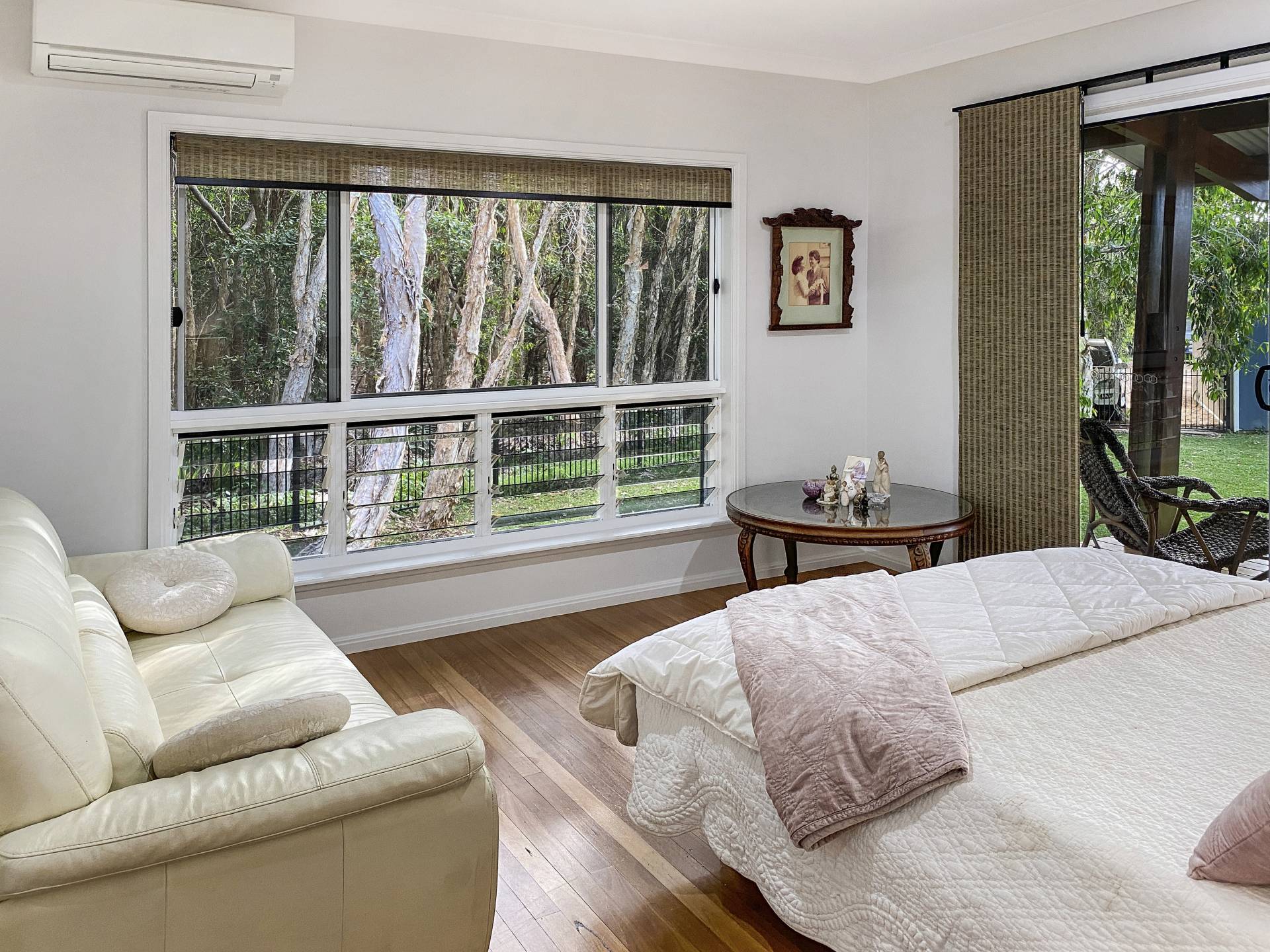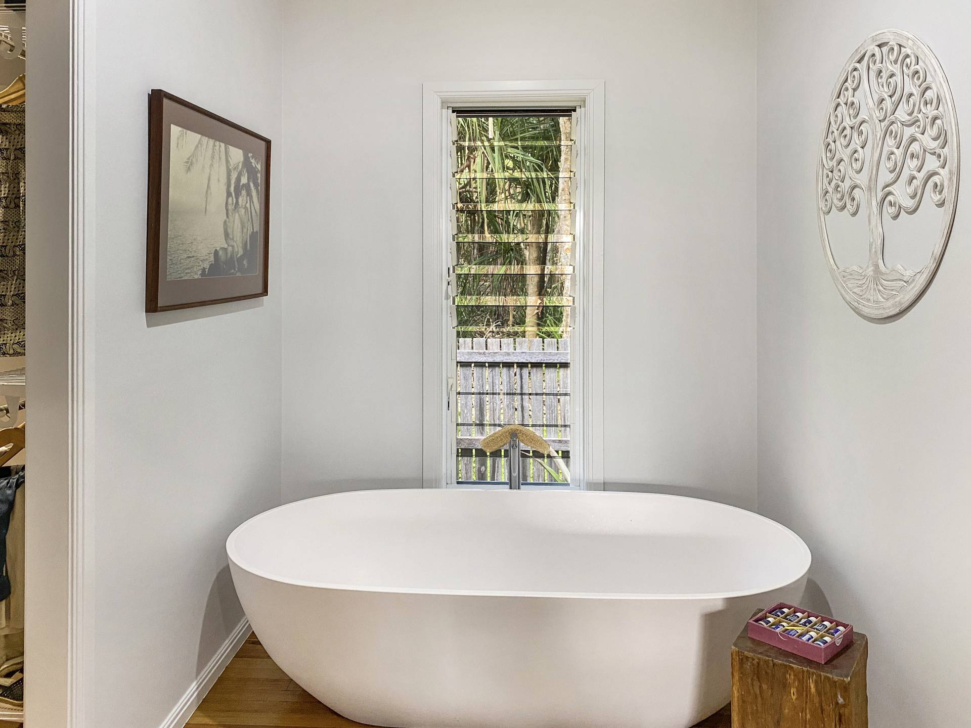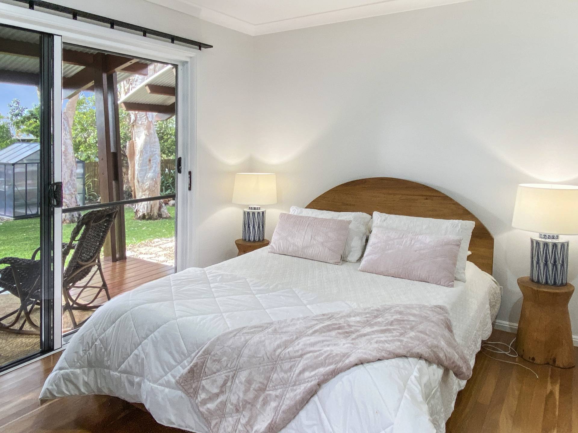 The air-conditioned master bedroom opens onto its own covered front deck and you won't tire of waking to the views of the parkland behind from the hand-made hardwood bed custom-made to complement the home. The ensuite bathroom features a large walk-in shower, stylish mango wood vanity and a bath that bath-lovers will love!