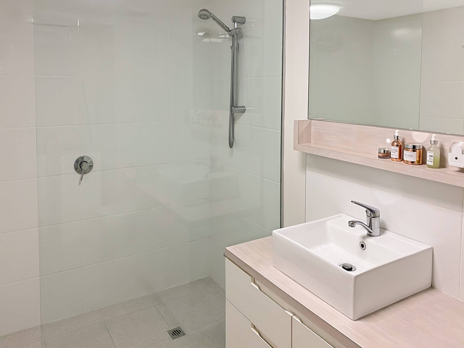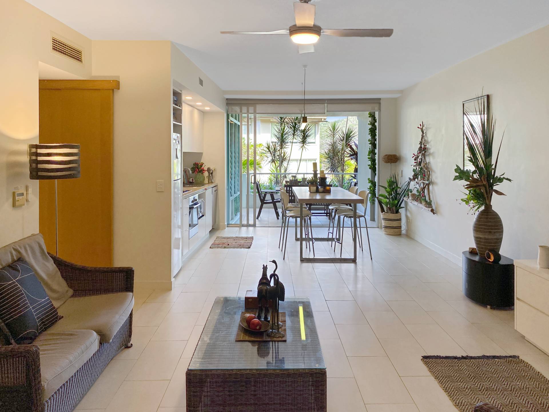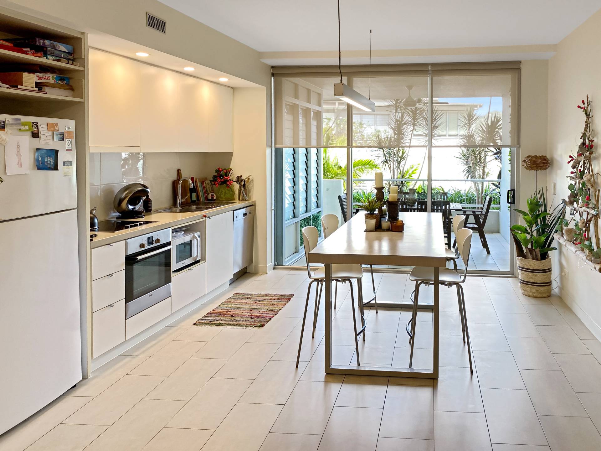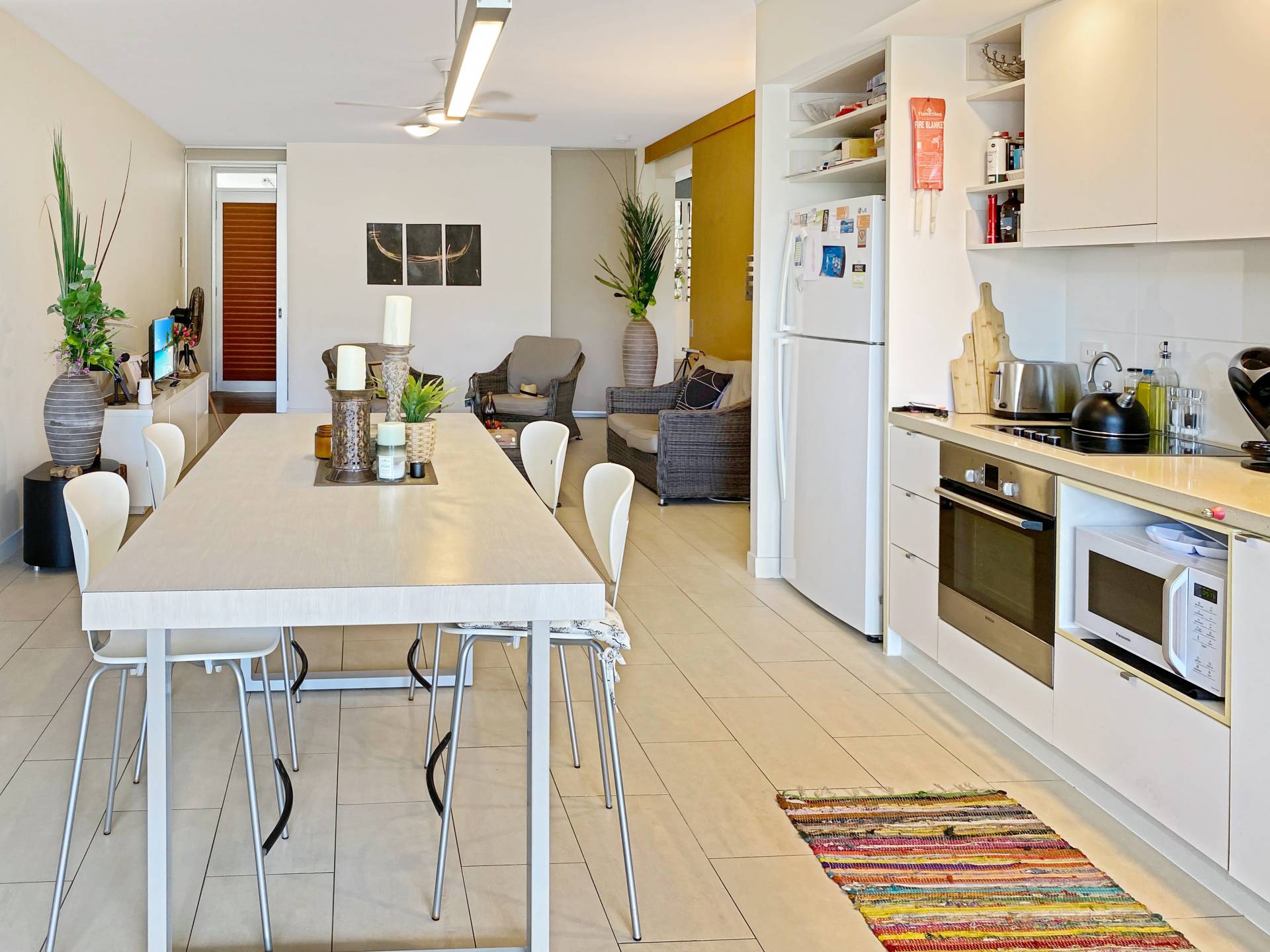 * Open-plan living, kitchen and dining area that opens onto the balcony through floor to ceiling glass doors