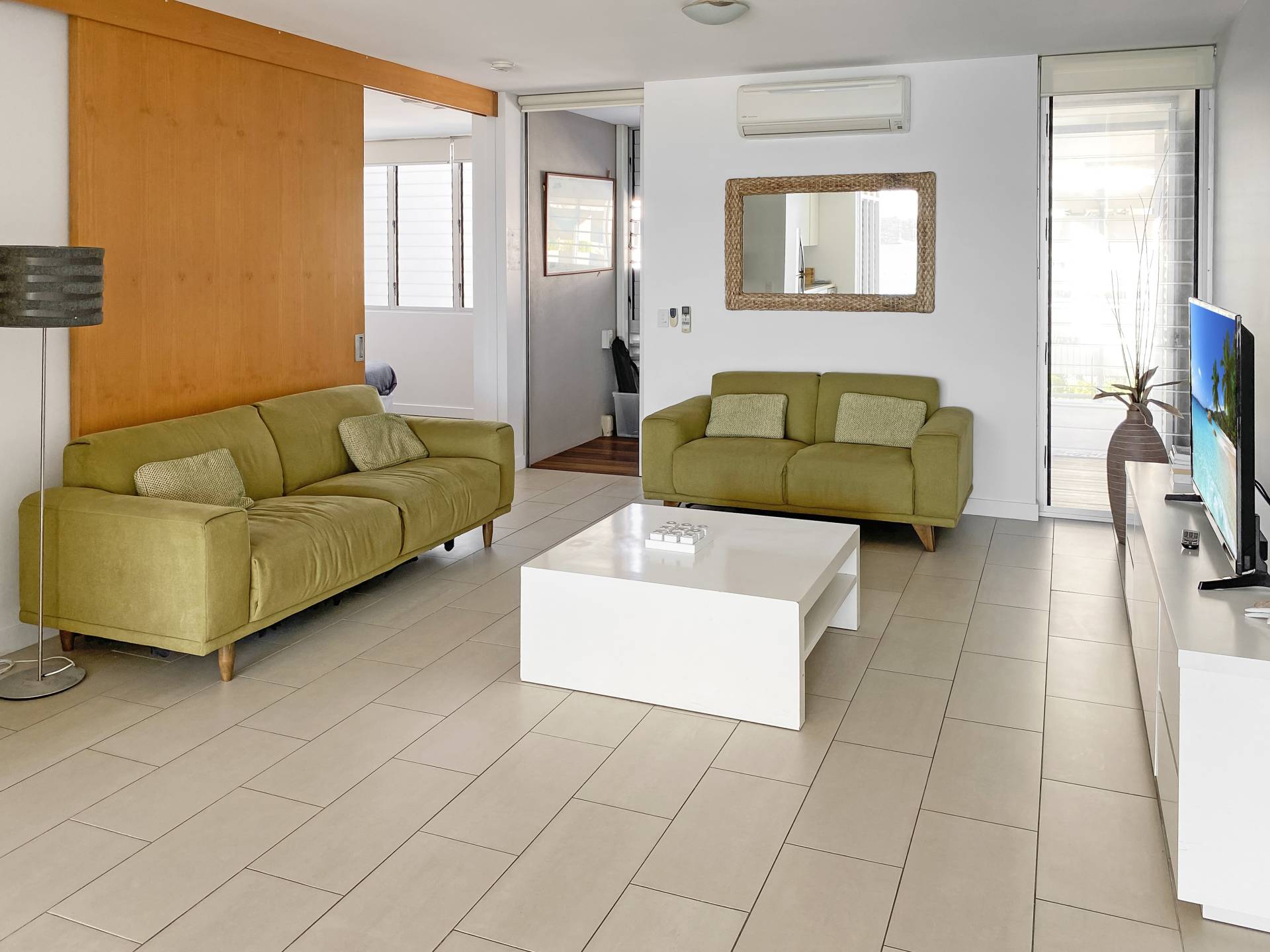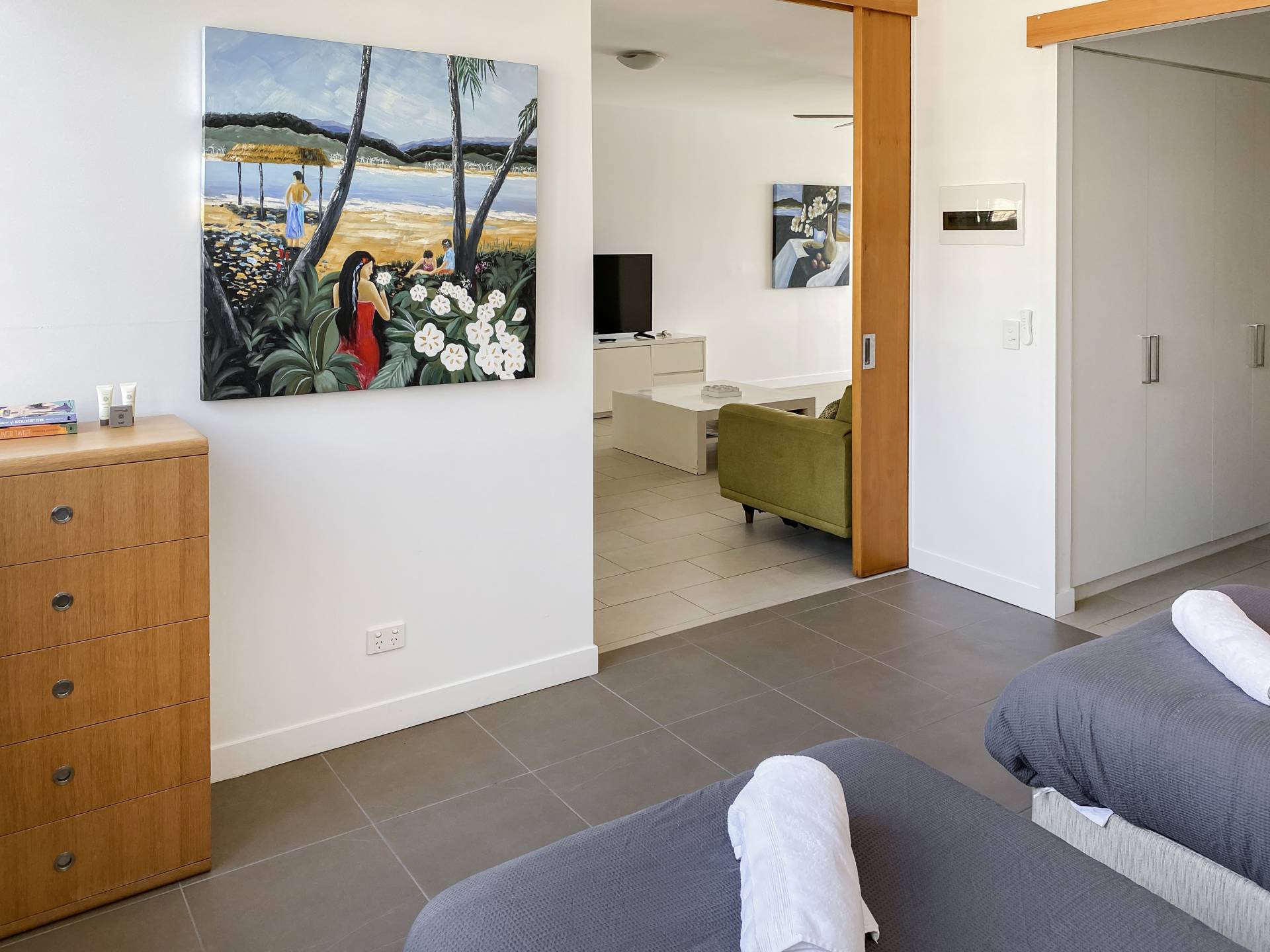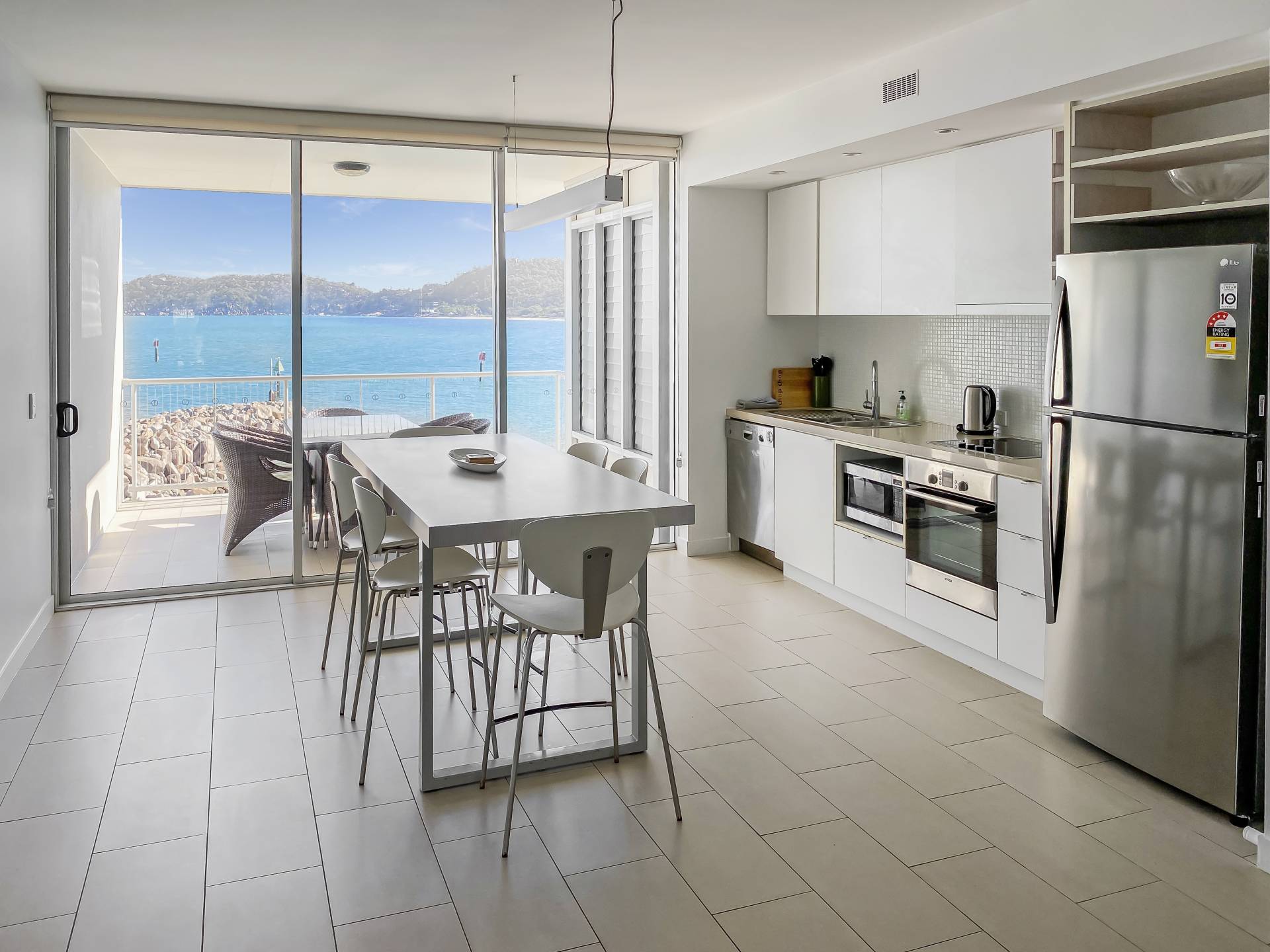 Enter into the 'beach room' and you immediately see straight through the glass louvres to the view ahead. The open-plan living area is spacious, bright and captures gentle sea breezes with excellent cross-ventilation and is pleasant whatever the weather with ceiling fans and split system aircon. The living extends through the galley style kitchen and out onto the covered balcony where you'll likely spend a lot of time, gazing out at the ever-changing view.