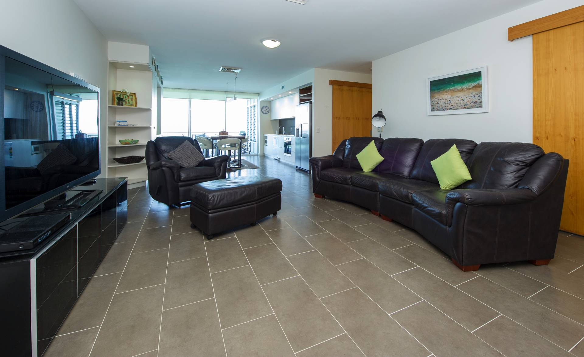 The moment you step through the front door into the open-plan living area, your eyes are drawn straight through to the view through the full width floor-to-ceiling glass doors at the far end opening onto the balcony. This apartment is offered fully furnished including the quality leather lounge suite and large TV in the living room which flows straight into the kitchen/dining area.