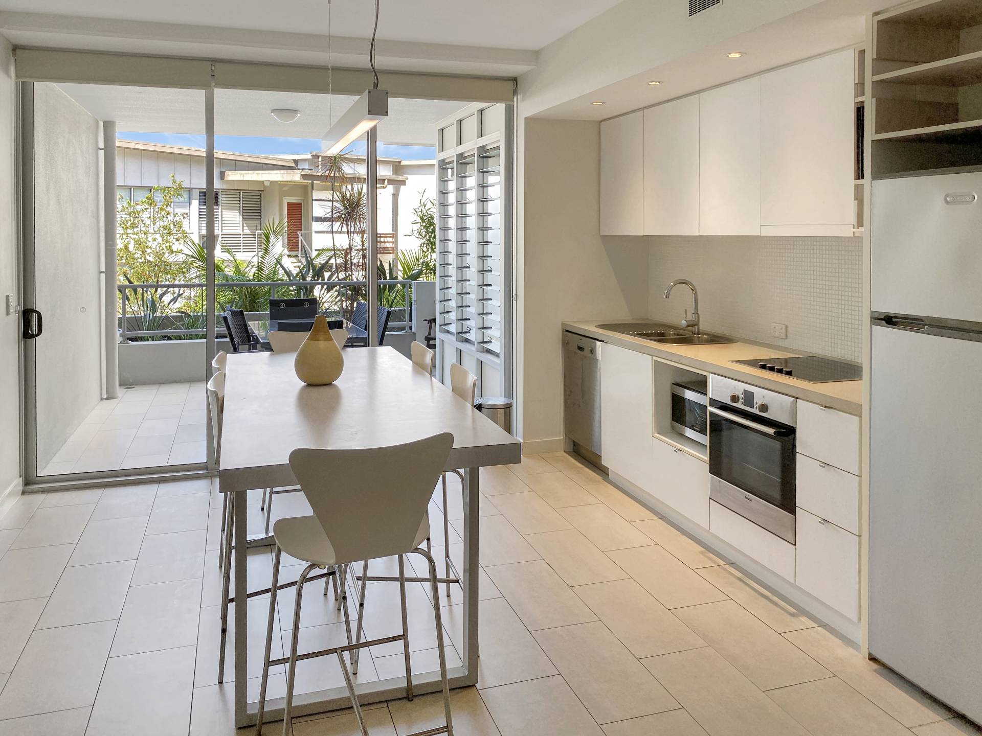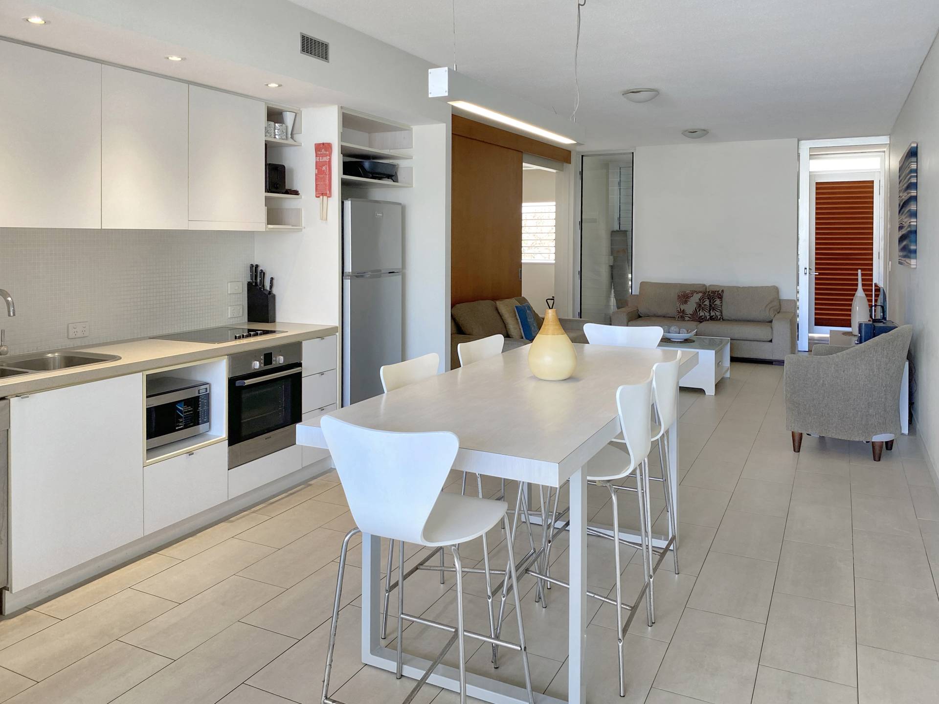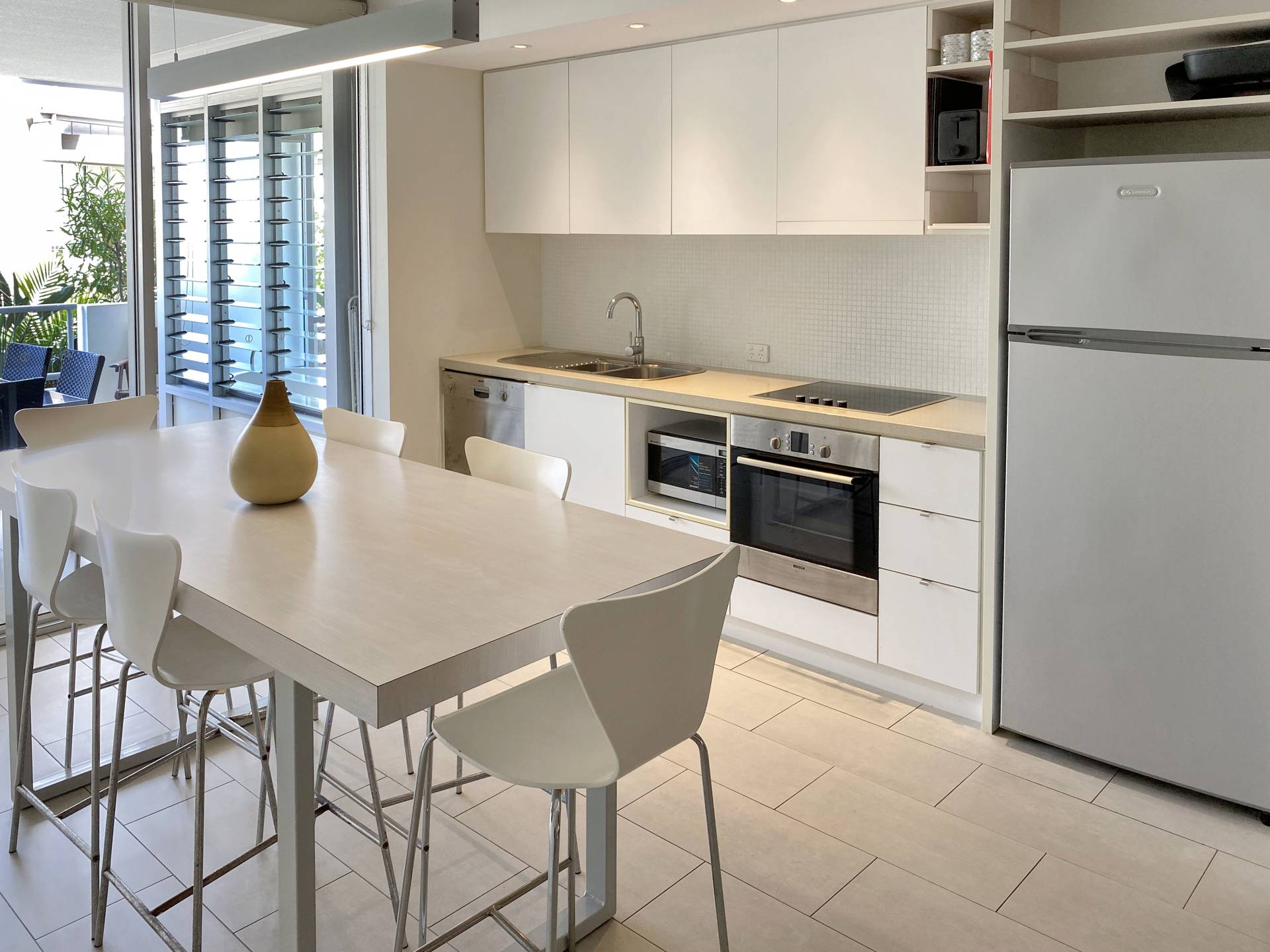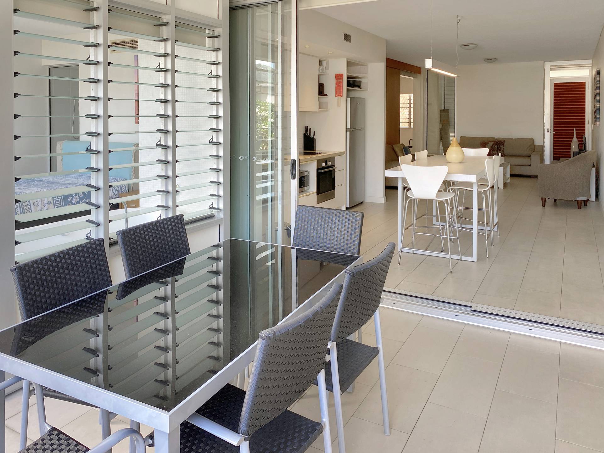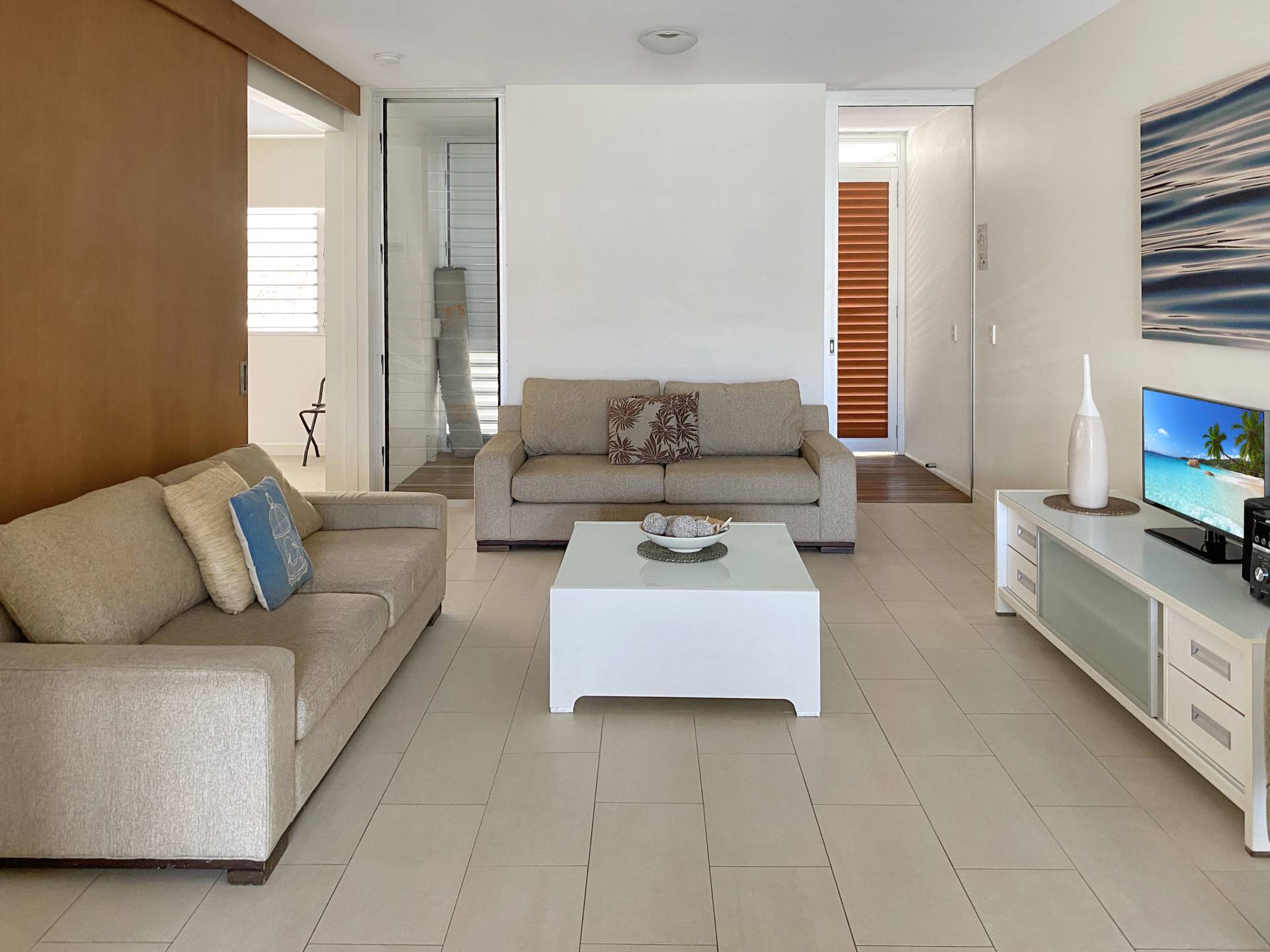 Entry is via the 'beach room', which is great for throwing your beach gear after a day out exploring the bays or for additional storage. Step into the open-plan living area with its floor to ceiling sliding glass doors opening onto the covered balcony, ideal for seamless indoor-outdoor living.