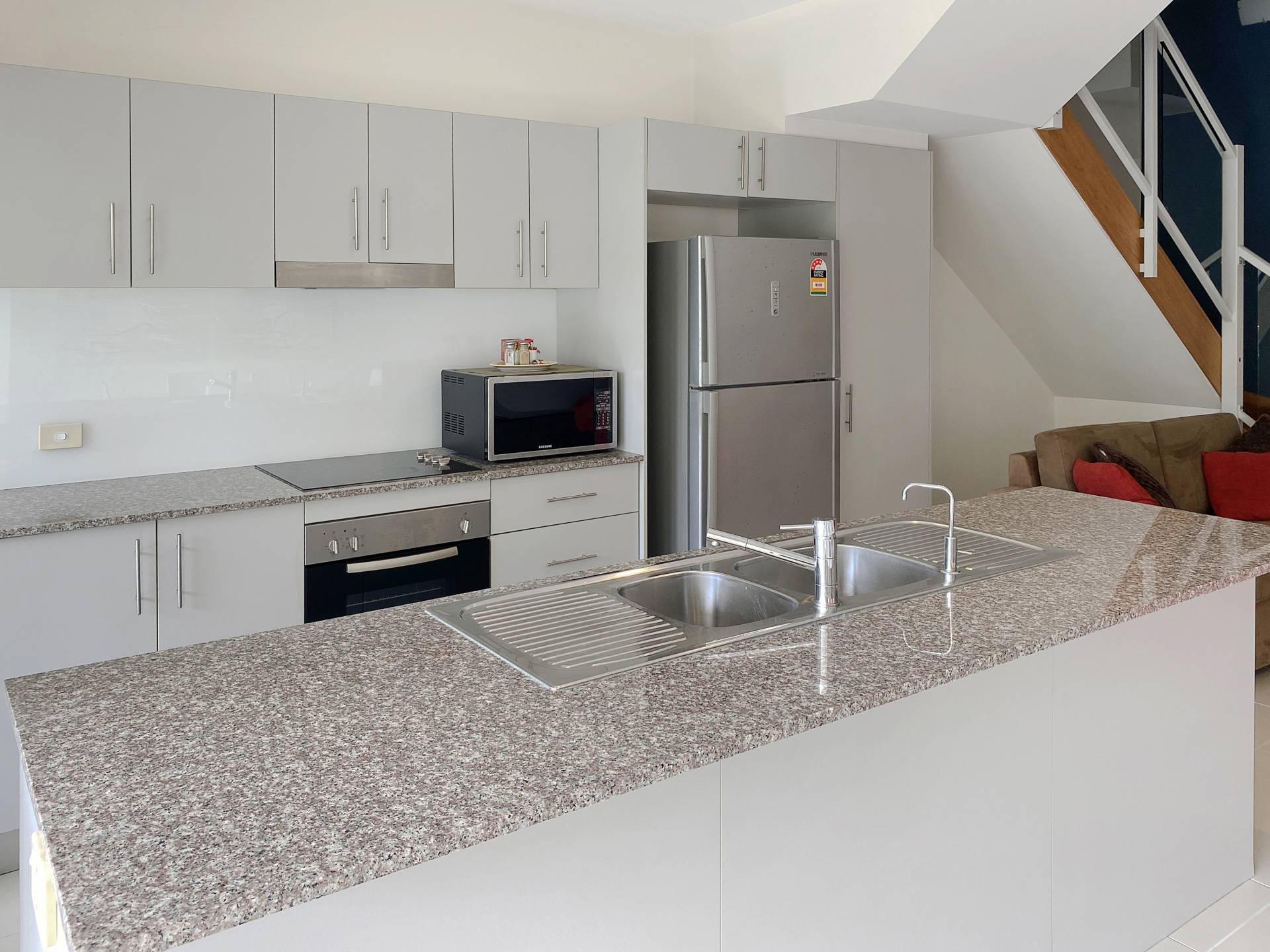 On entering the townhouse the open-plan living room flows through to the dining area, kitchen and out to the large covered balcony giving a lovely open feel. The modern kitchen features granite benchtops and plenty of cupboard and bench space and is designed to cater for indoor or outdoor entertaining. This level also has a large lockable store-cupboard, laundry and convenient toilet with hand-basin.