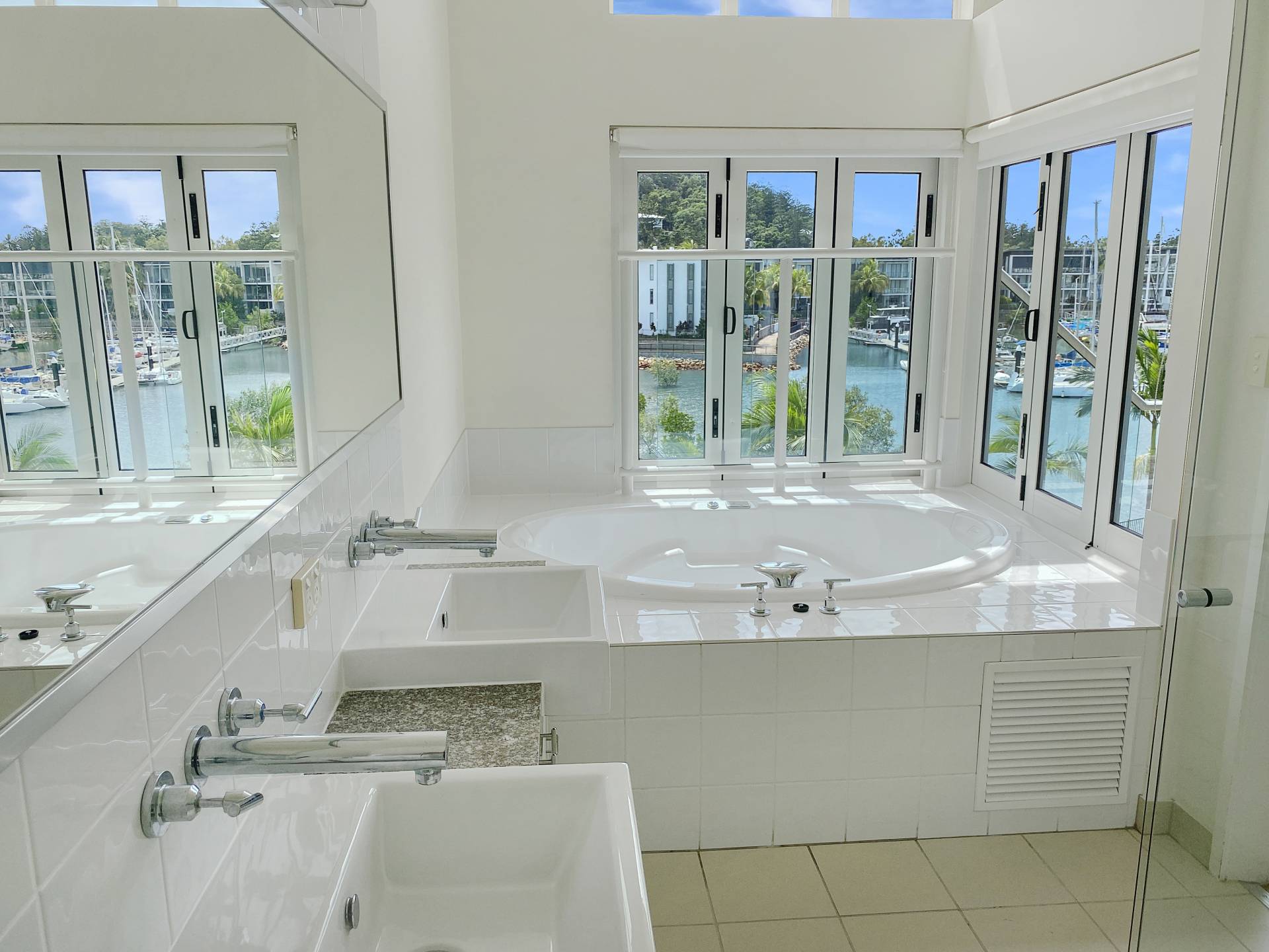 Upstairs, the spacious master bedroom opens onto a balcony with views over the marina and Coral Sea, and has a large walk-in wardrobe and ensuite bathroom with a luxurious spa bath, shower and his-and-hers vanities. There is plenty of room for everyone with two further bedrooms, both with built-in-wardrobes, with a bi-fold inter-connecting to make one larger second bedroom if preferred. The main bathroom features a bath tub, separate shower and vanity, with a separate toilet adjacent.