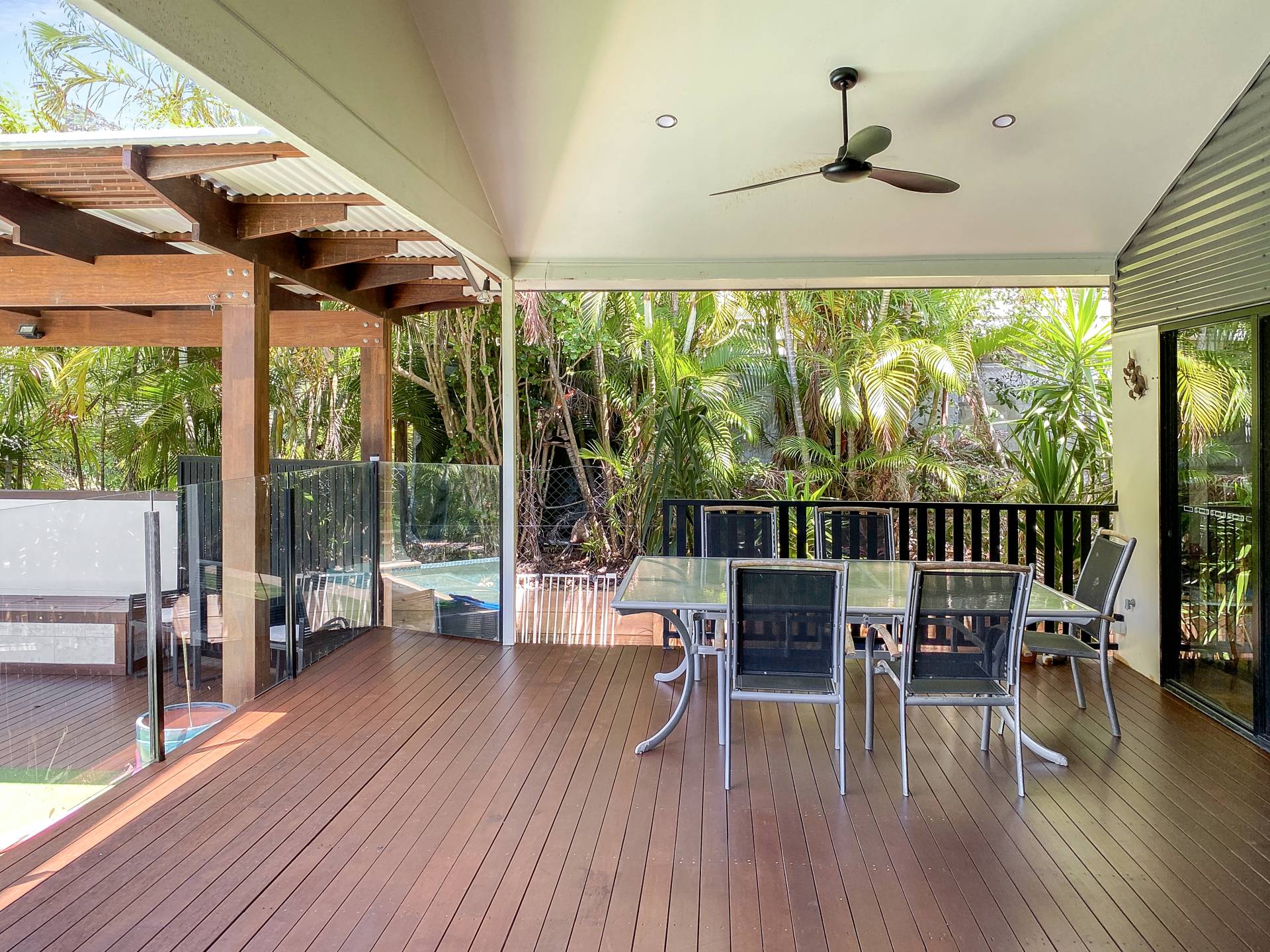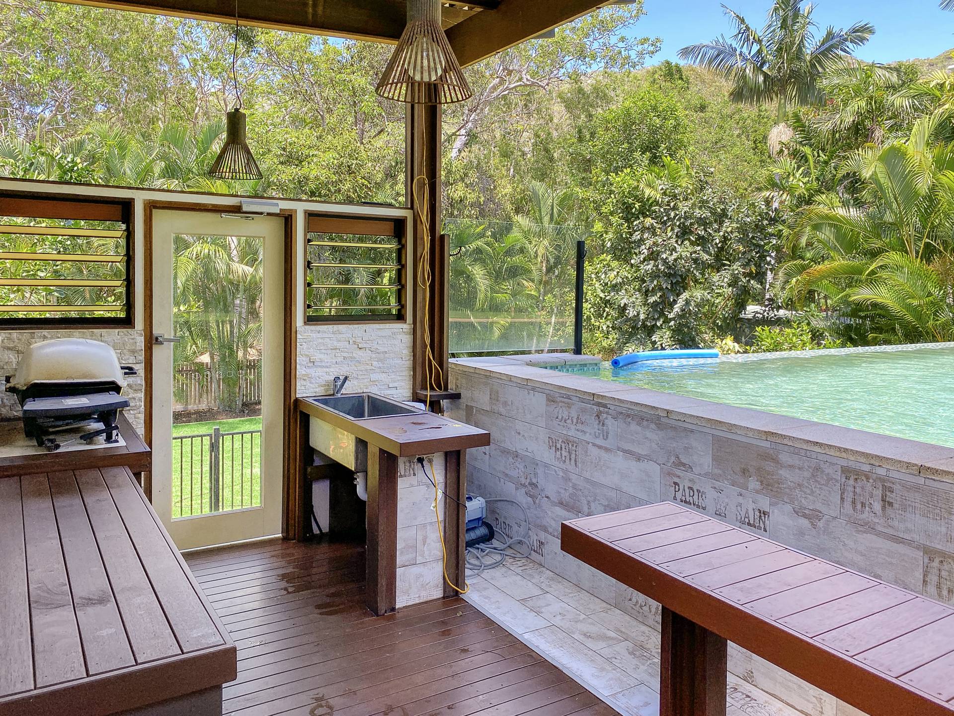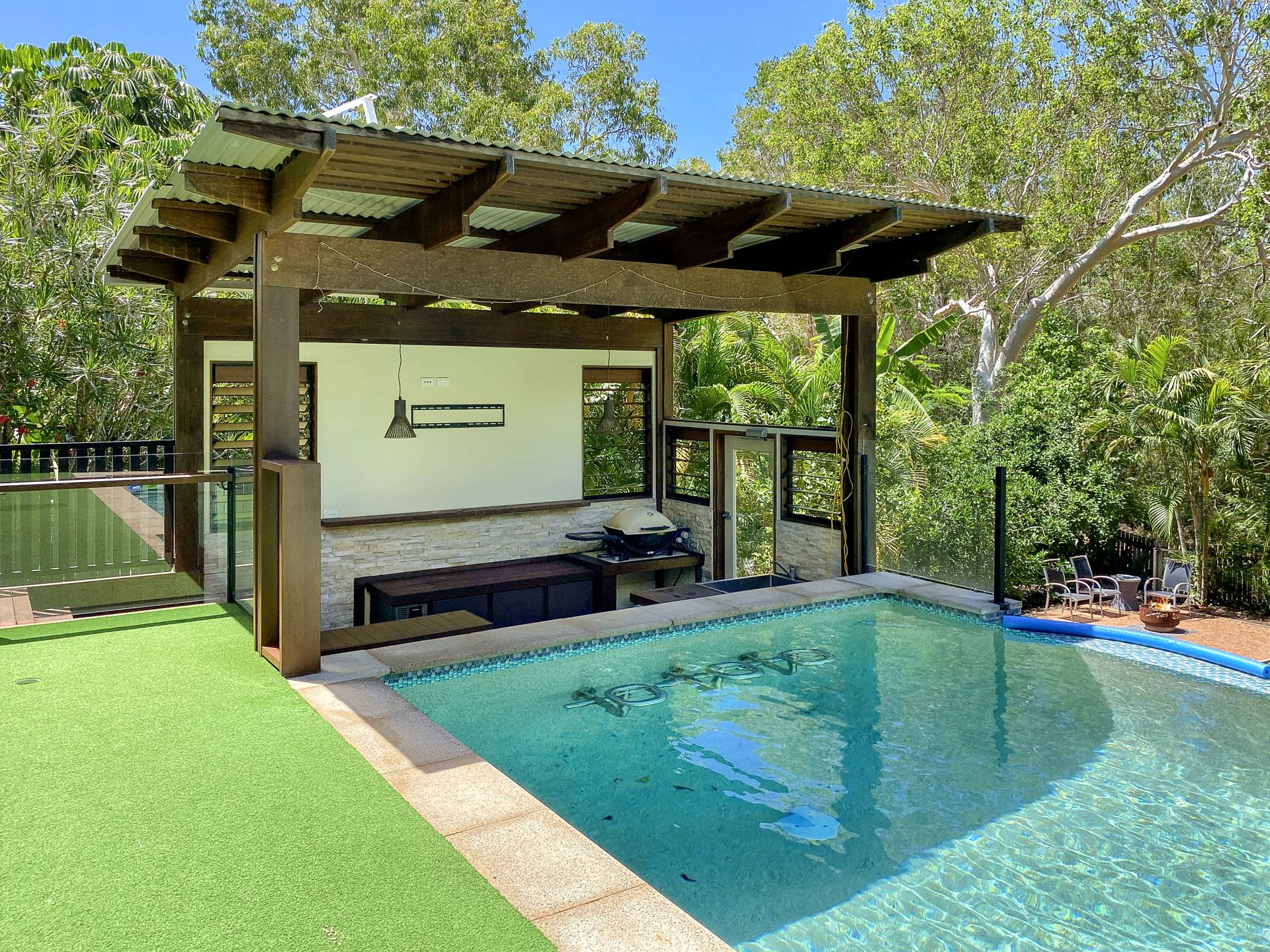 • Seamless indoor-outdoor living flow - the open-plan living area spills out onto the huge covered deck overlooking the pool