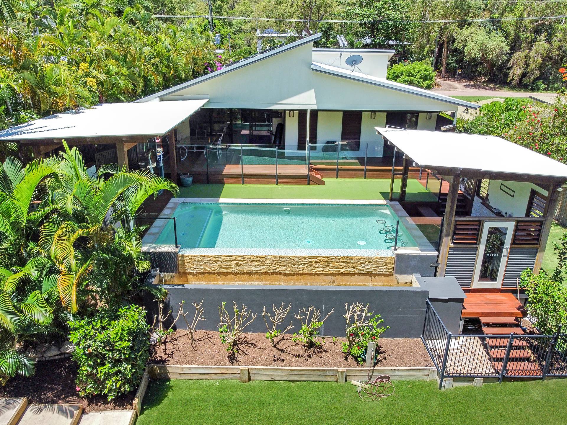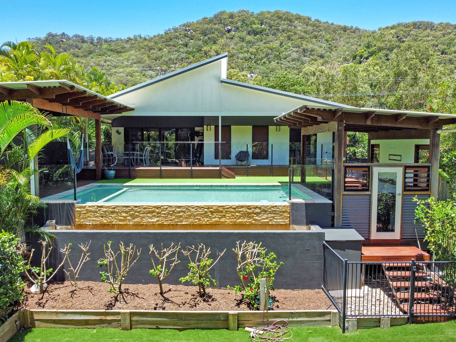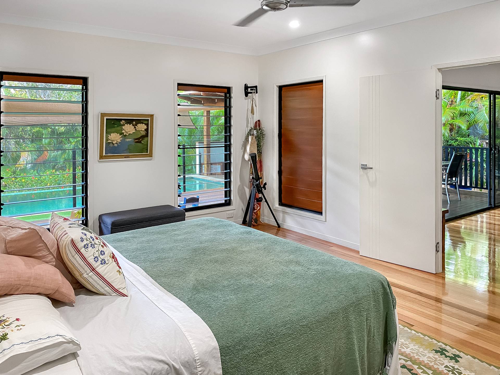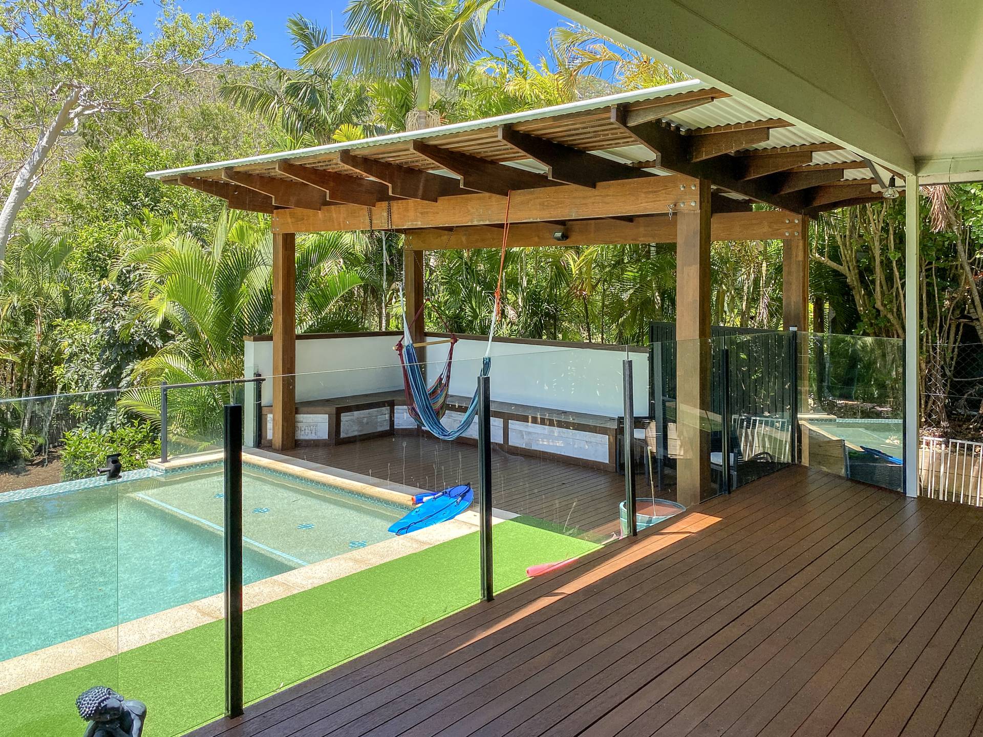 • Seamless indoor-outdoor living flow - the open-plan living area spills out onto the huge covered deck overlooking the pool