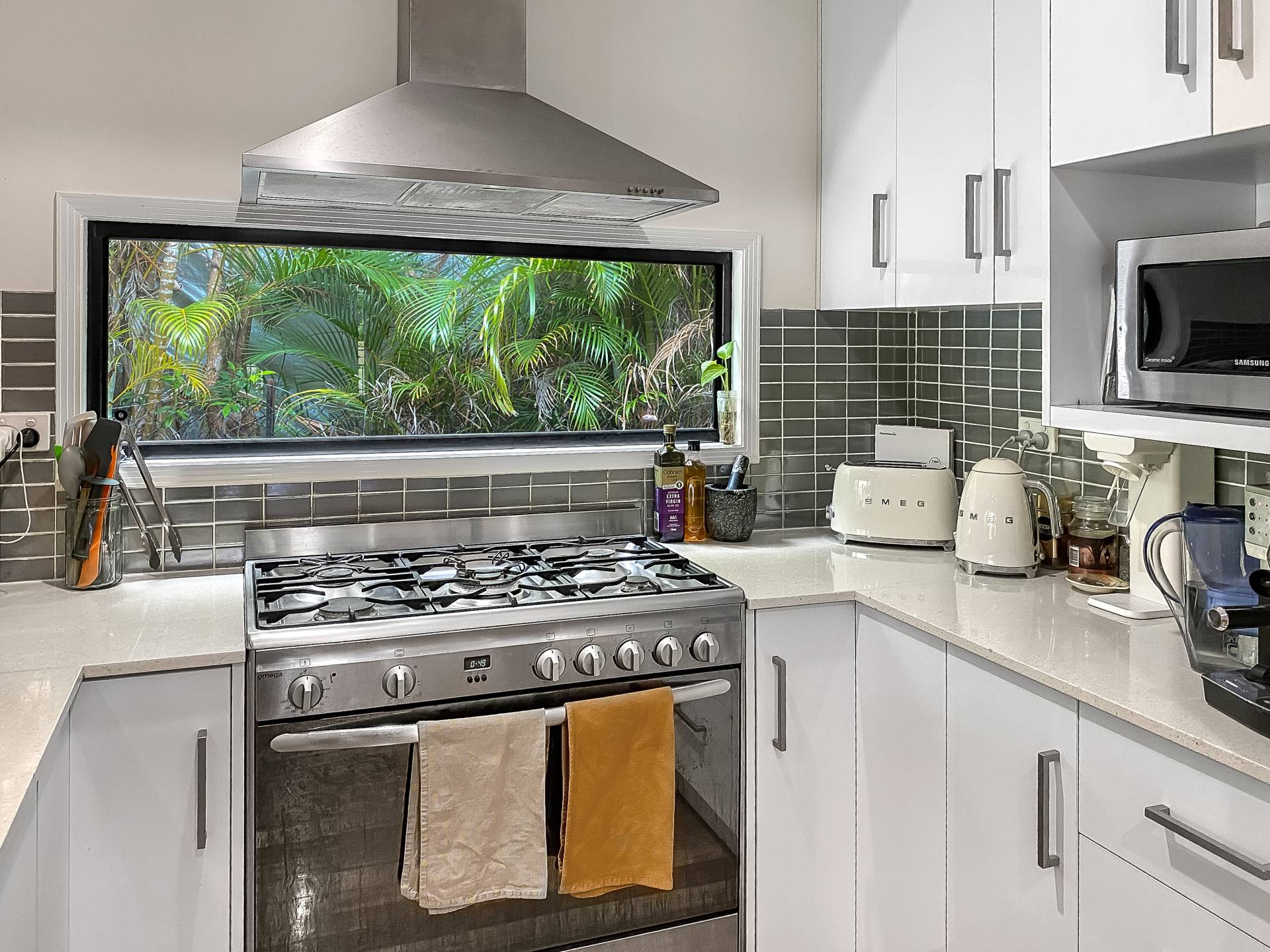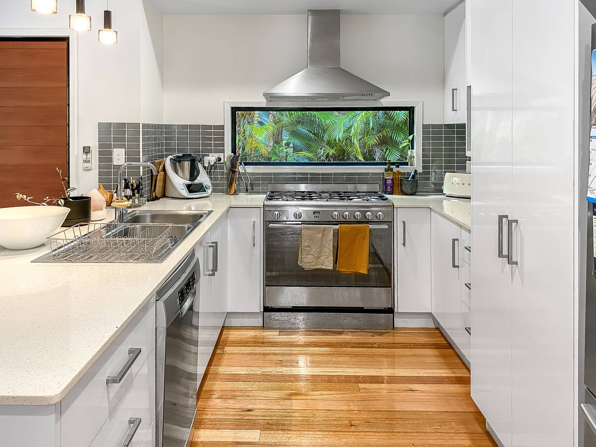 • Stylish modern kitchen with stone benchtops, breakfast bar, double sink, 900mm gas stove, dishwasher & lovely picture window, with great connection to all of the living areas