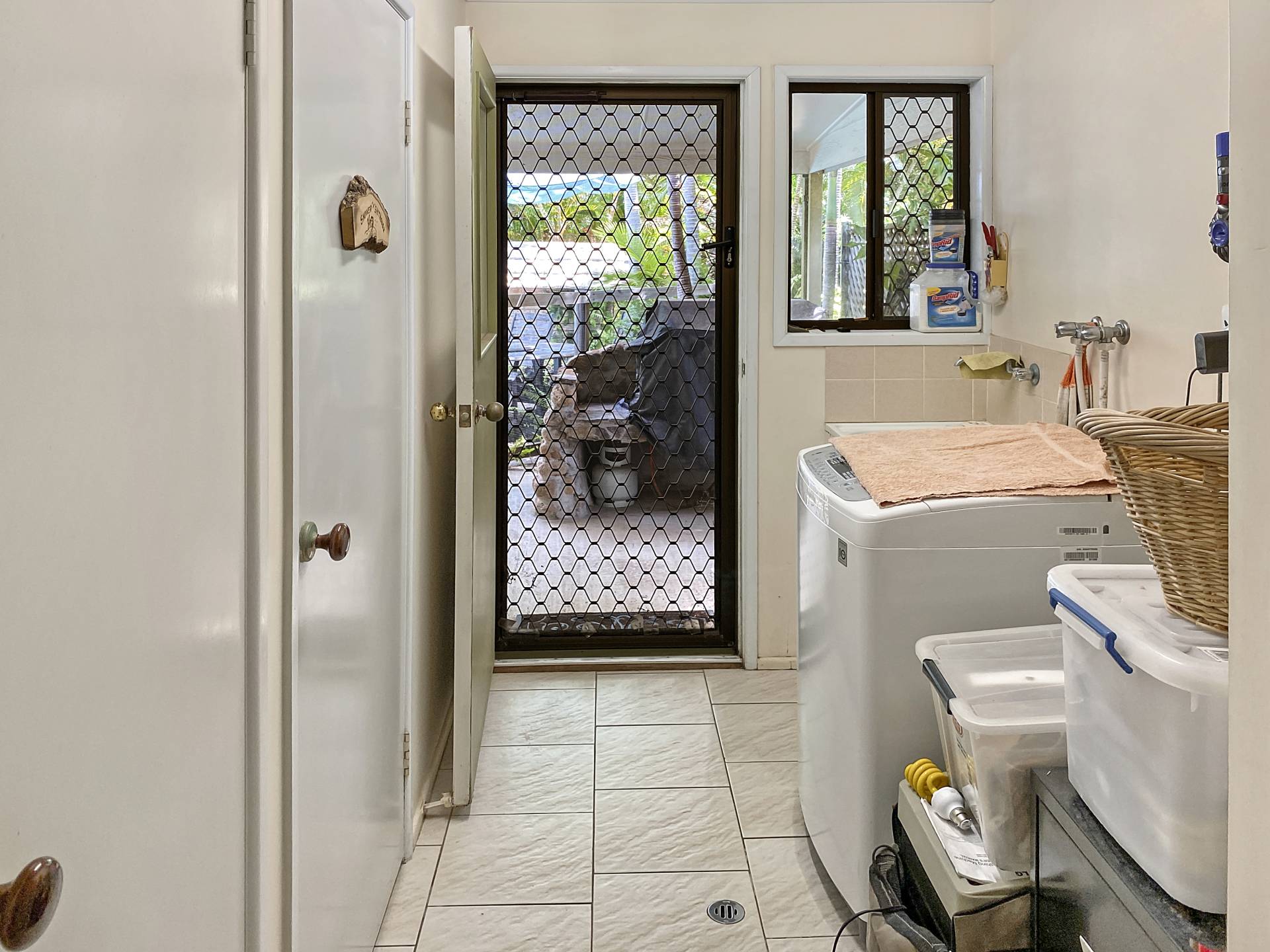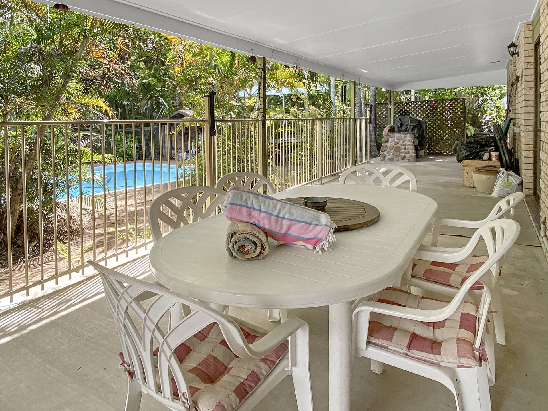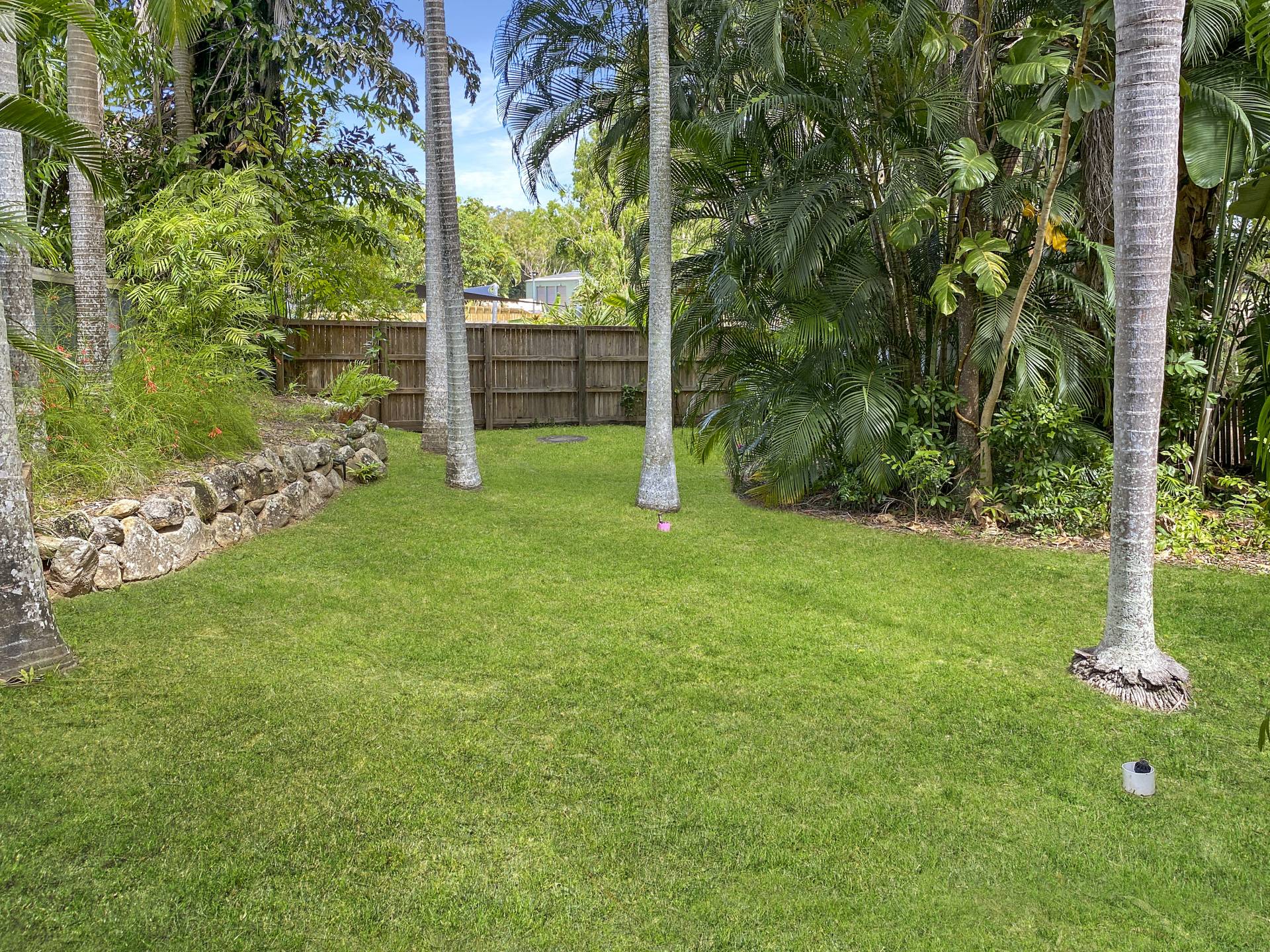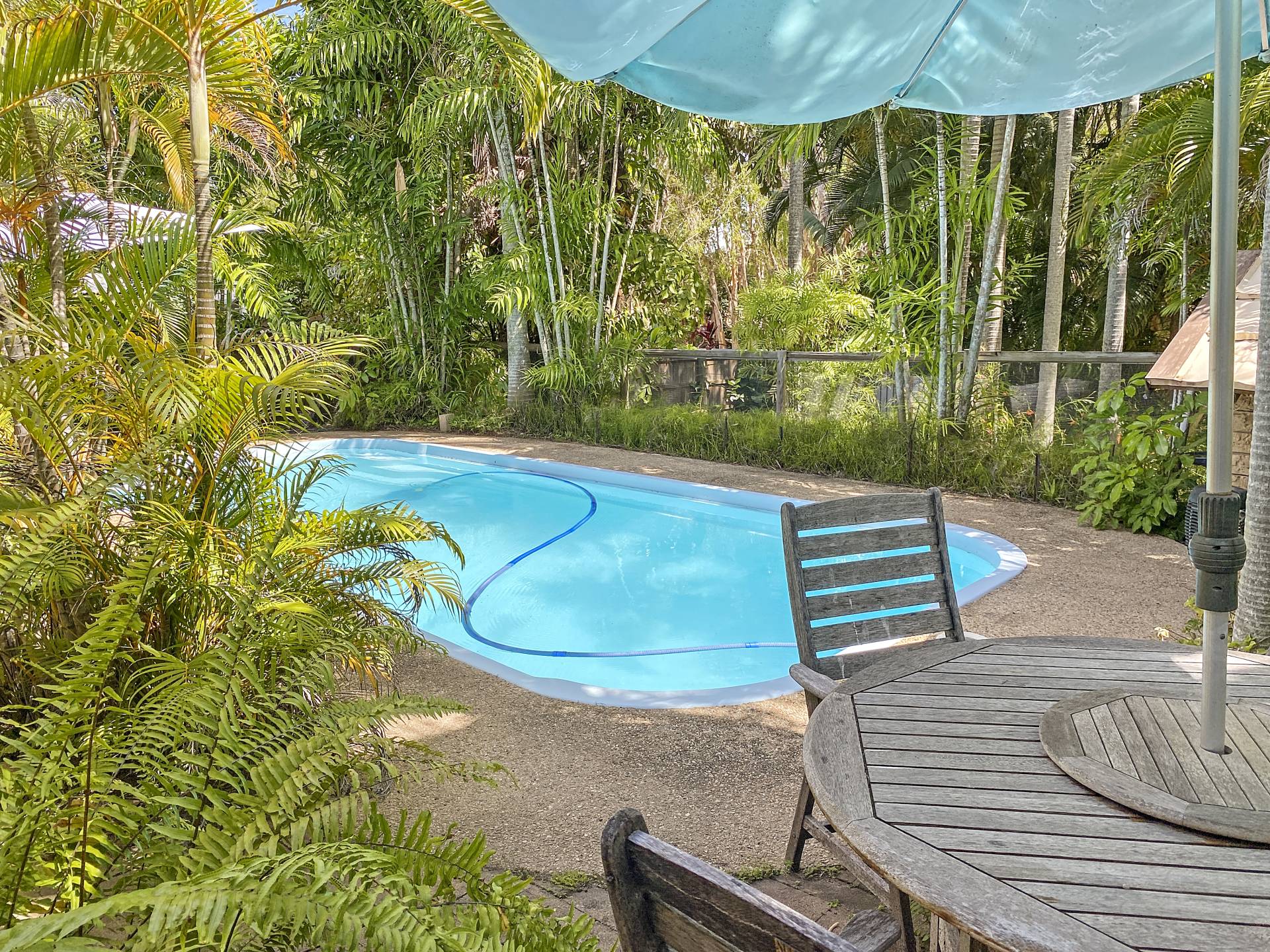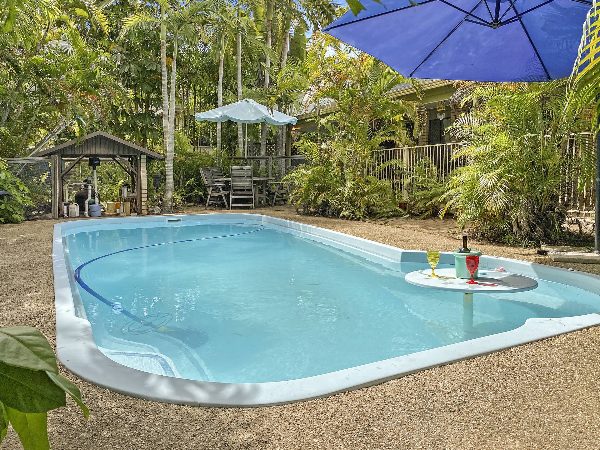 Nestled amongst the swaying palm trees, you will feel tucked away in your own private oasis here. From the 3m wide covered back verandah, you can enjoy looking over the pool to the trees beyond, and it's a great area for kids or dogs being fully fenced with a shady grassy area to the rear.