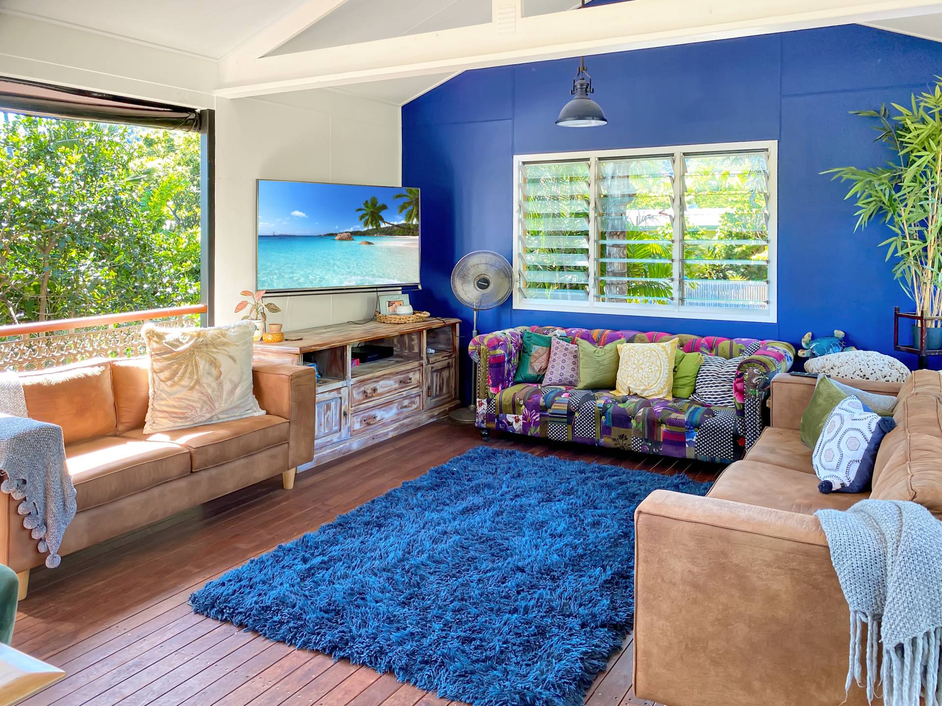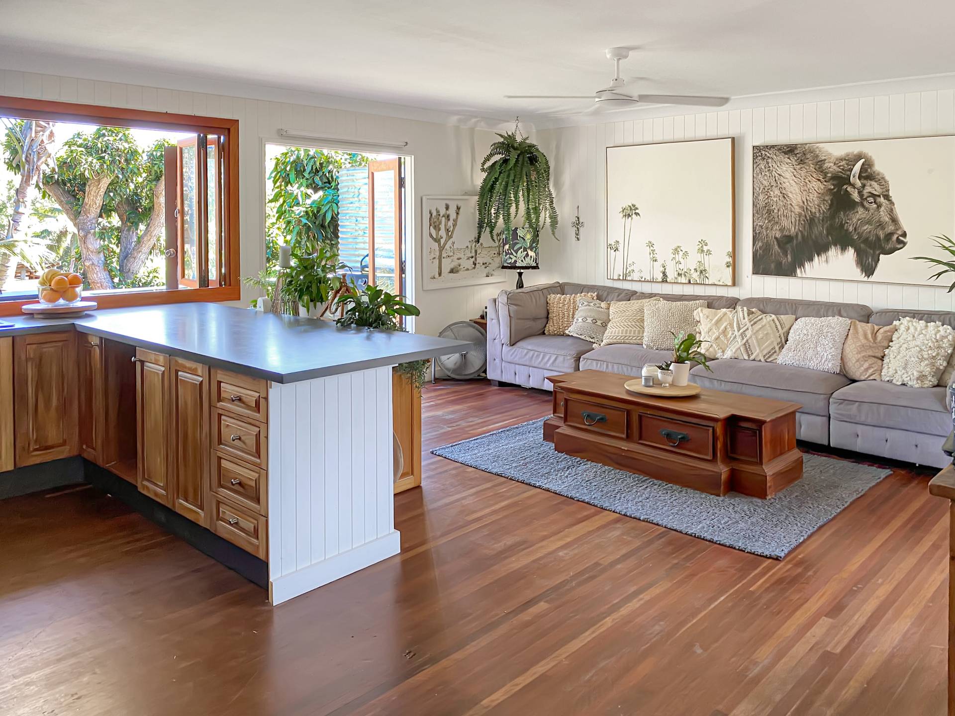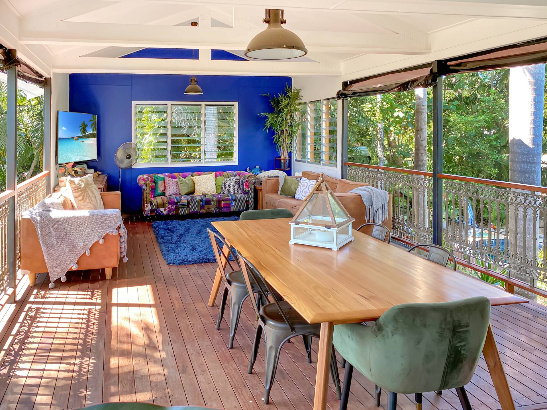 Upstairs is where you will spend most of your time with the fabulous all-weather deck-room - a living and dining room in addition to the one inside. Capturing the breezes beautifully, it's a great place to hang out, watch TV, read a book or enjoy a meal. Bi-fold doors provide a seamless transition to the indoor lounge which also opens to a small rear deck with lovely views to the hills in the west. The kitchen services a large family well and the hardwood floors upstairs provide a homely warmth.