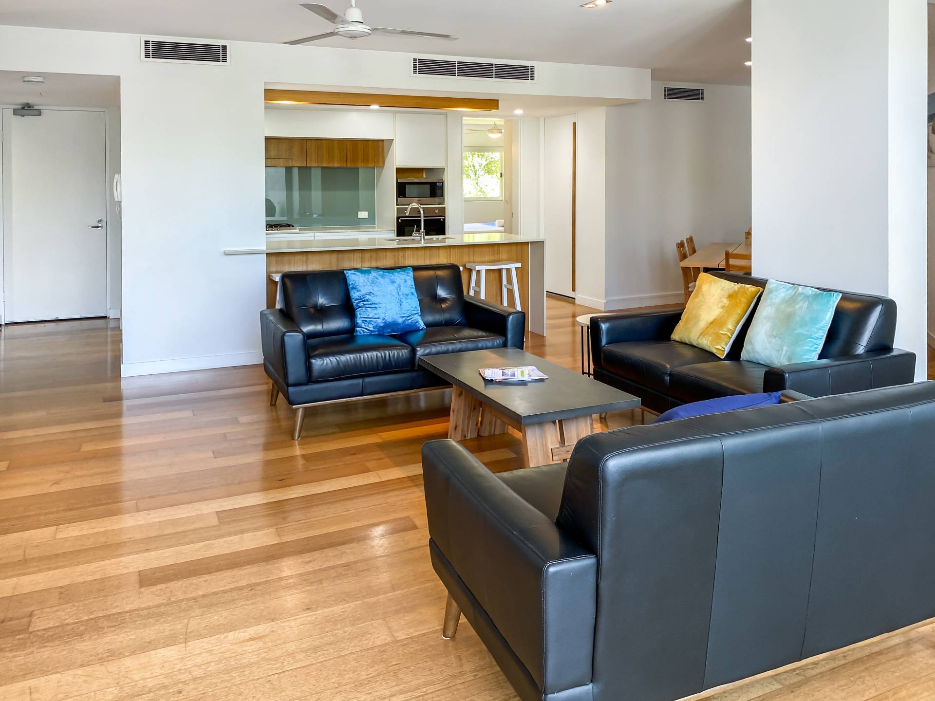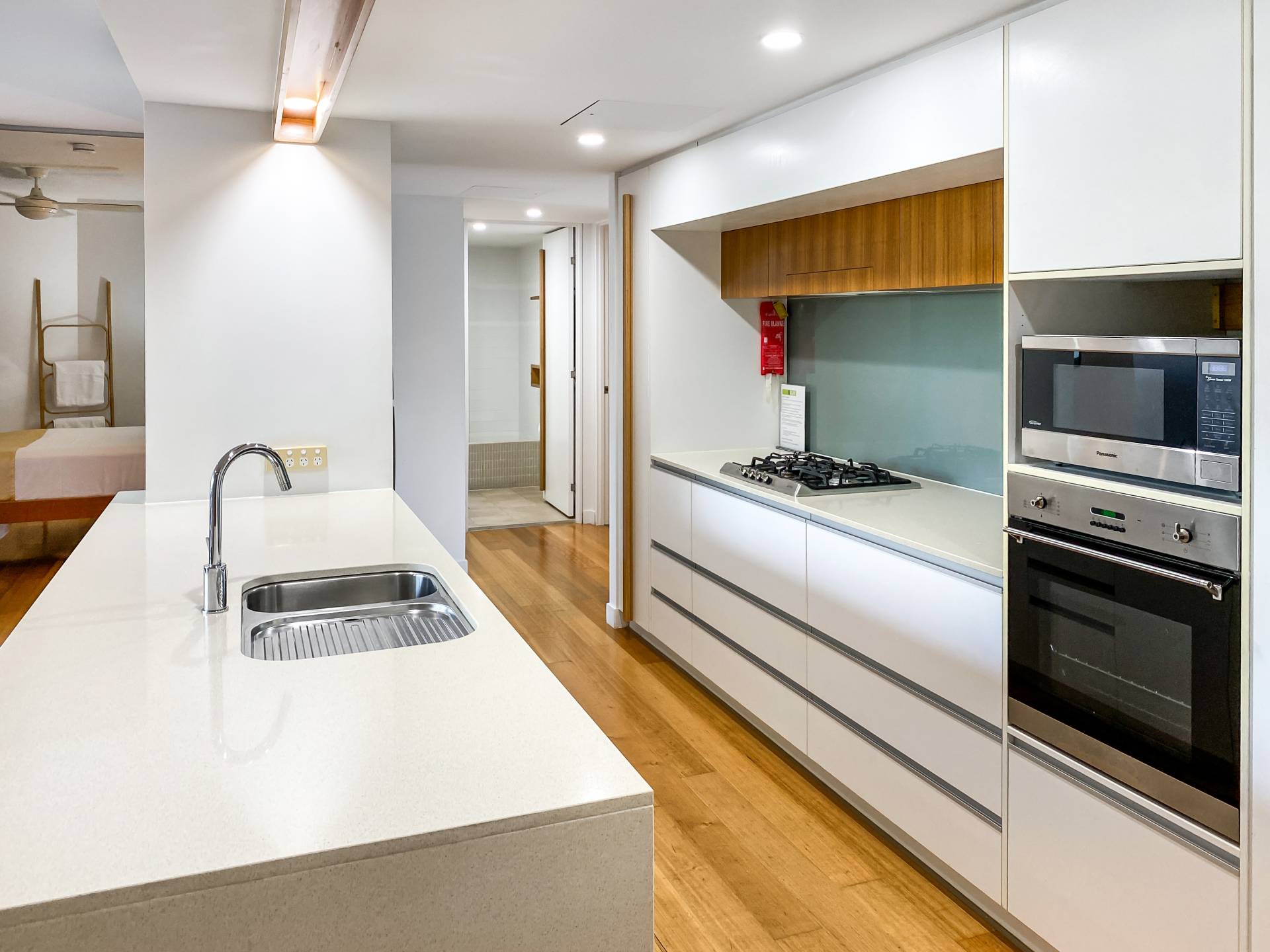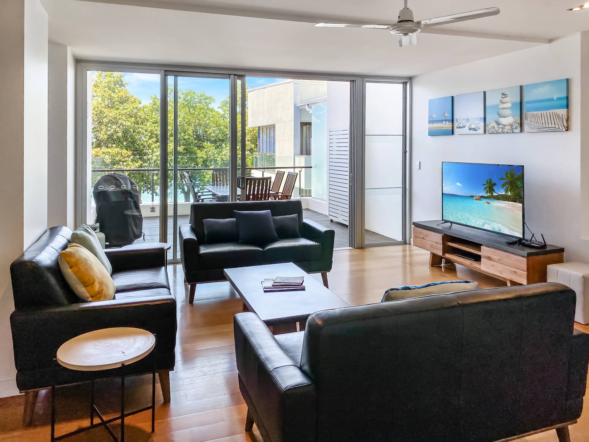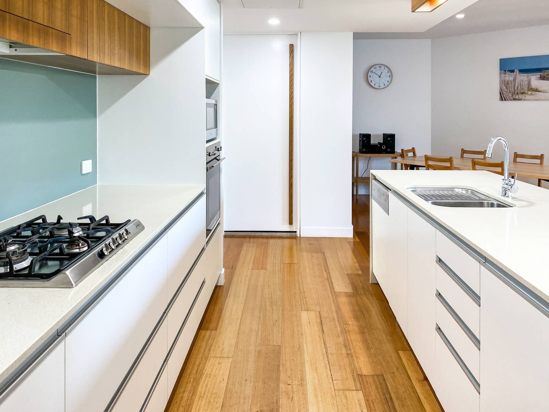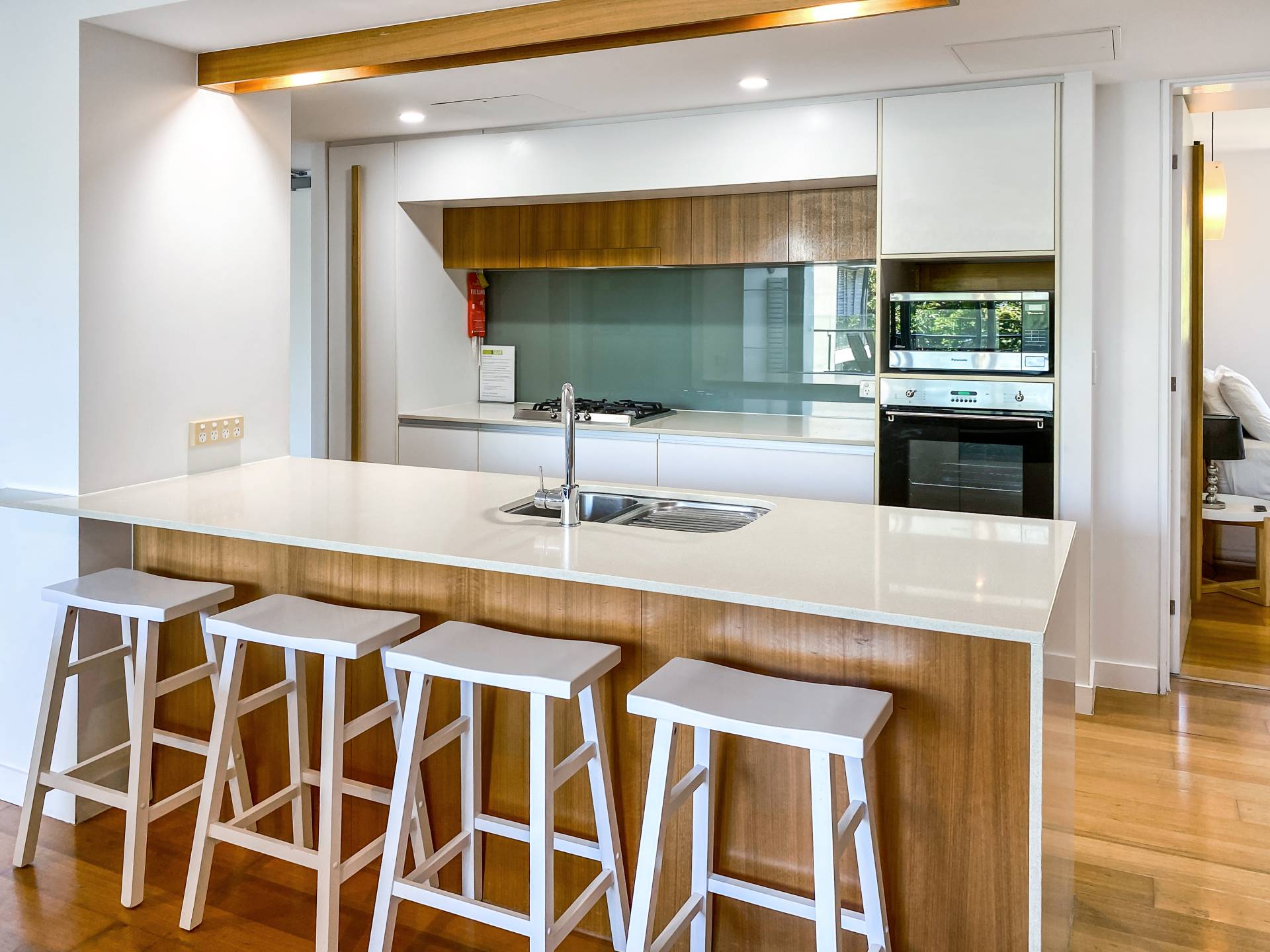 The interior exudes a warmth missing from many other modern apartments, with beautiful polished wood floors throughout the living areas and bedrooms, with tiled wet areas. Ducted reverse cycle air conditioning and ceiling fans are installed throughout to keep you comfortable in any weather. The galley-style kitchen is sleek and modern with Smeg appliances, gas cooktop, stone benchtops and breakfast bar and comes fully equipped, right down to the teaspoons. The apartment is offered fully furnished so you can continue to holiday let or simply move in.