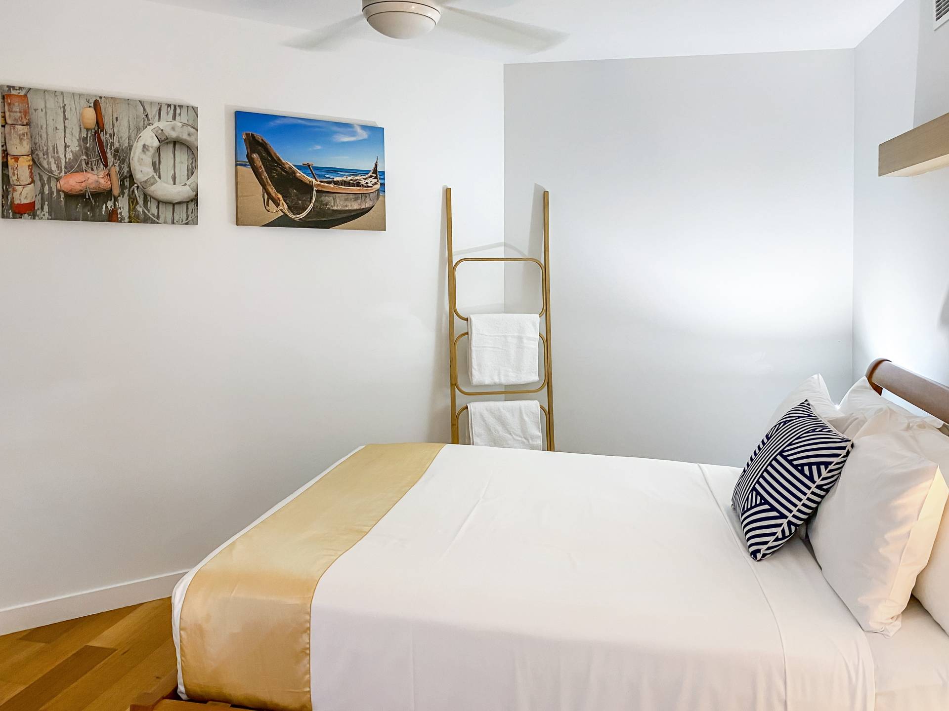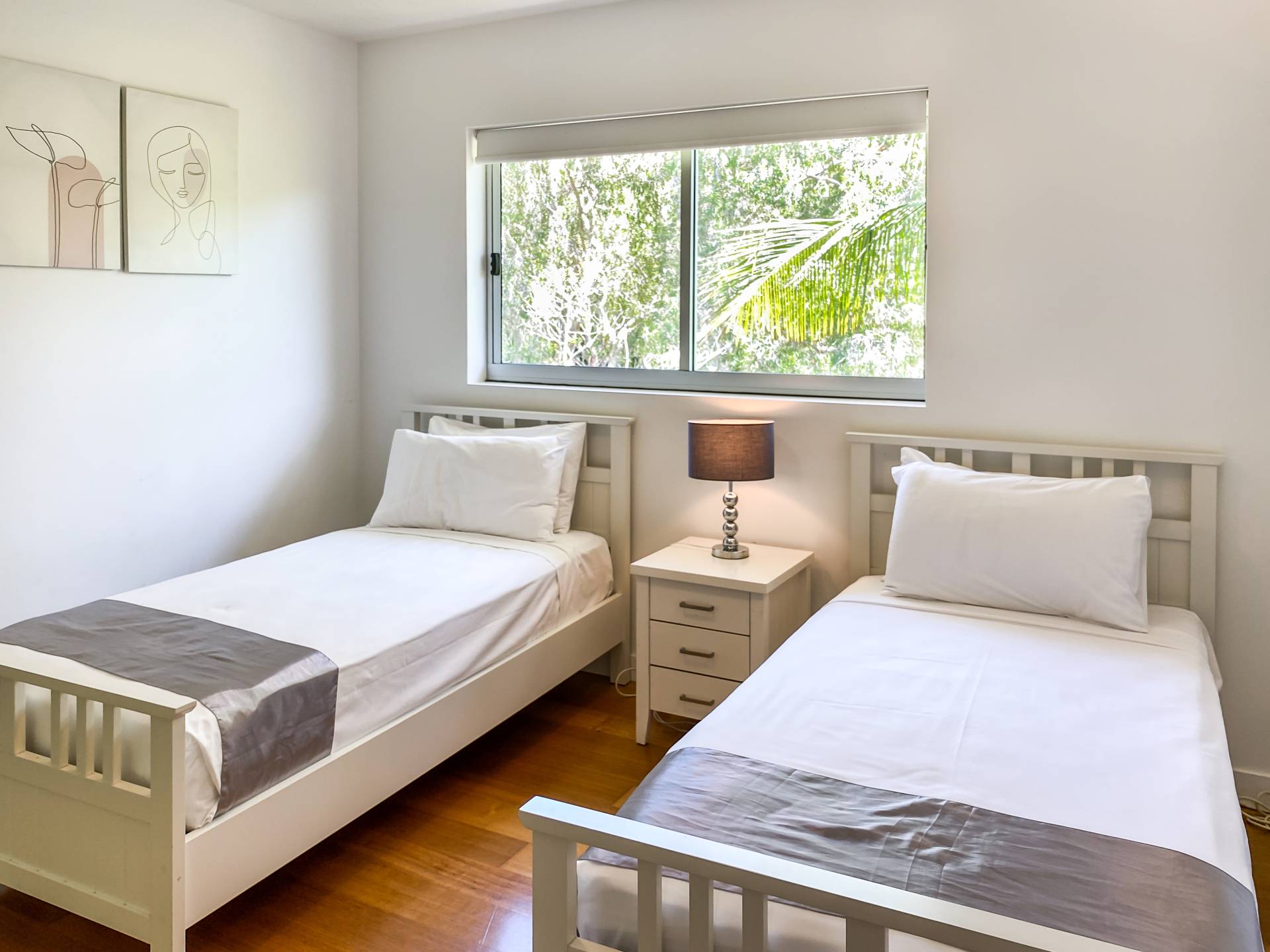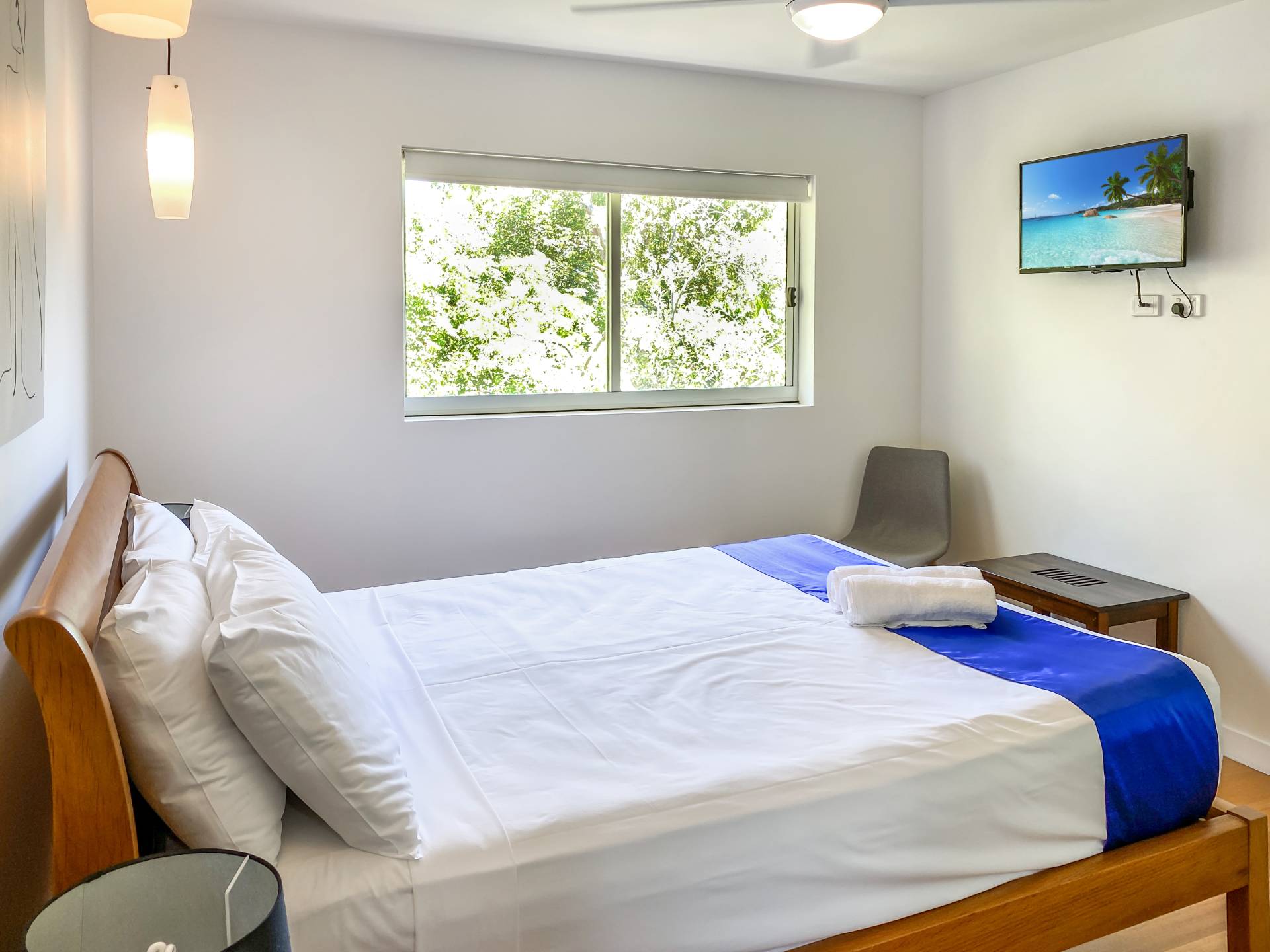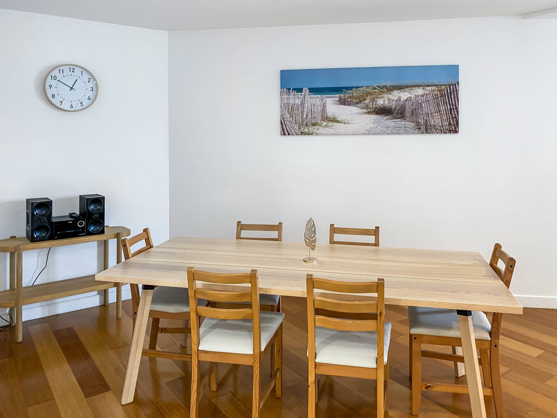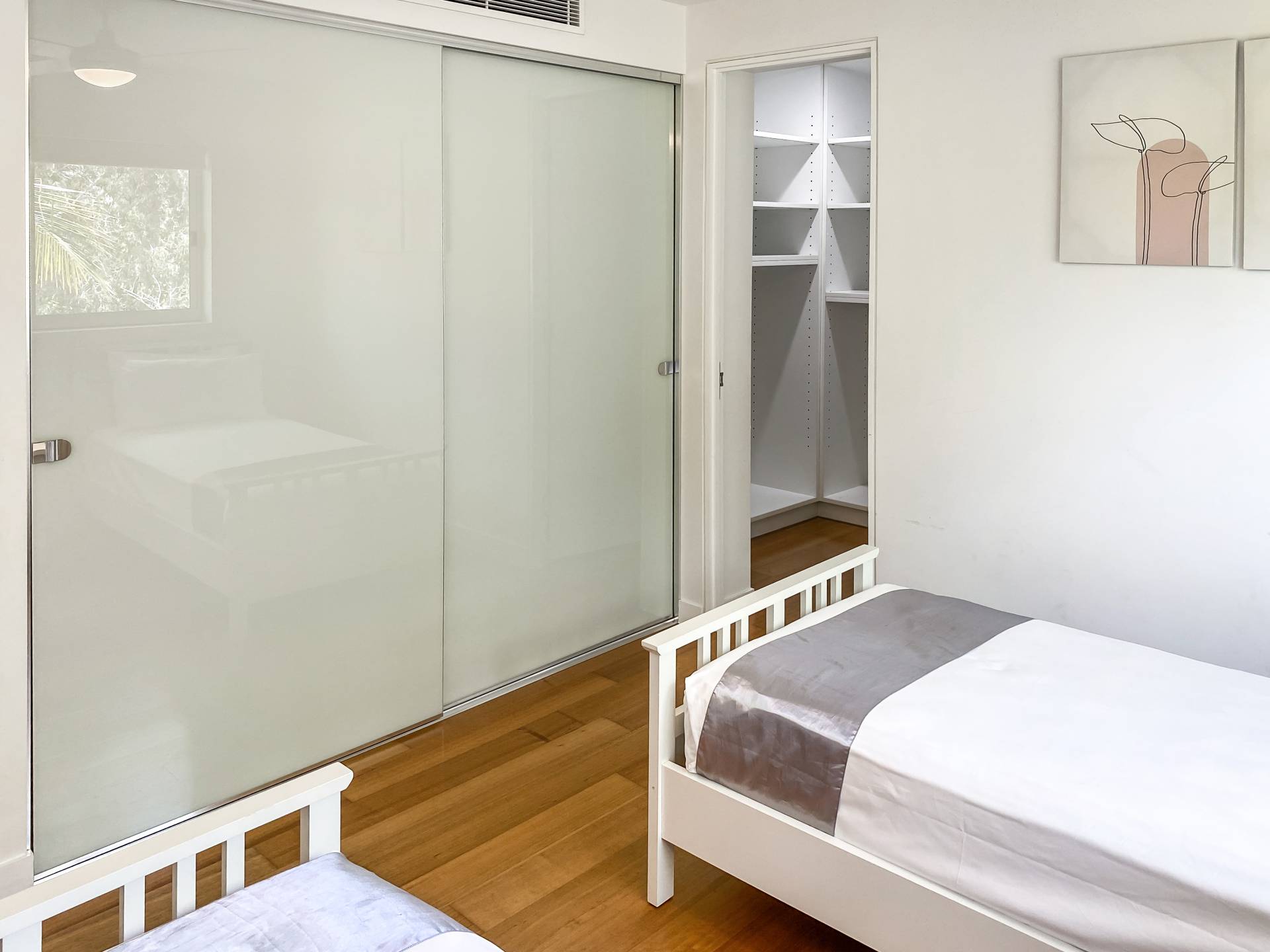 The interior exudes a warmth missing from many other modern apartments, with beautiful polished wood floors throughout the living areas and bedrooms, with tiled wet areas. Ducted reverse cycle air conditioning and ceiling fans are installed throughout to keep you comfortable in any weather. The galley-style kitchen is sleek and modern with Smeg appliances, gas cooktop, stone benchtops and breakfast bar and comes fully equipped, right down to the teaspoons. The apartment is offered fully furnished so you can continue to holiday let or simply move in.