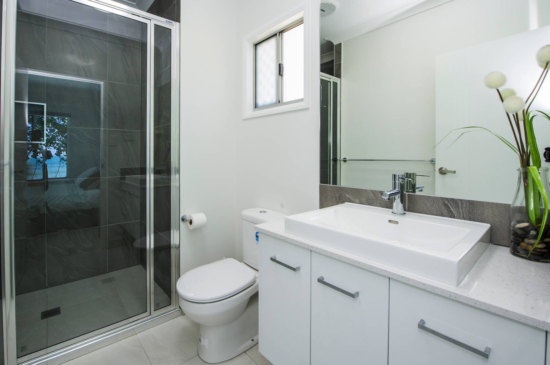 Downstairs is more than adequate to live in on its own, if you are looking to retire here on one level but still want room for guests and grandchildren. Or if you are intending to continue holiday letting, there's no problem bringing the grandparents who can comfortably stay downstairs. There is a ground level master bedroom with ensuite bathroom and a further two bedrooms, all with built-in-wardrobes, air-con and ceiling fans, family bathroom and a powder room, plus the laundry as well.
