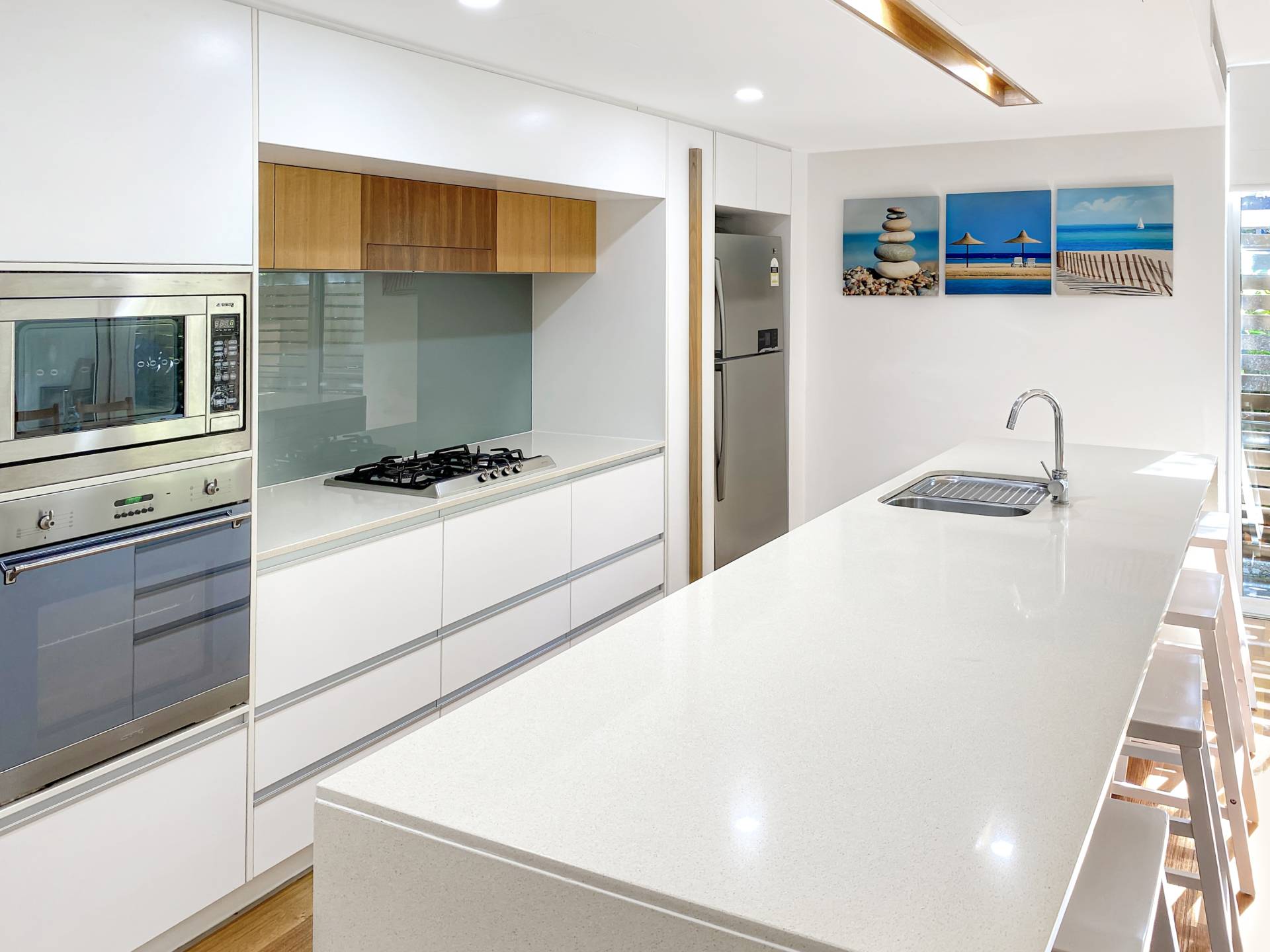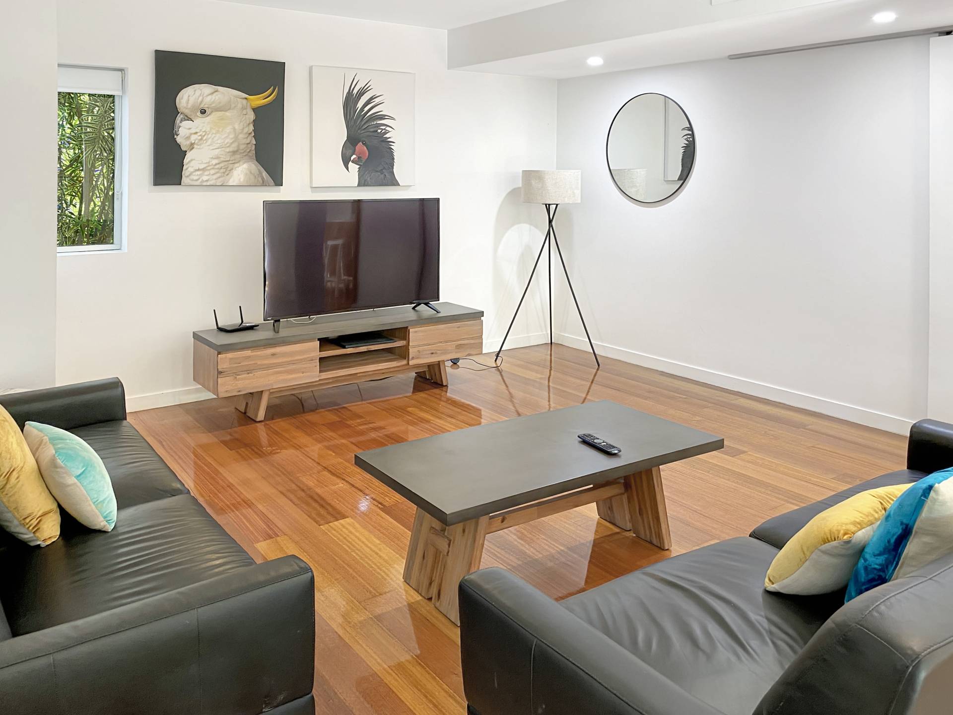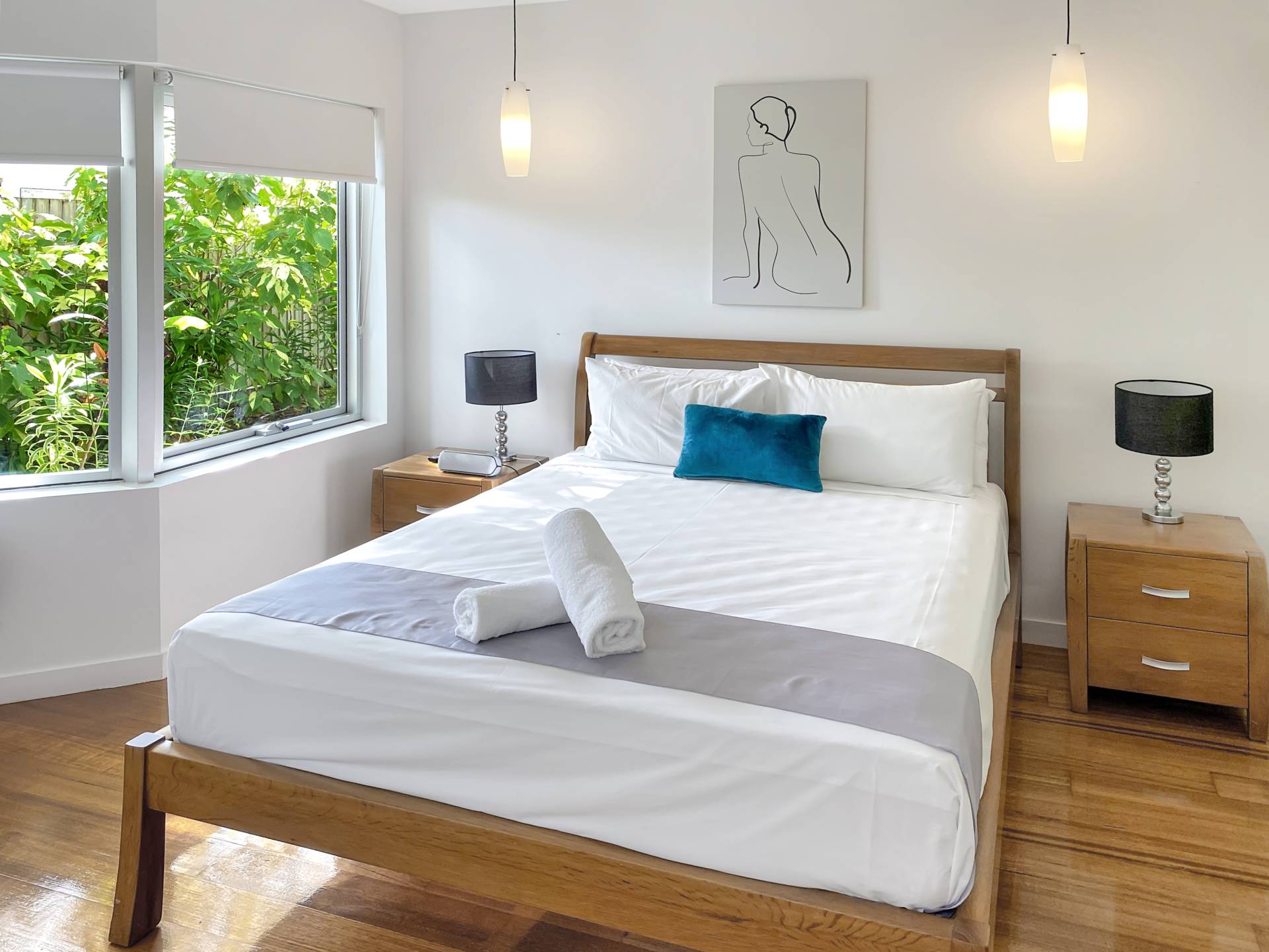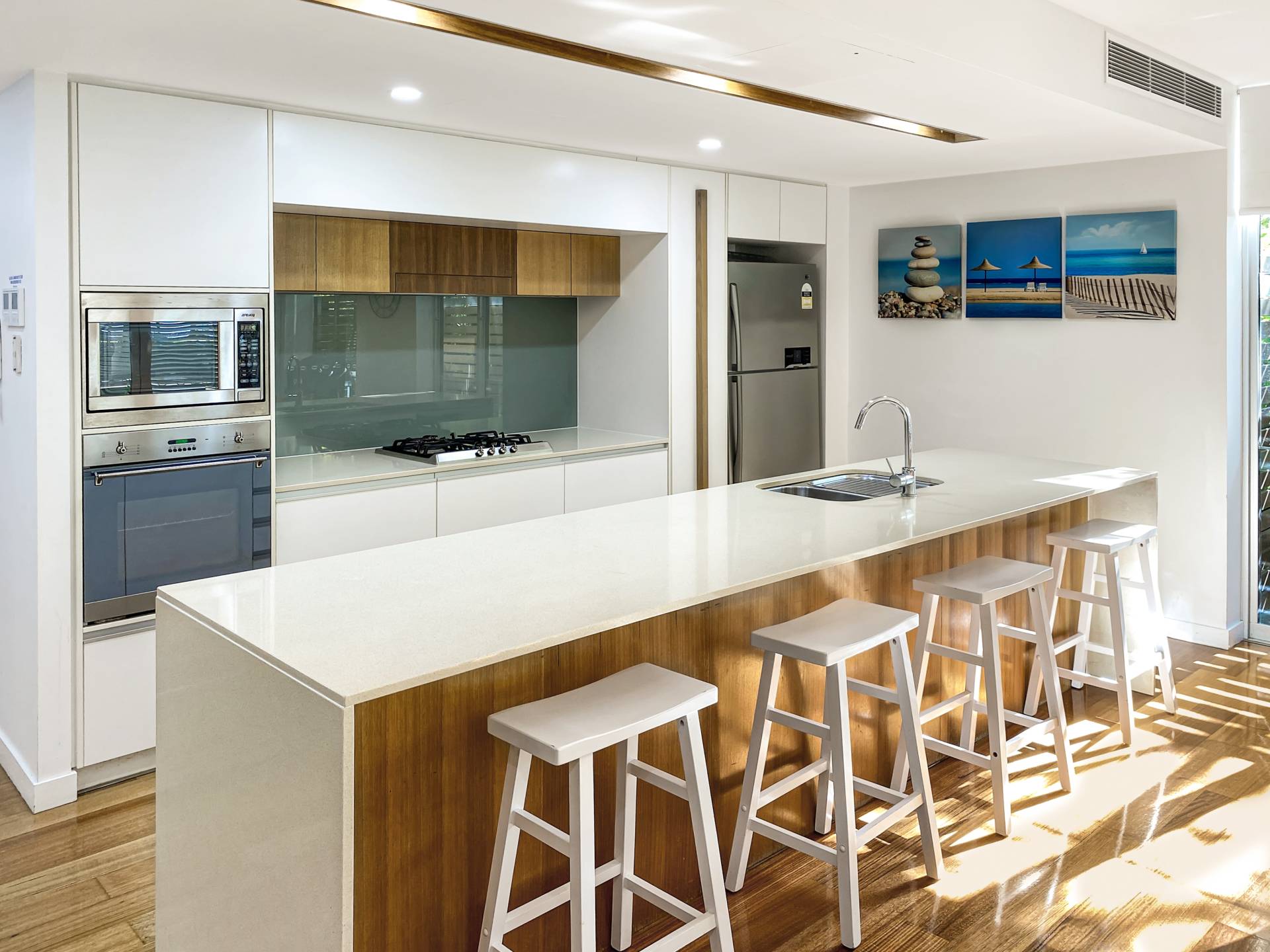 The interior exudes a warmth missing from many other modern apartments, with beautiful polished wood floors throughout the living areas and bedrooms, with tiled wet areas. Ducted reverse cycle air conditioning and ceiling fans are installed throughout to keep you comfortable in any weather. The galley-style kitchen is sleek and modern with quality appliances, gas cooktop, stone benchtops and breakfast bar and comes fully equipped, right down to the teaspoons. The apartment is offered fully furnished so you can continue to holiday let or simply move in.