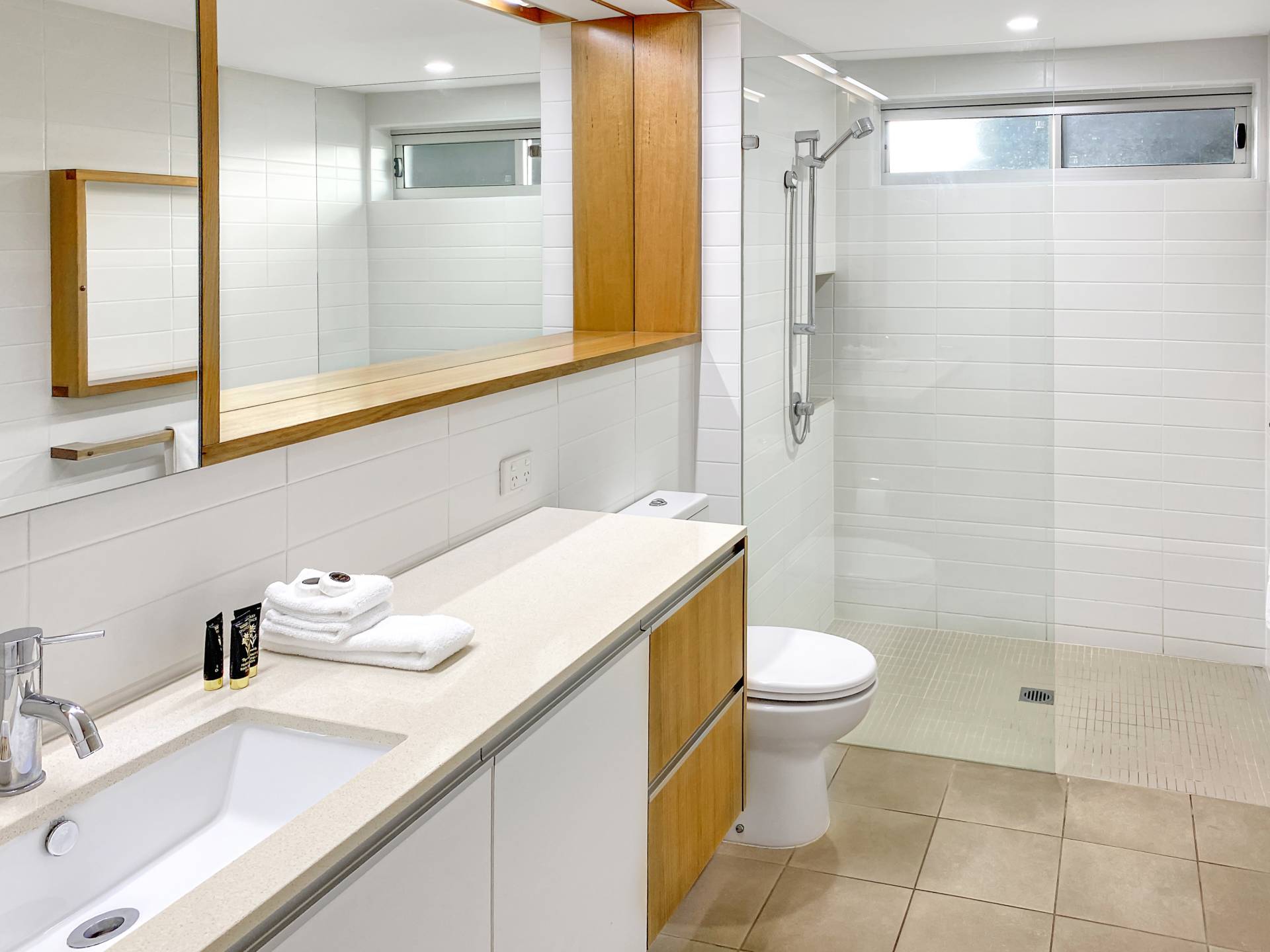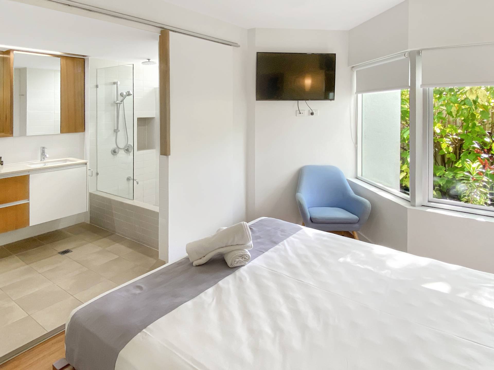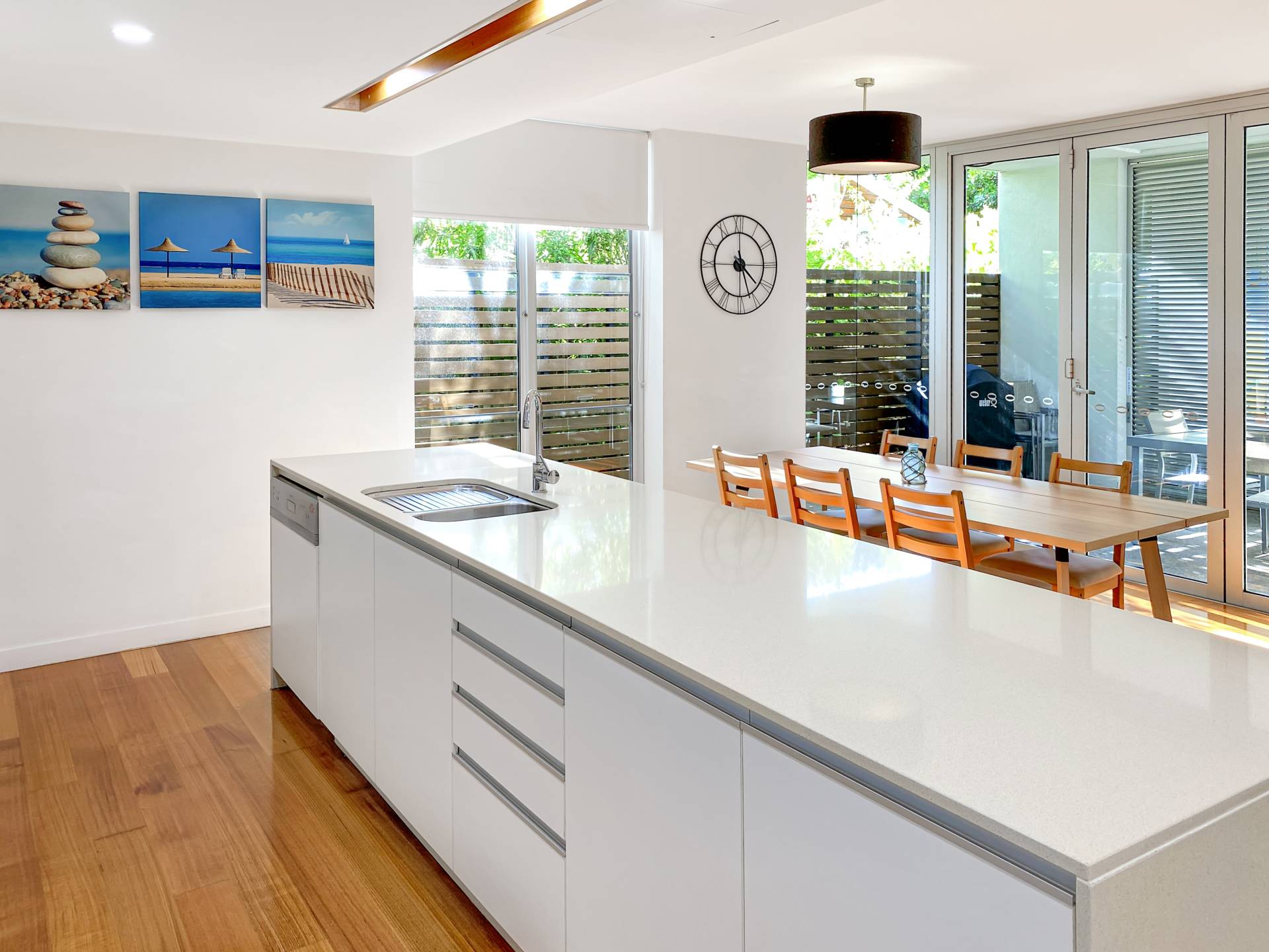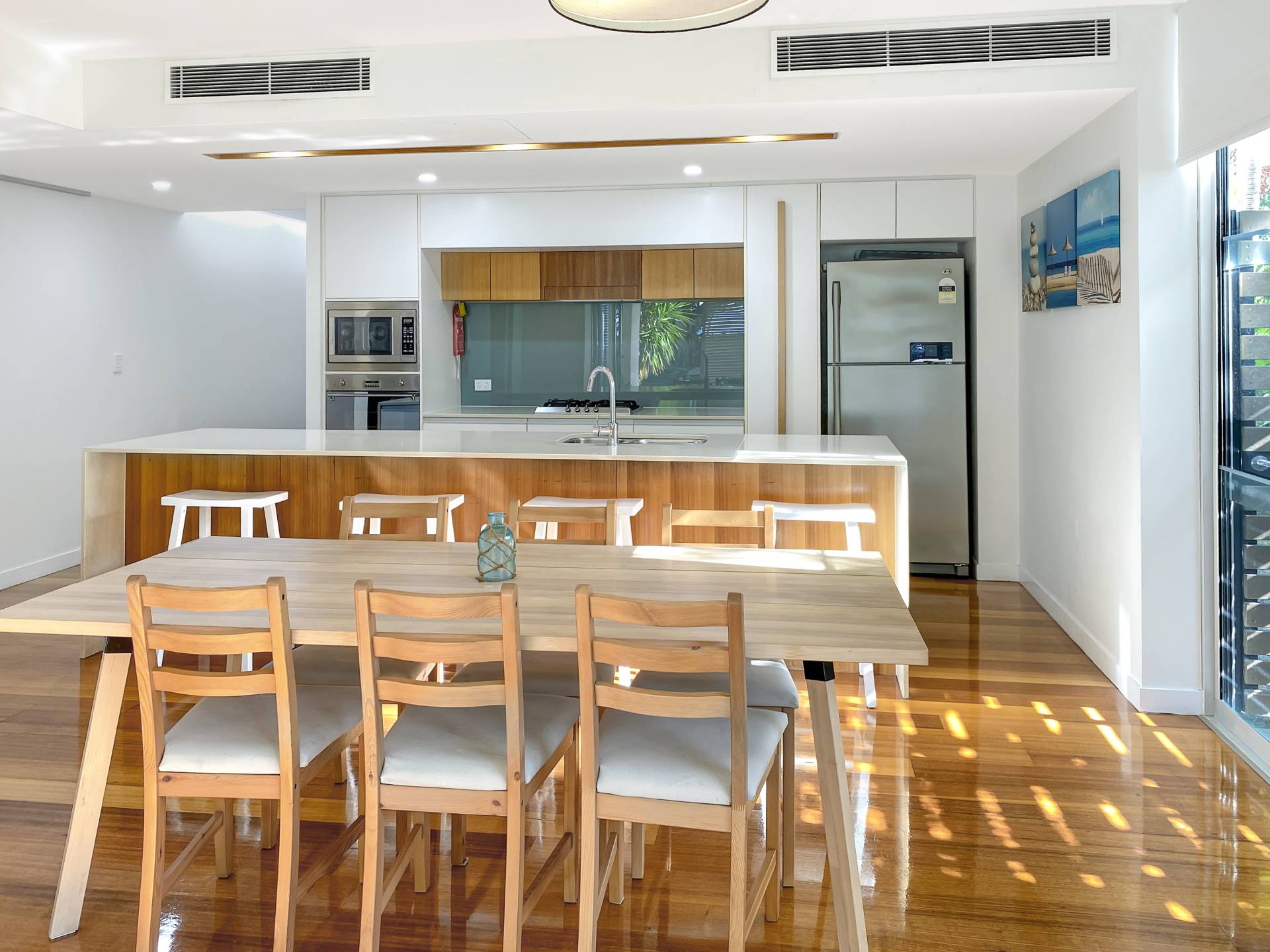 The interior exudes a warmth missing from many other modern apartments, with beautiful polished wood floors throughout the living areas and bedrooms, with tiled wet areas. Ducted reverse cycle air conditioning and ceiling fans are installed throughout to keep you comfortable in any weather. The galley-style kitchen is sleek and modern with quality appliances, gas cooktop, stone benchtops and breakfast bar and comes fully equipped, right down to the teaspoons. The apartment is offered fully furnished so you can continue to holiday let or simply move in.