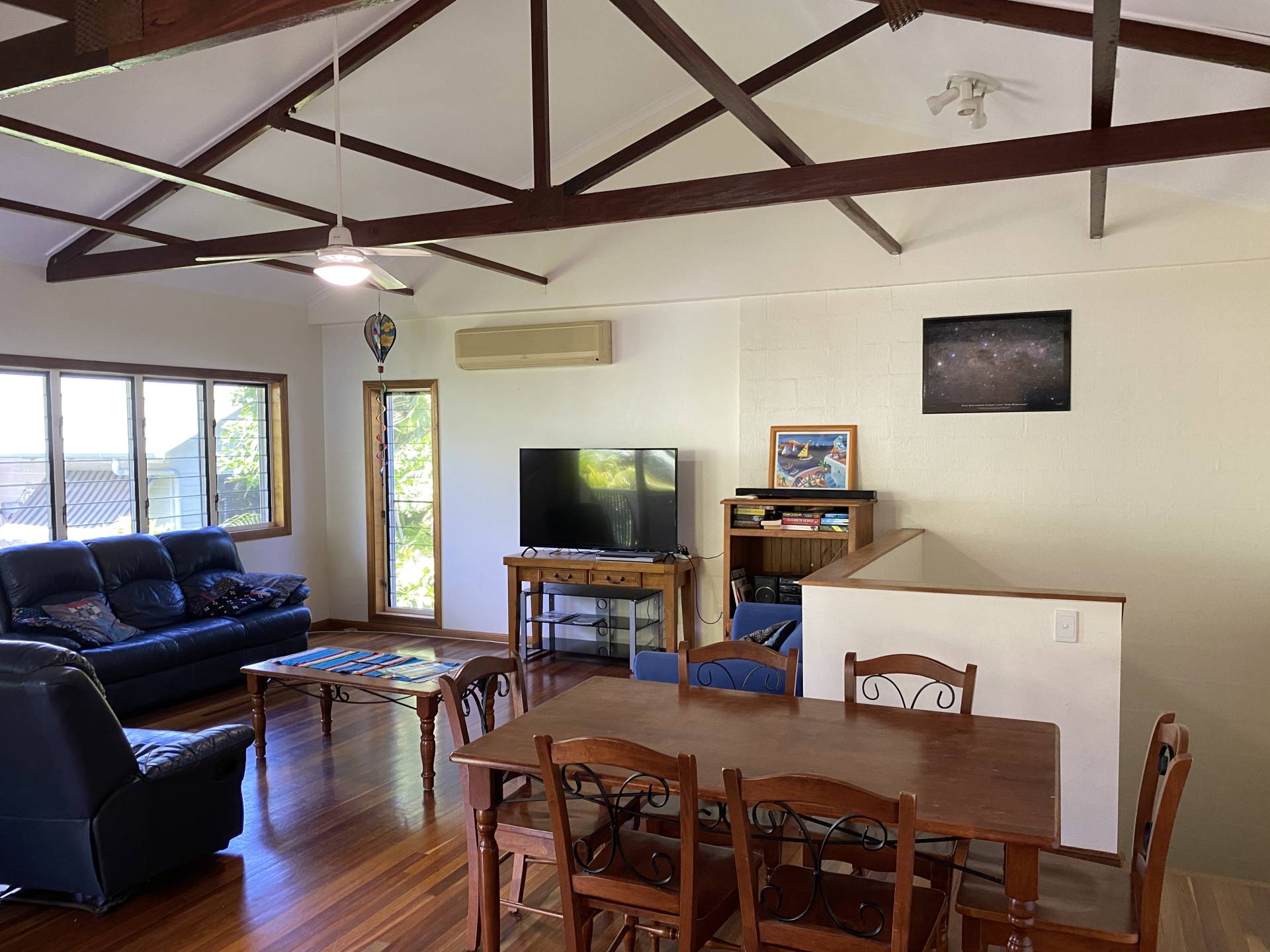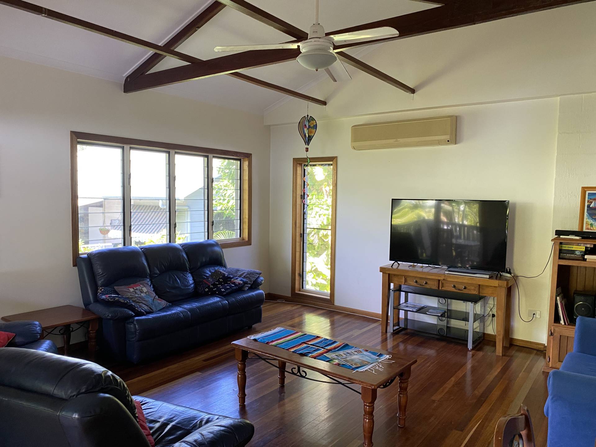 Split level, the bedrooms and bathrooms are downstairs, with an open-plan living area upstairs with beautiful hardwood floors and raked ceilings.