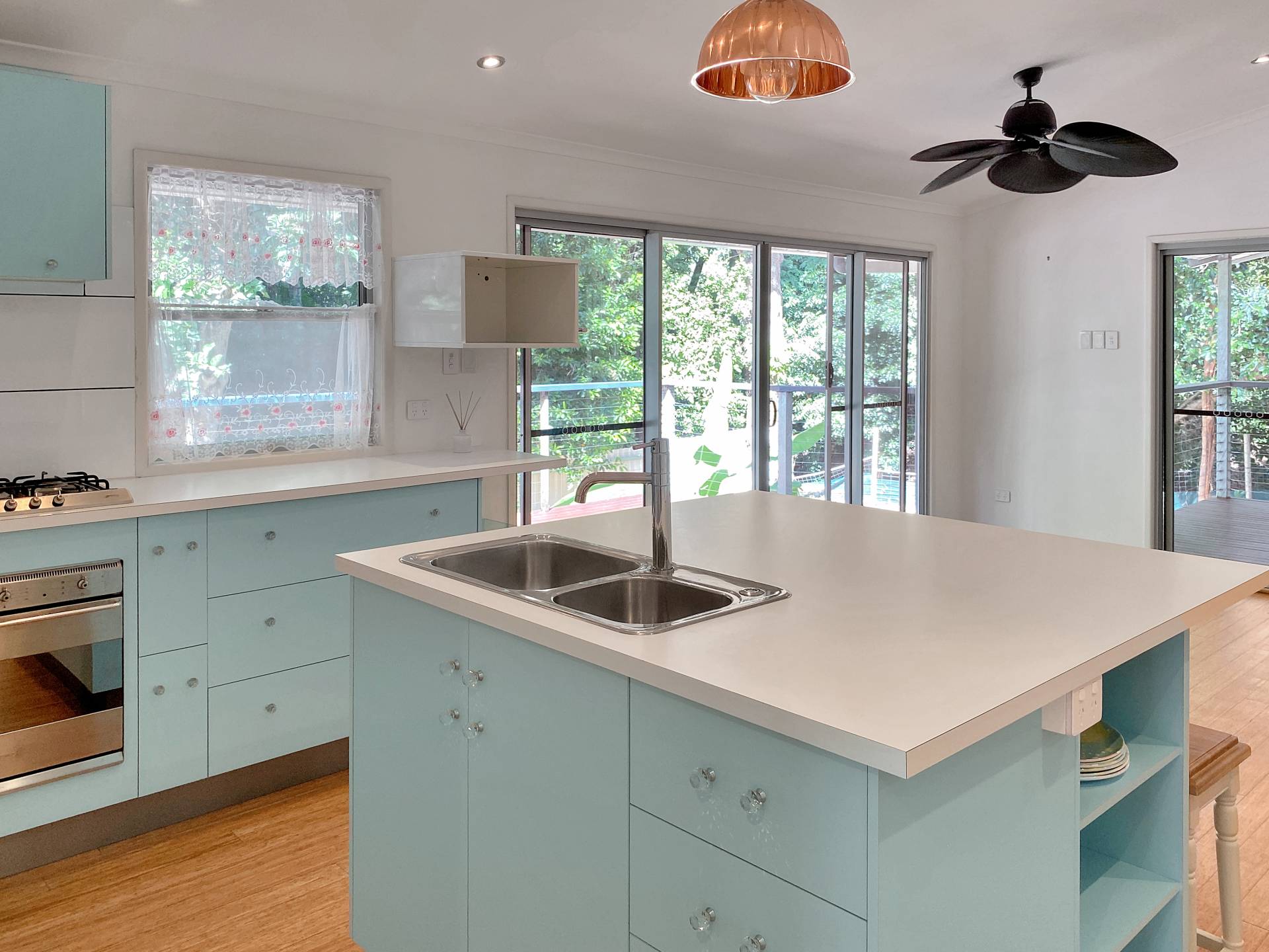 High ceilings and large sliding doors onto both decks provide wonderful light and aspect to the main living area and whilst the kitchen appears compact compared to the whole room, it is well-designed with walk-in pantry, breakfast bar, large double door fridge space, double sink, gas stove, dishwasher and plenty of storage.