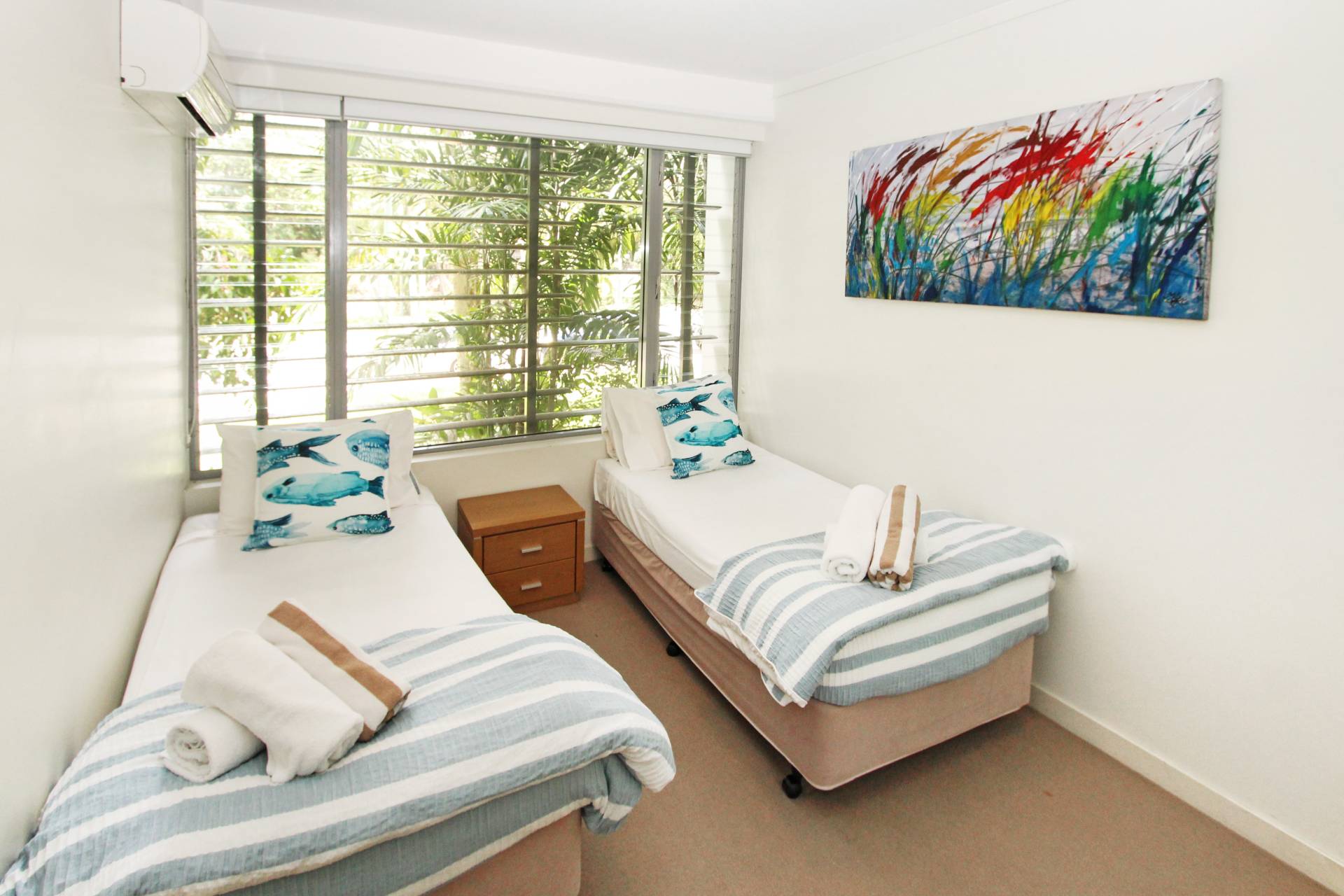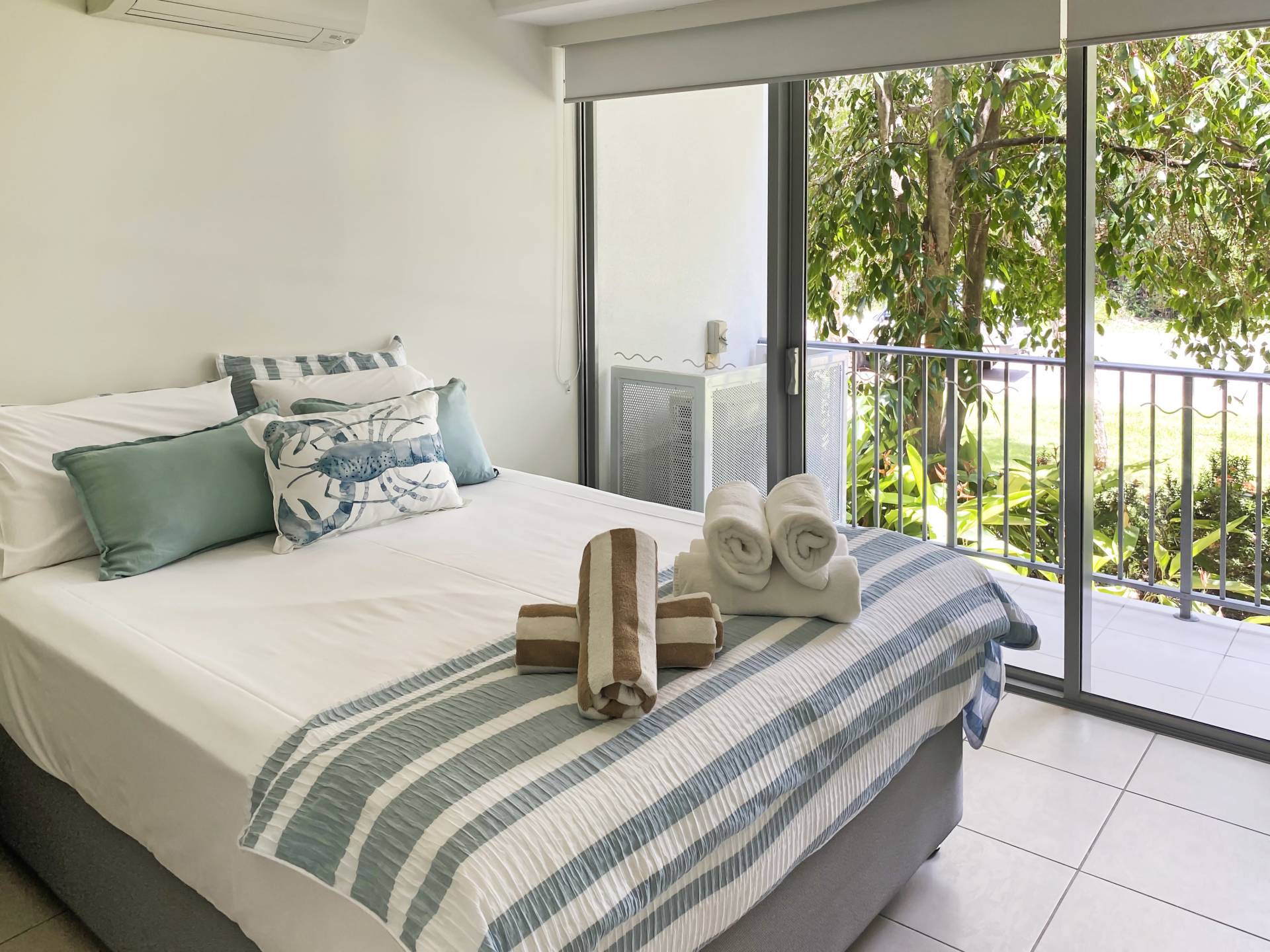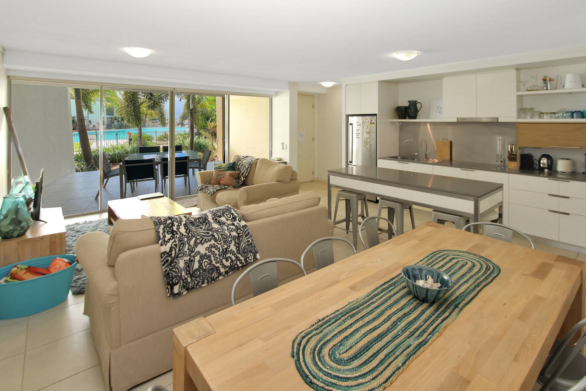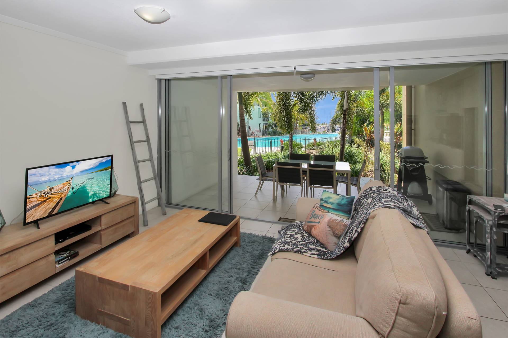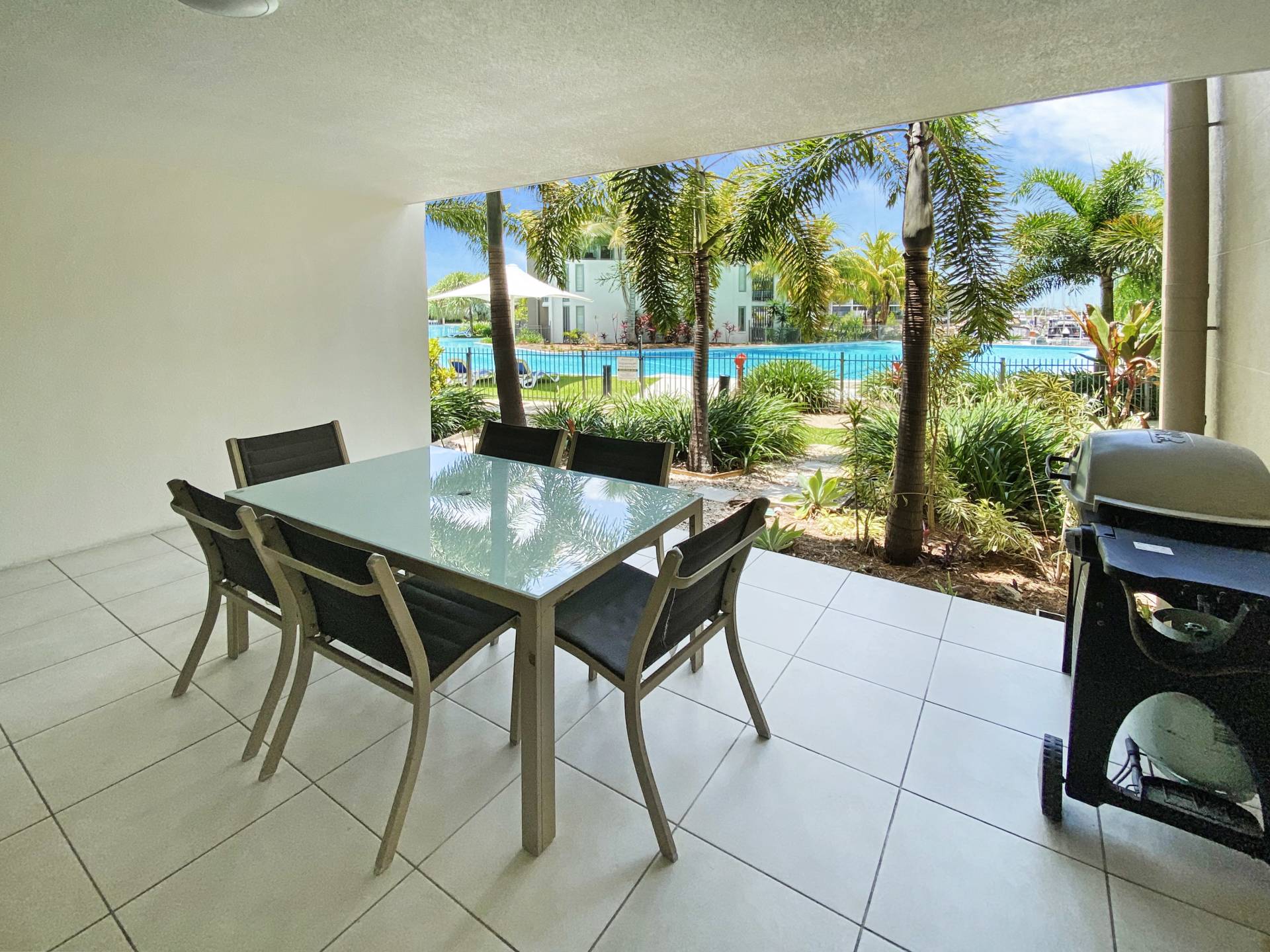 With endless views over the enormous lagoon pool, across the marina and all the way to the mainland in the distance, this spacious ground floor apartment is currently a popular holiday rental with families who can sit on the shady covered verandah and keep an eye on the kids in the pool or those who don't want to have to climb lots of stairs.