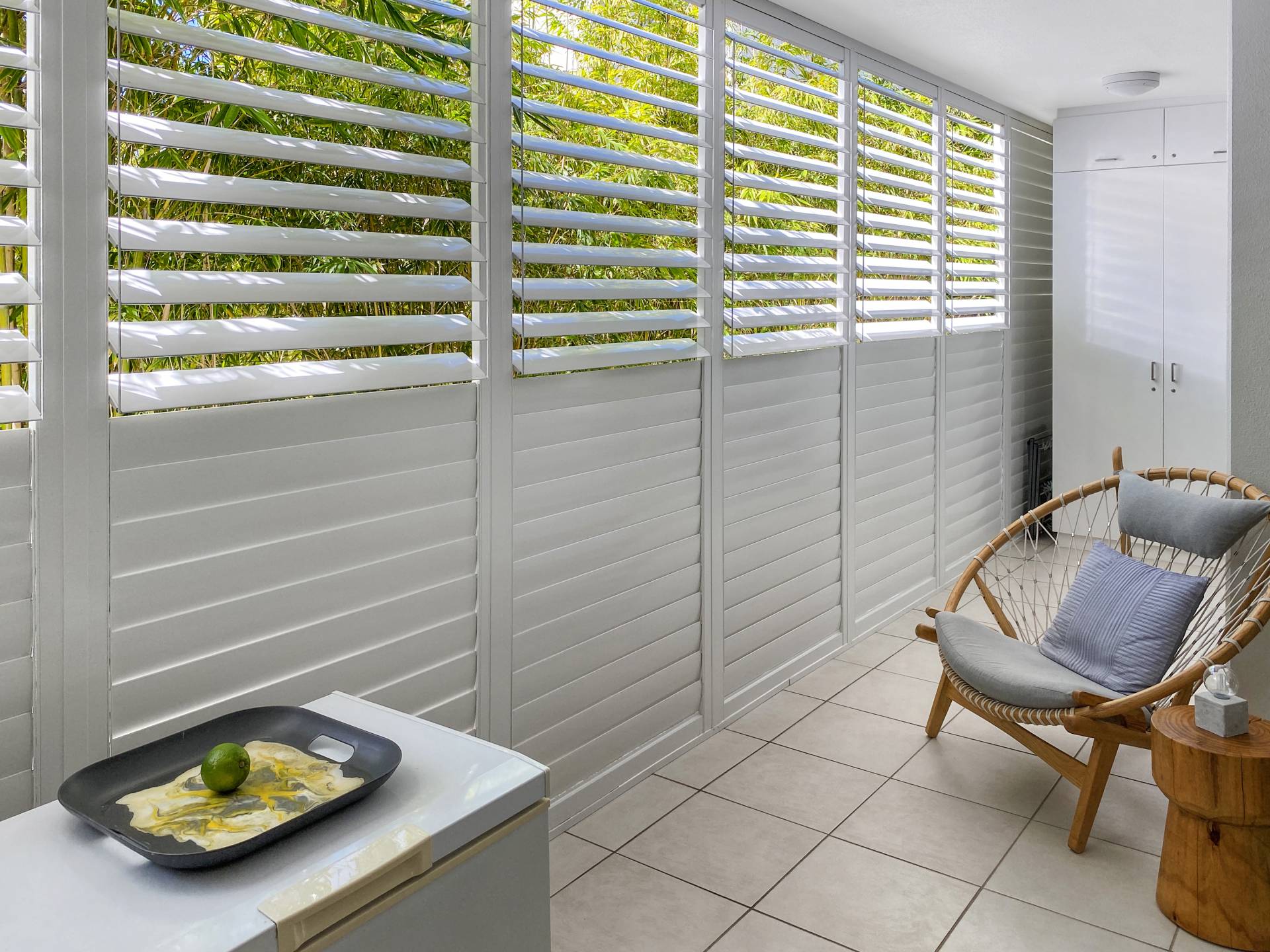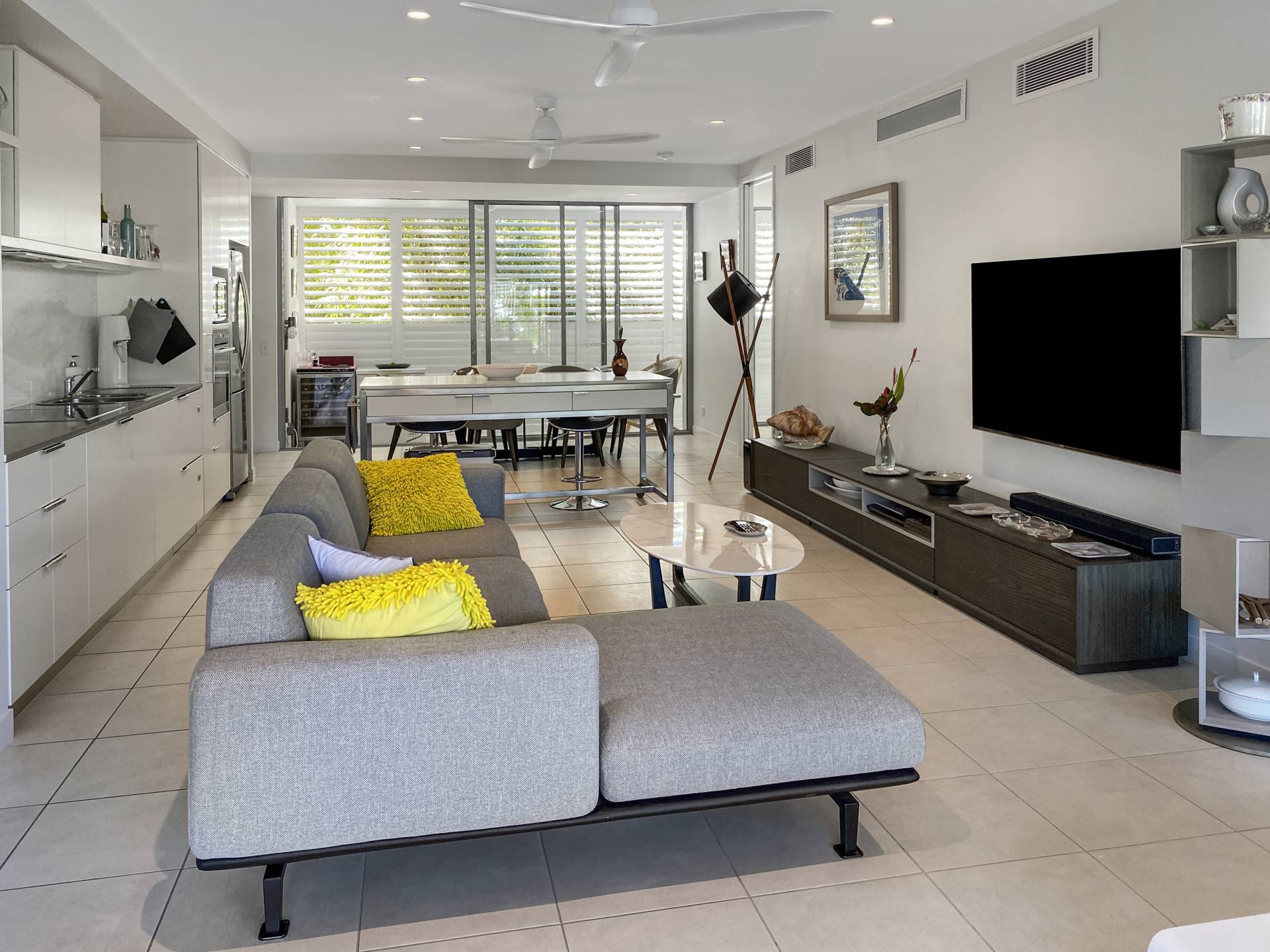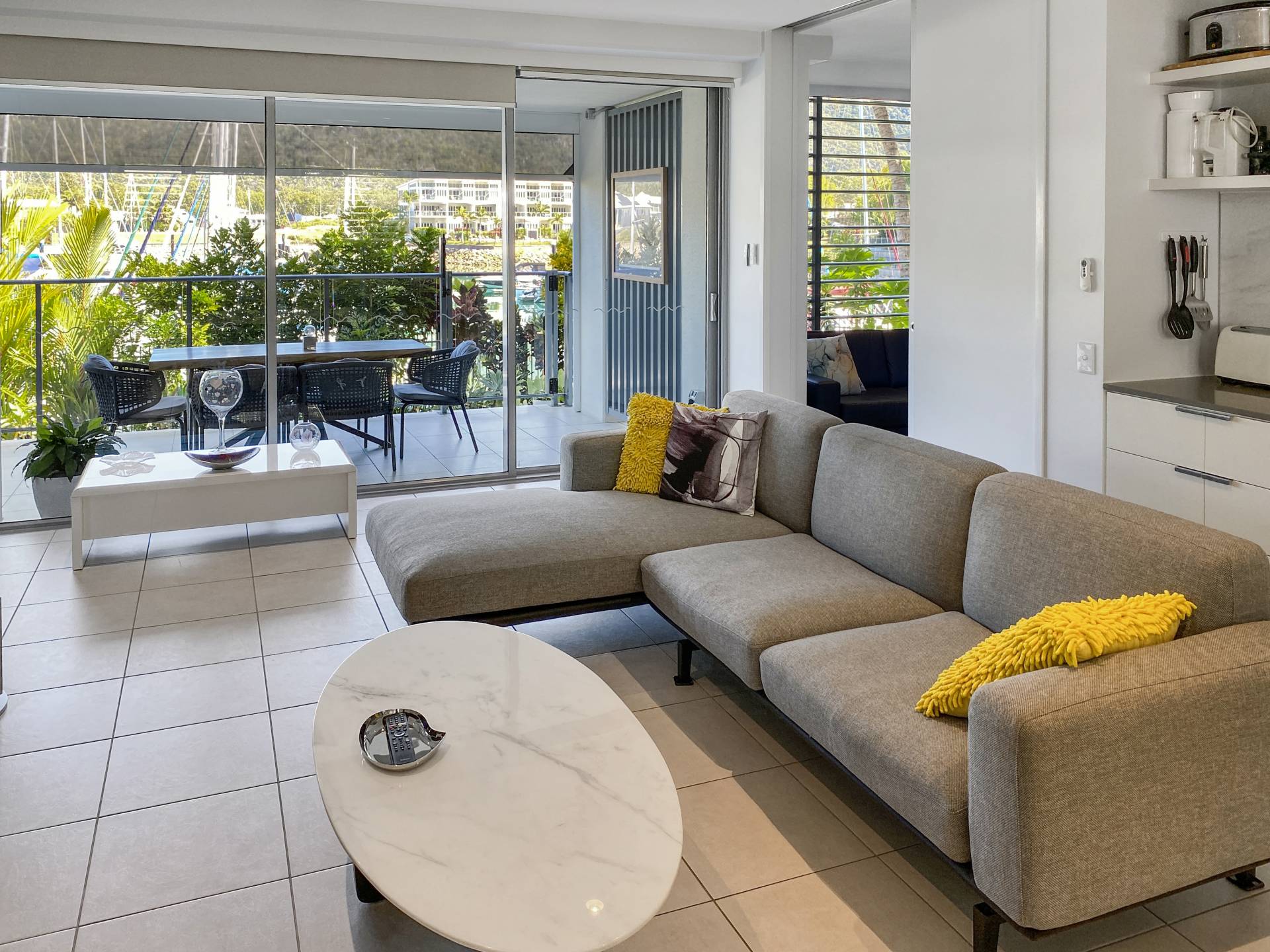 It is light and airy with floor to ceiling glass doors at each end of the open-plan living area, with the marina-front patio, pool and garden at one end, whilst at the other end the patio has been cleverly enclosed with shutters, creating another whole room and providing security, privacy and air flow.