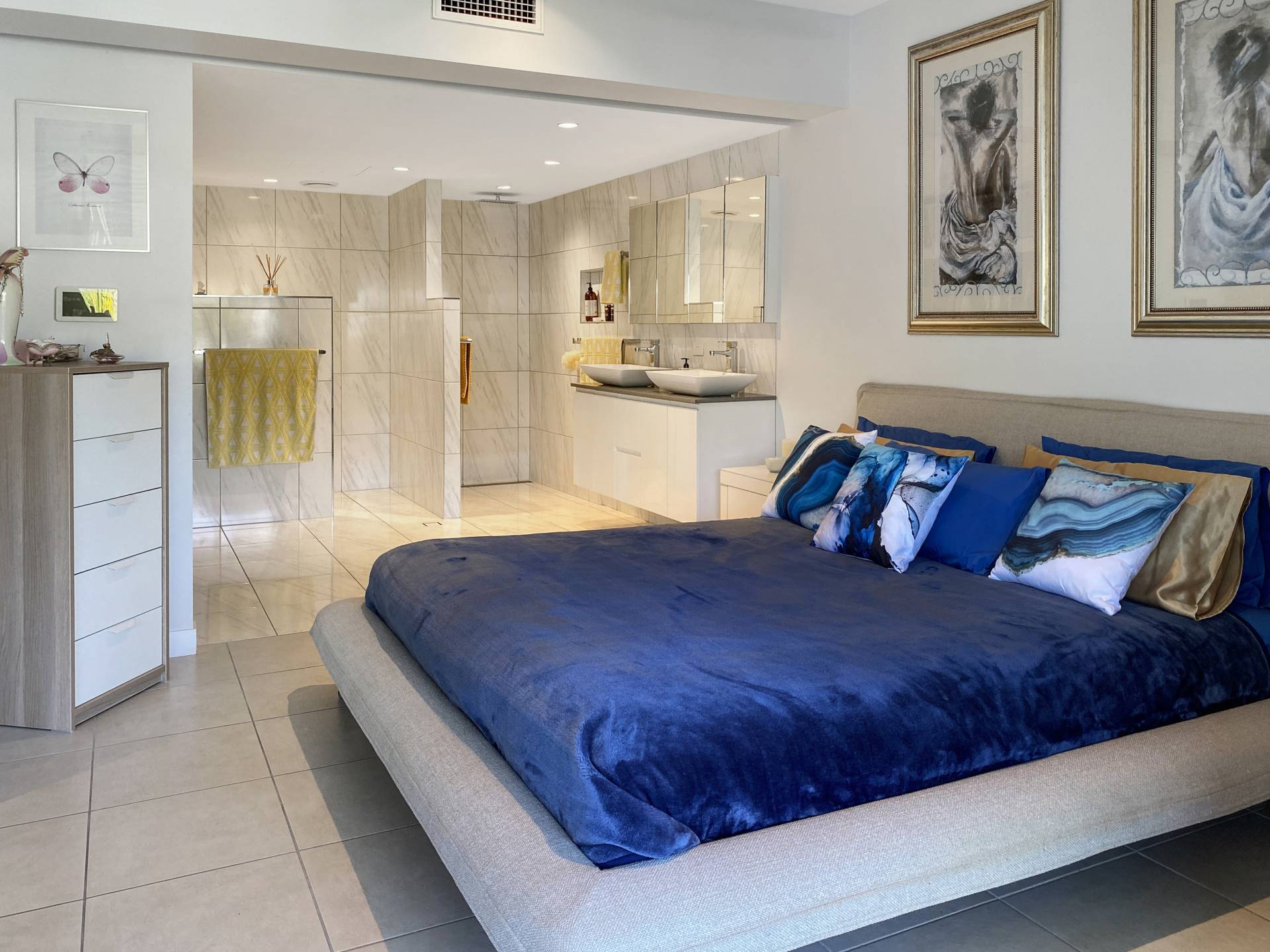 The master bedroom opens onto the patio with views over the plunge pool and garden to the yachts in the marina and mainland beyond. The ensuite bathroom has been completely renovated and re-designed, removing the awkward bath in the bedroom that featured in the original design! There's still a bath in the family bathroom for those who can't live without one, as well as a separate shower in that bathroom too.