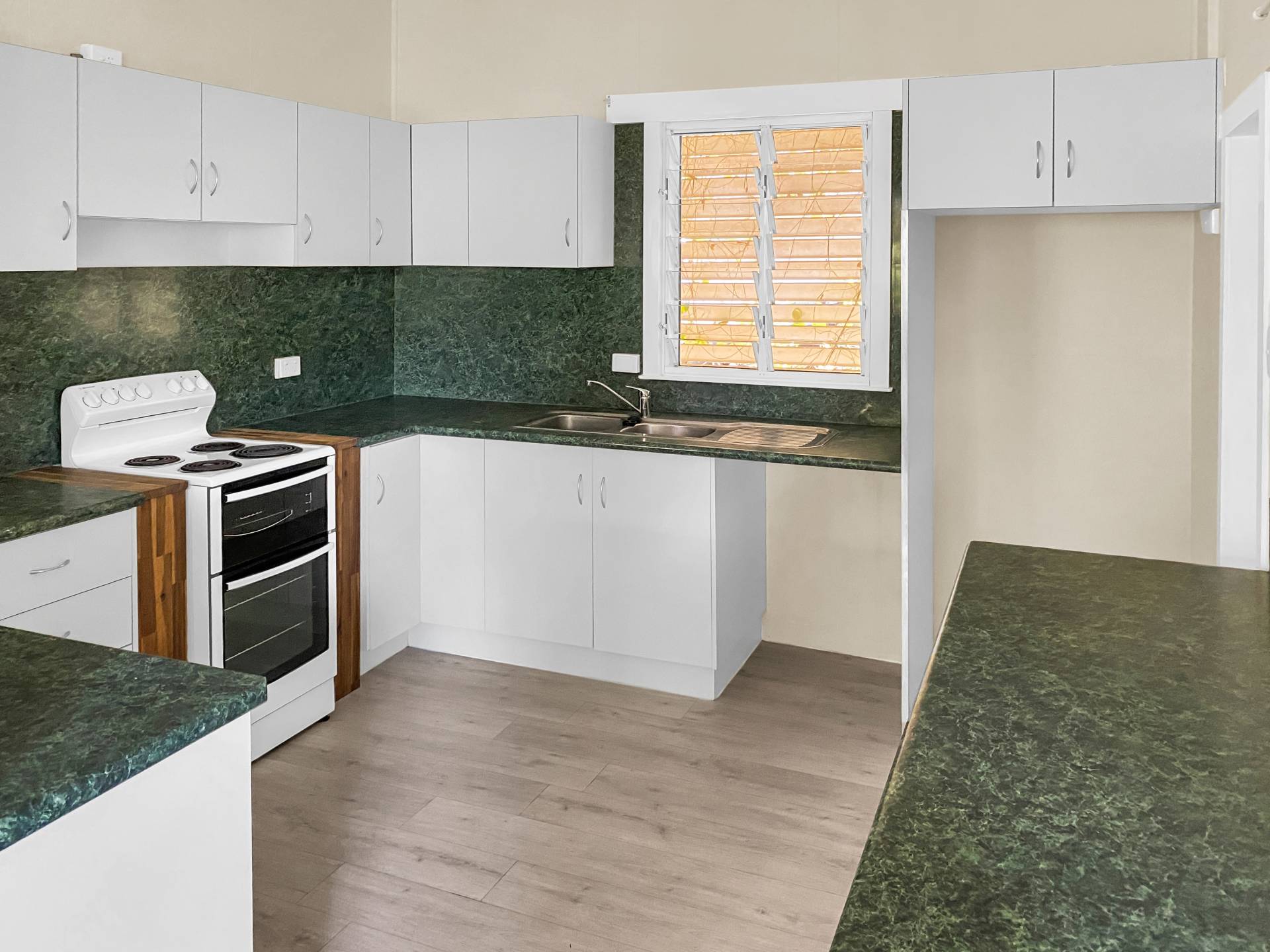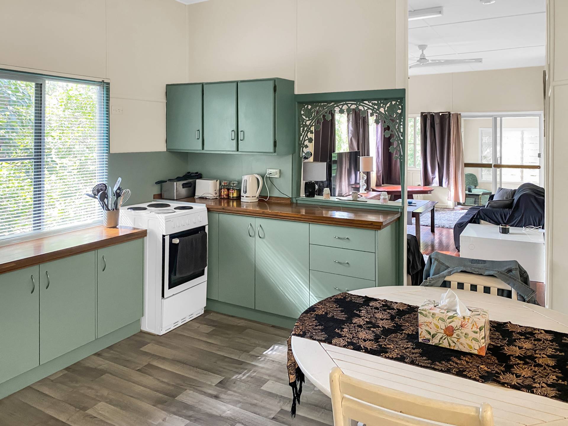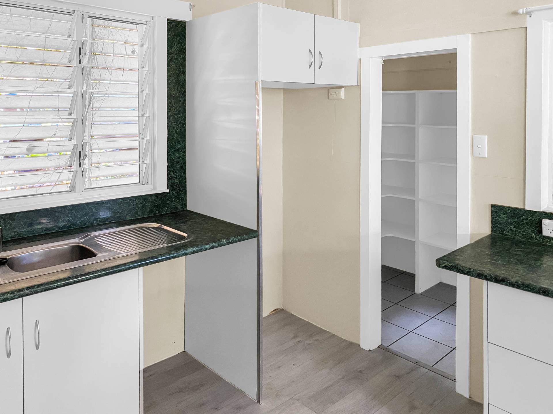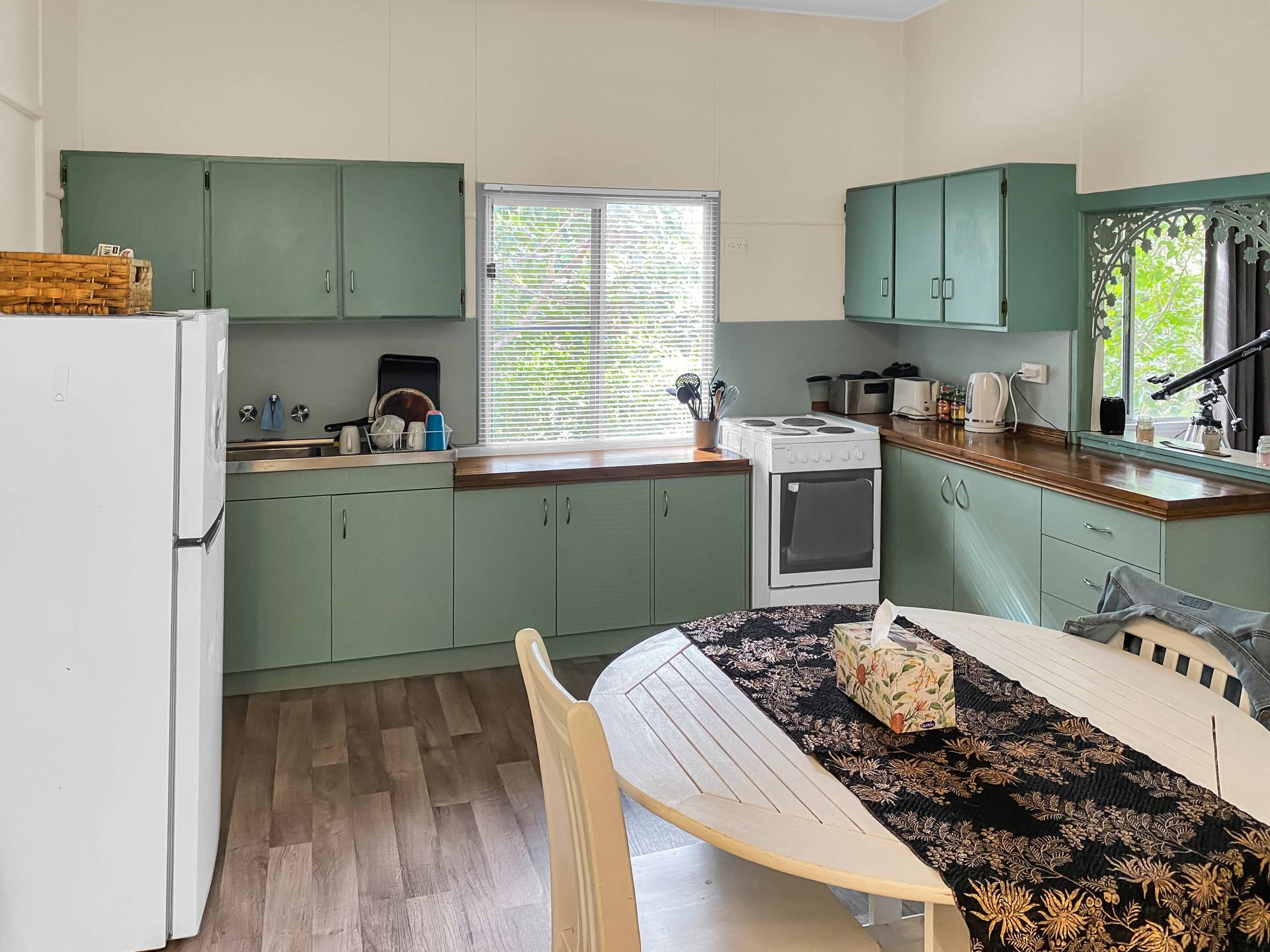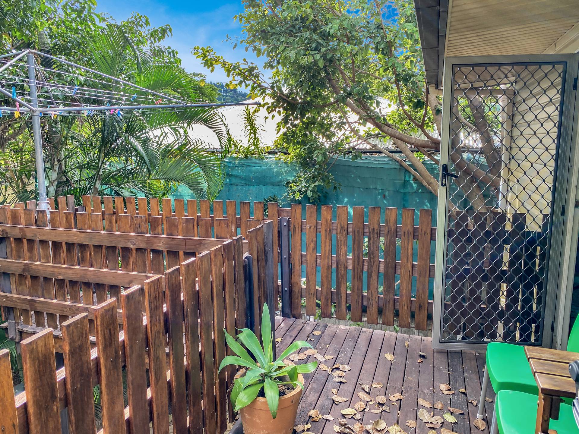 1/22 Picnic St is an upstairs unit currently let at $300 per week to March 2023. Also featuring hardwood floors and high ceilings, this unit is also bright and breezy. The main bedroom is a good size at the front of the unit with built-in-robes. The second bedroom is in the middle of the unit just off the lounge and there's a potential third bedroom just off the kitchen, with built-in-robes but currently not fully partitioned off. The kitchen has been renovated and has vinyl plank flooring, whilst the laundry and bathroom are at the back of the unit, which opens up to a small deck with the washing line and views to the hills behind.