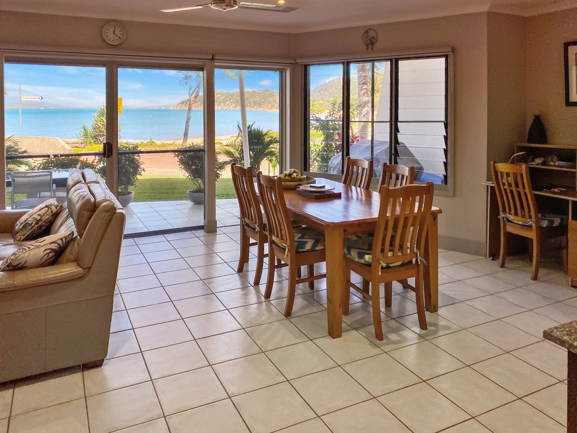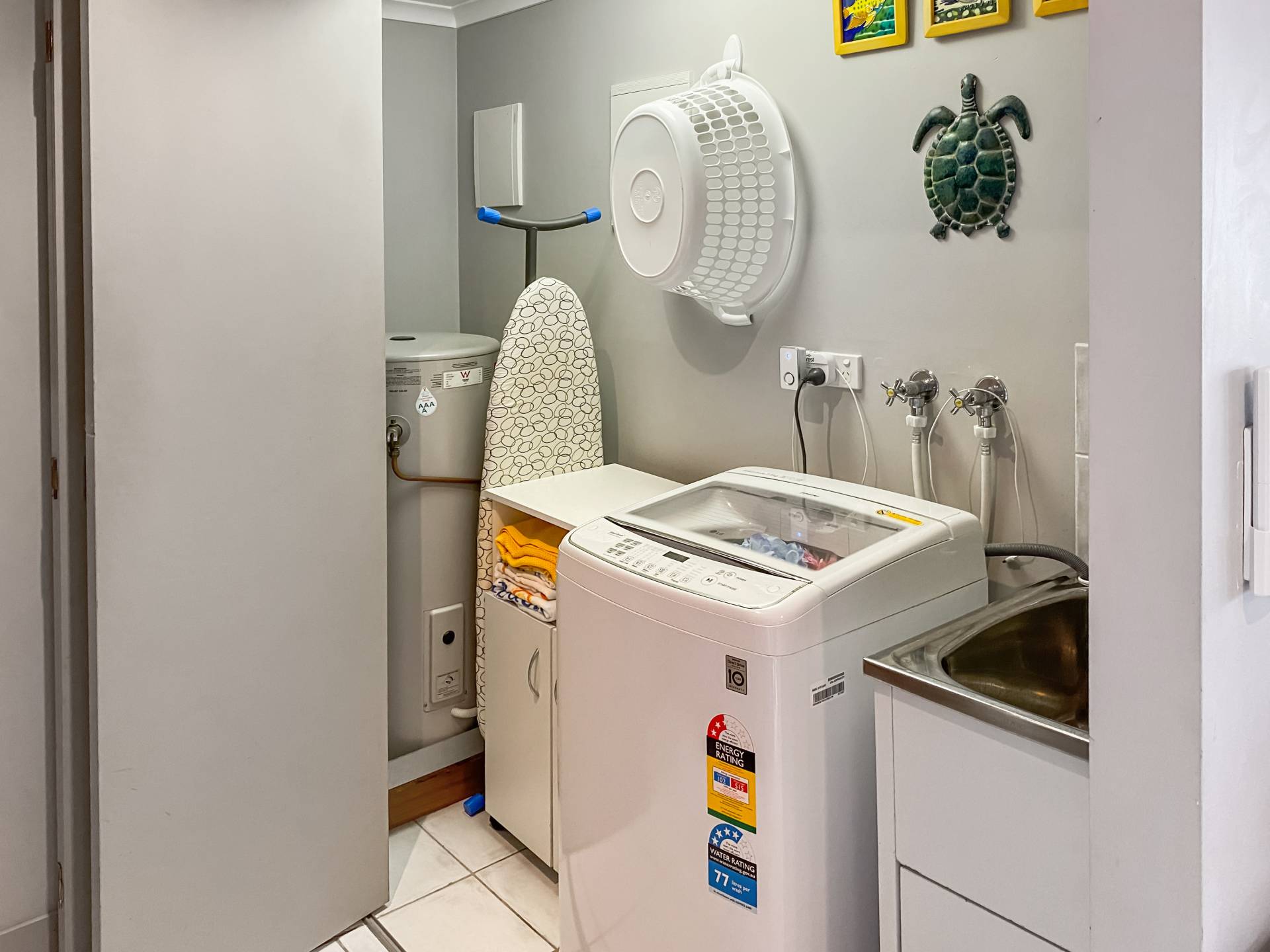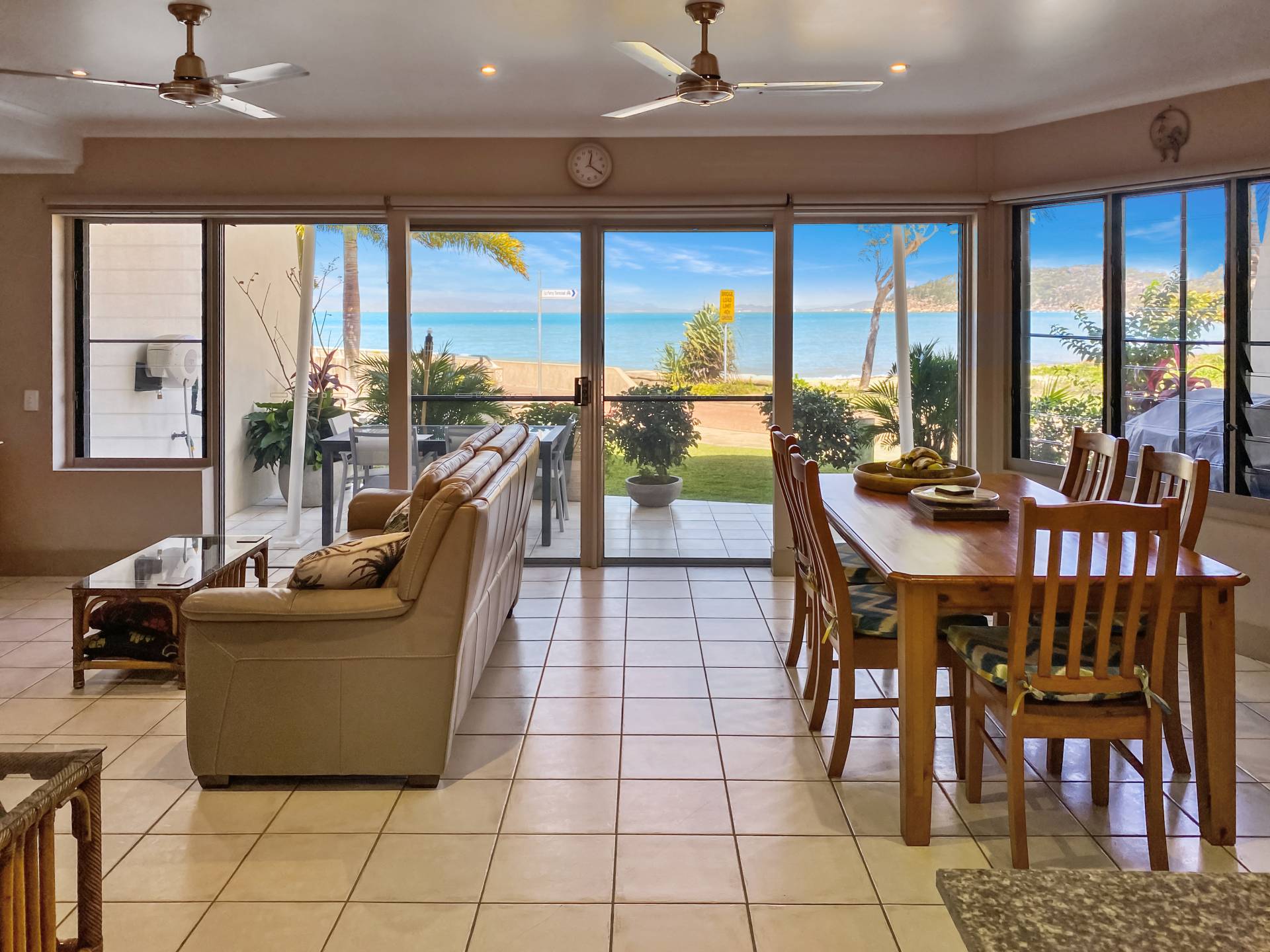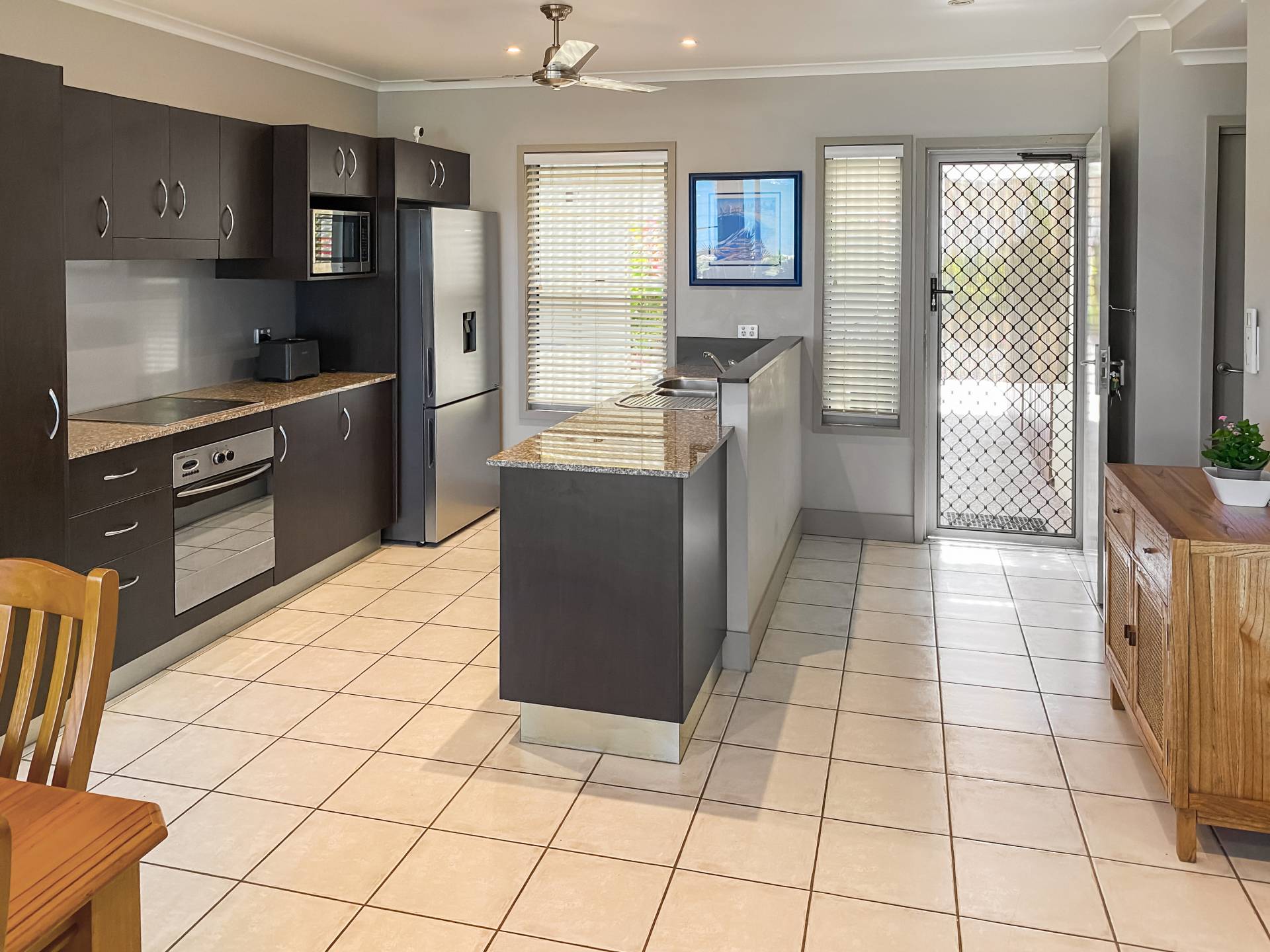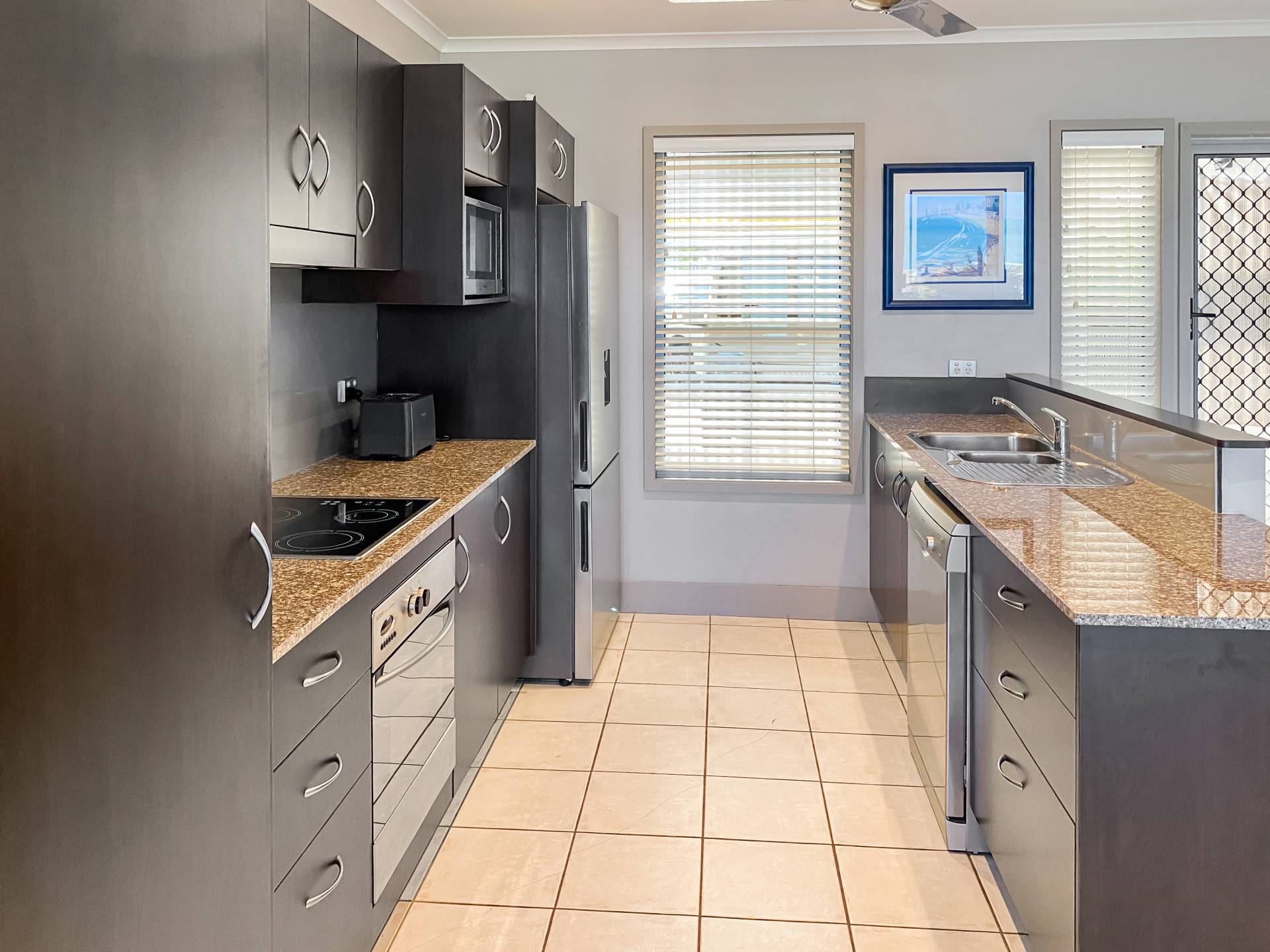 From the beach, it's a few metres walk across to the front verandah where wide glass sliding doors bring you into the open-plan living area. The galley-style kitchen features granite benchtops, induction cooktop and plenty of drawer and cupboard space. Unlike some other townhouses, there's a powder room and the laundry on this level so you don't need to run up and down stairs all day.