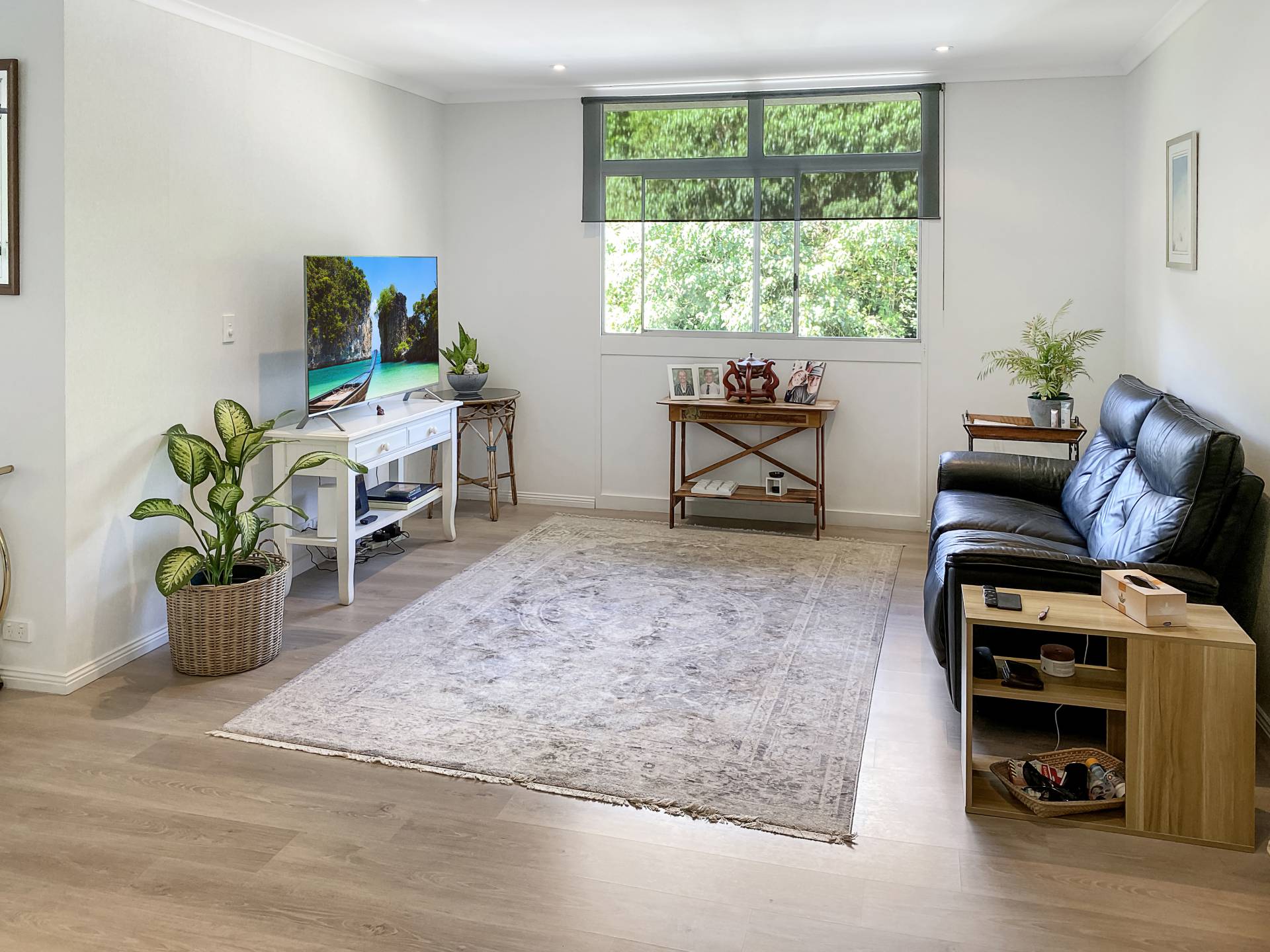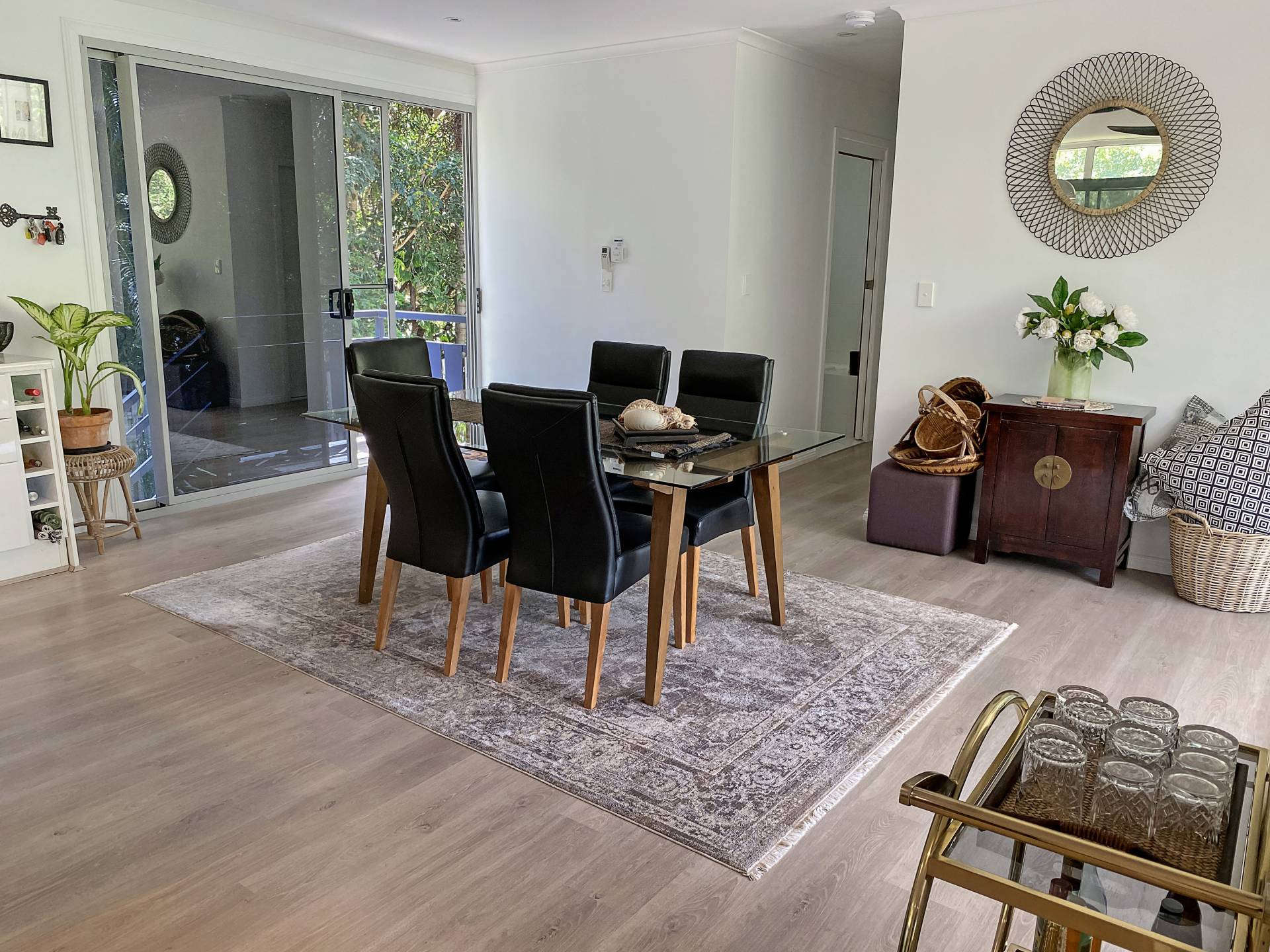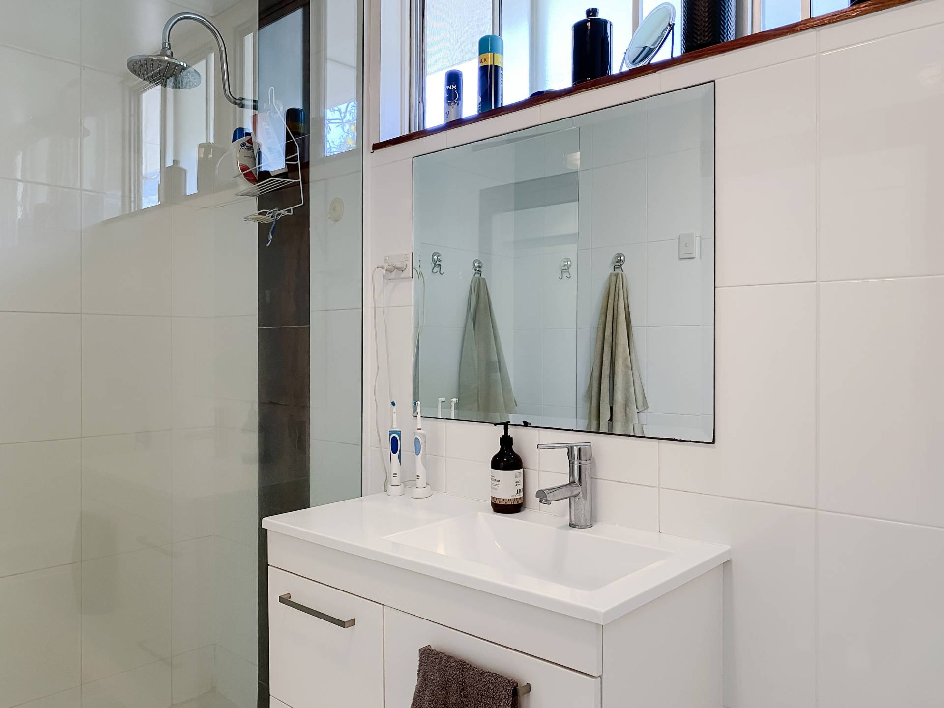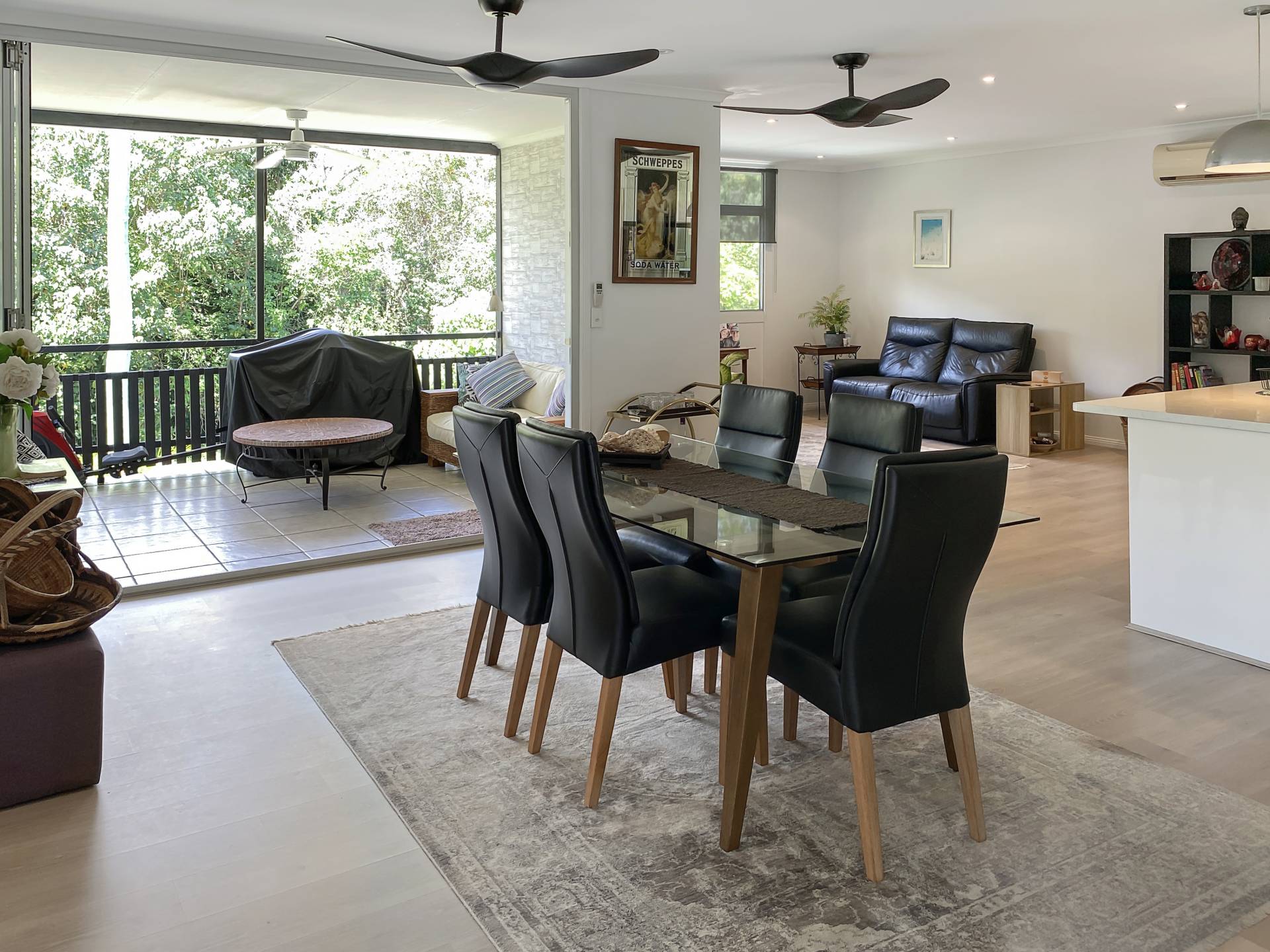 Upstairs is light and bright with lots of windows and bi-fold doors opening up onto the covered verandah with lovely views of the mountains. Front and rear external stairs bring you down to the well-tended gardens which feel much larger than the 695m2 block size due to the corner location.