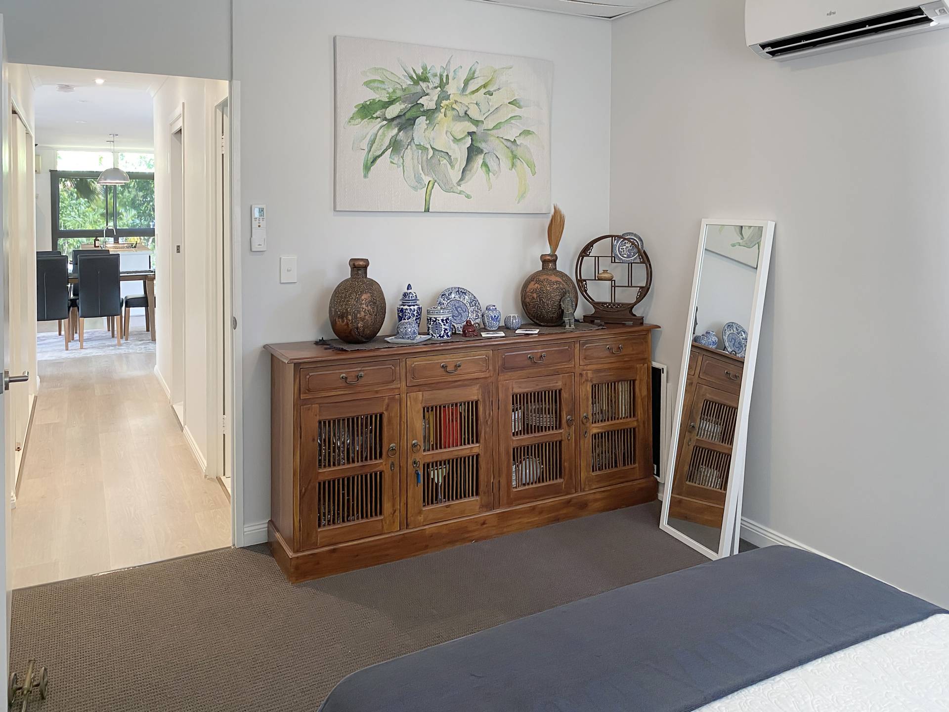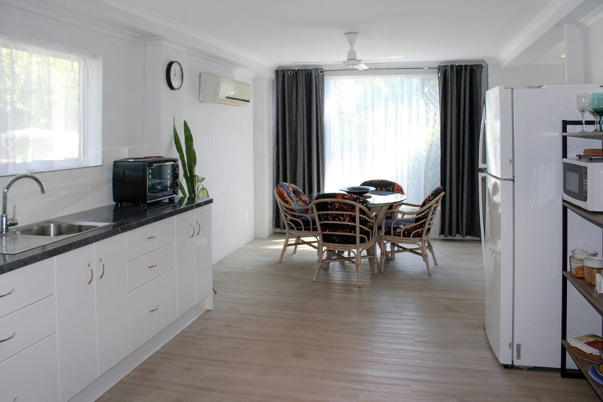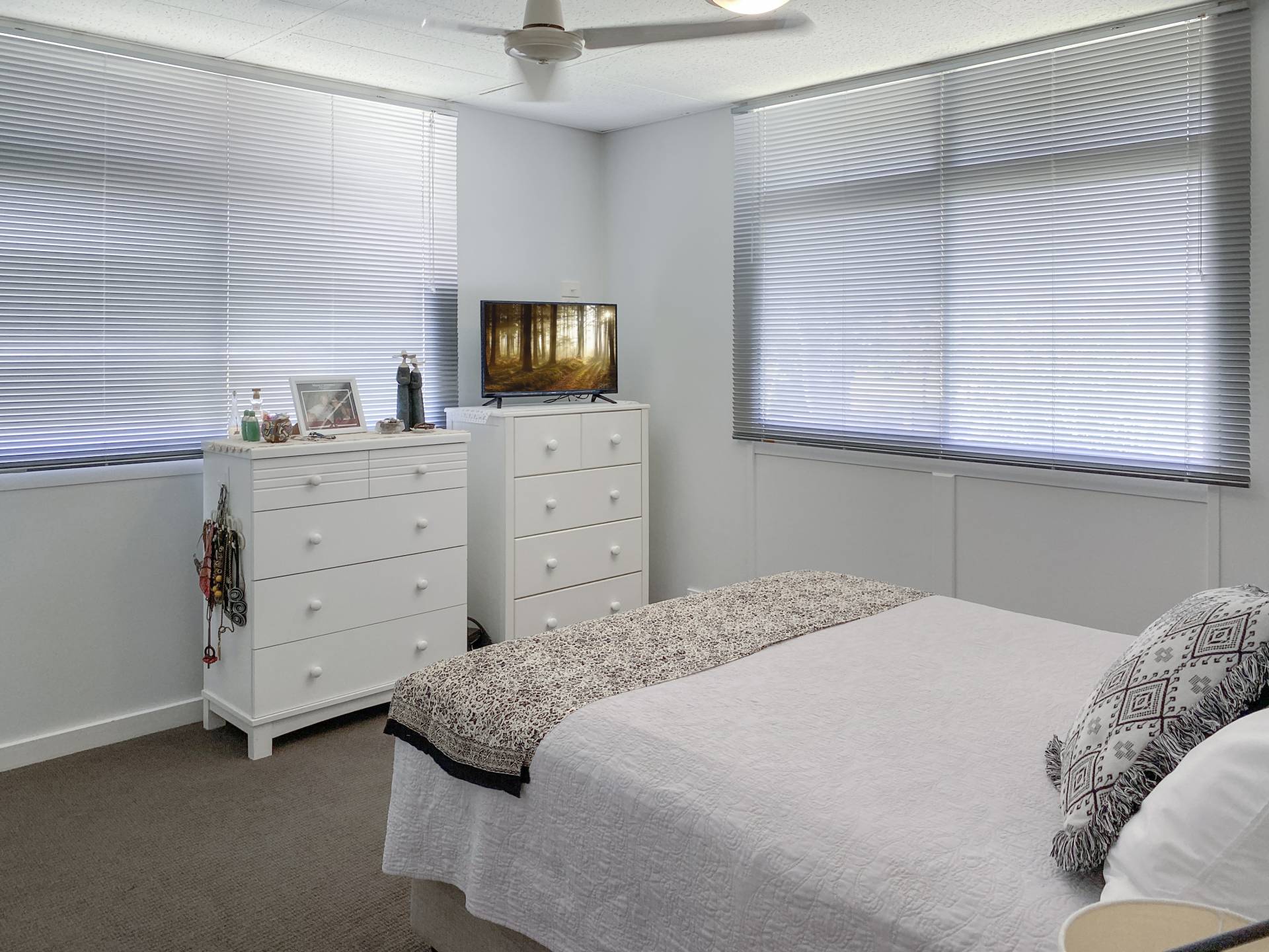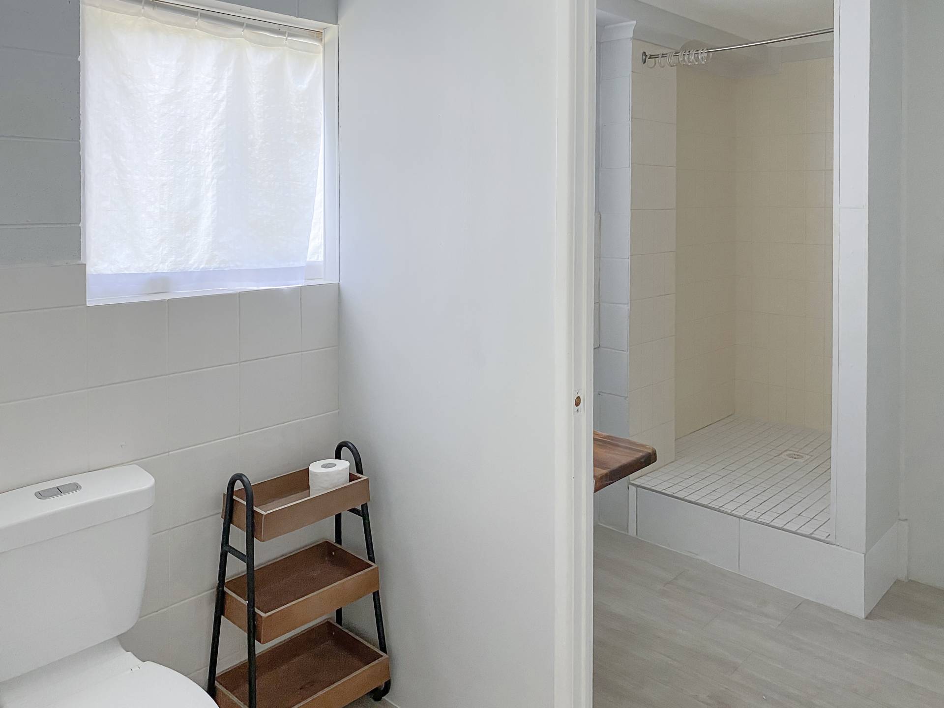 Downstairs is a shared laundry and roomy lock-up-garage. The unit has two very large bedrooms, shower & vanity with separate toilet, and an air-conditioned living/dining/kitchenette with sliding glass doors opening onto a paved patio.