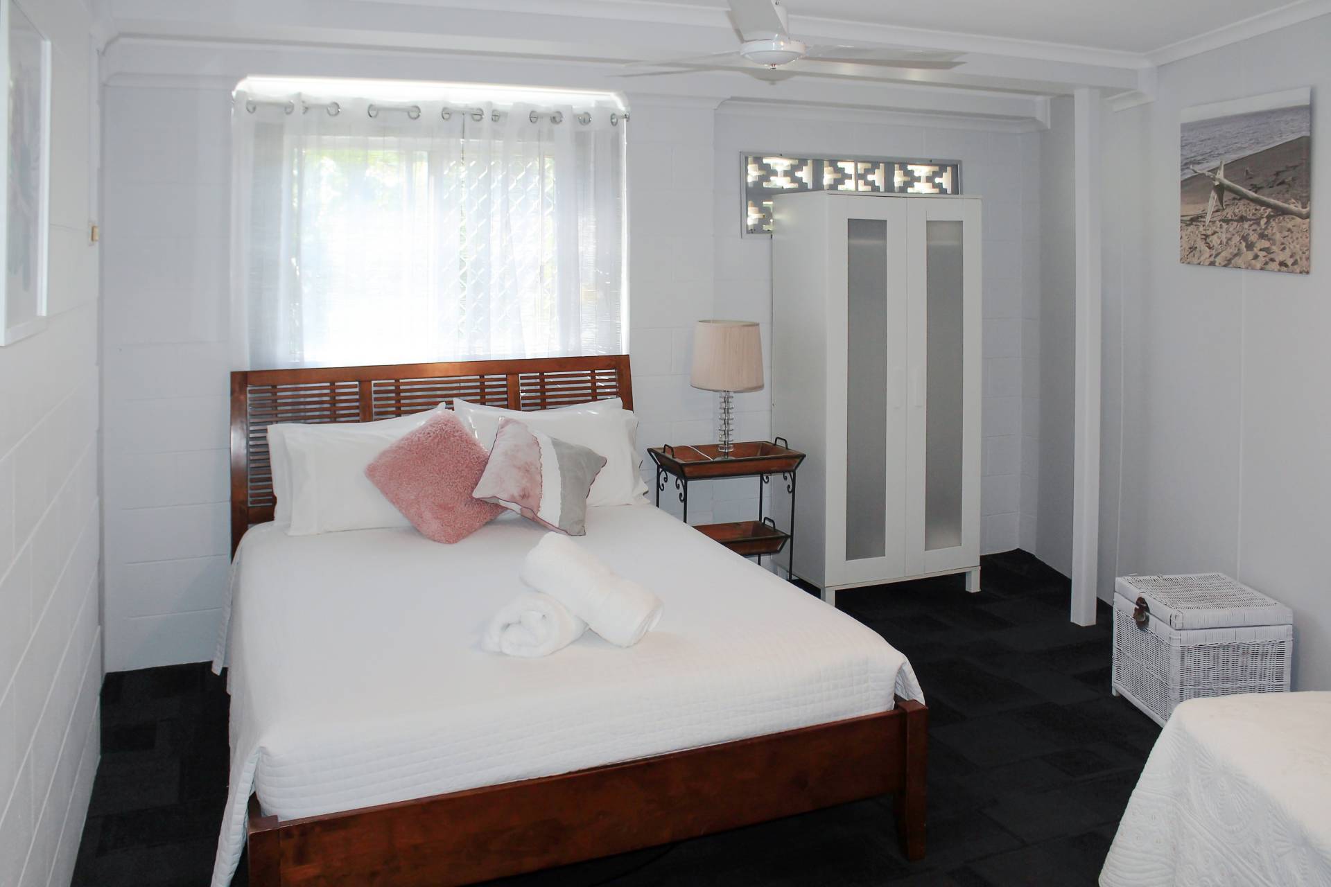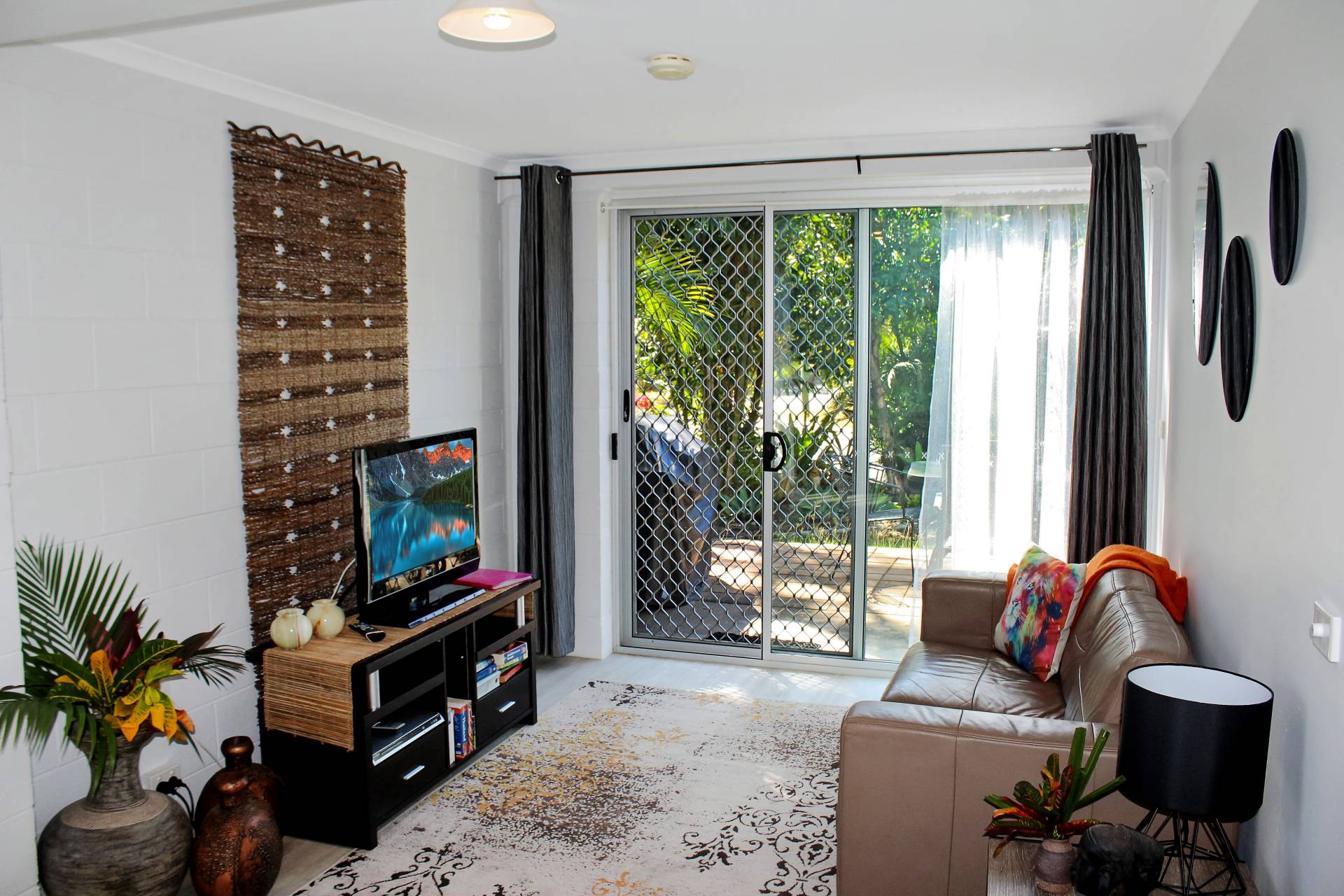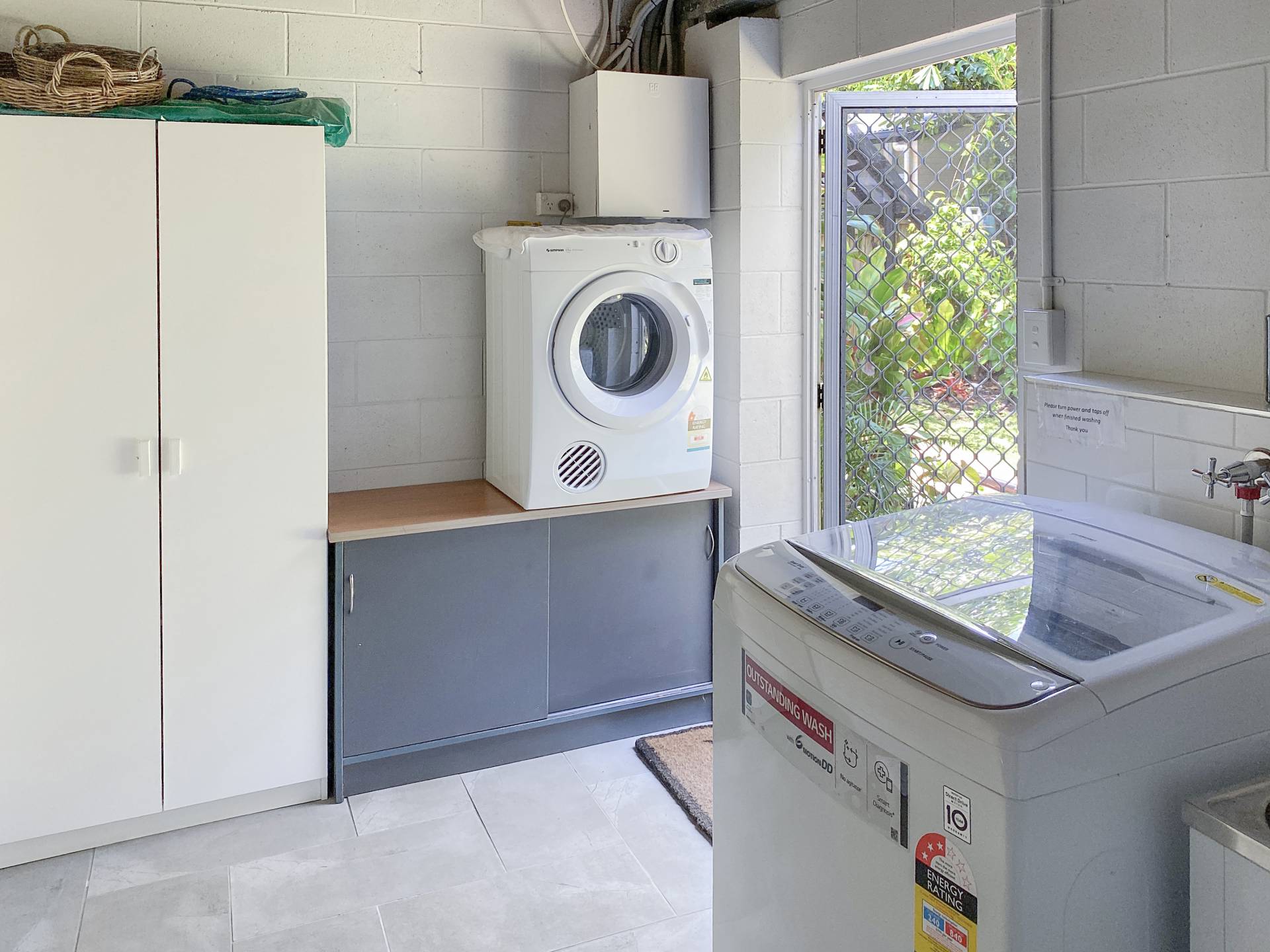 Downstairs is a shared laundry and roomy lock-up-garage. The unit has two very large bedrooms, shower & vanity with separate toilet, and an air-conditioned living/dining/kitchenette with sliding glass doors opening onto a paved patio.