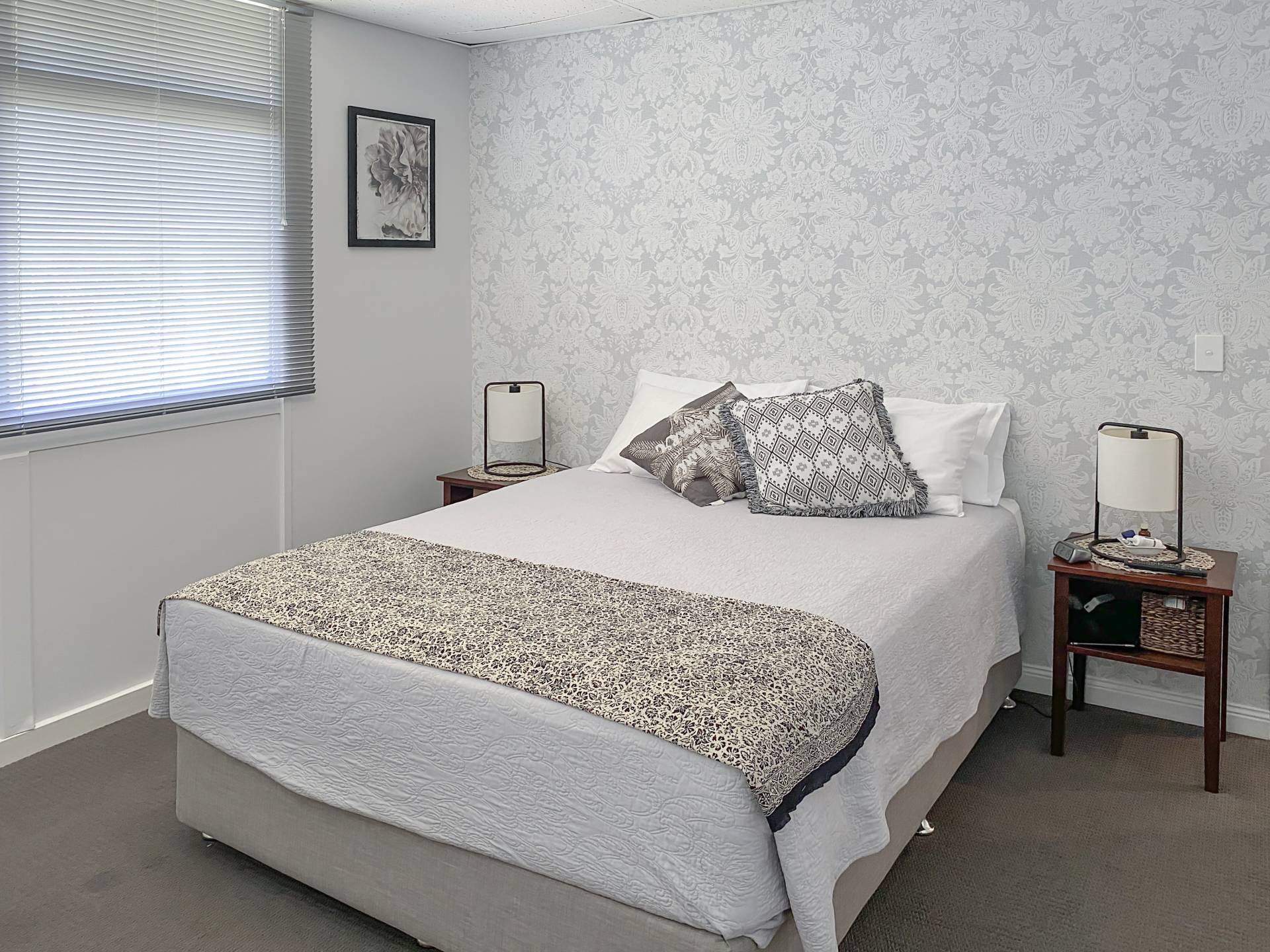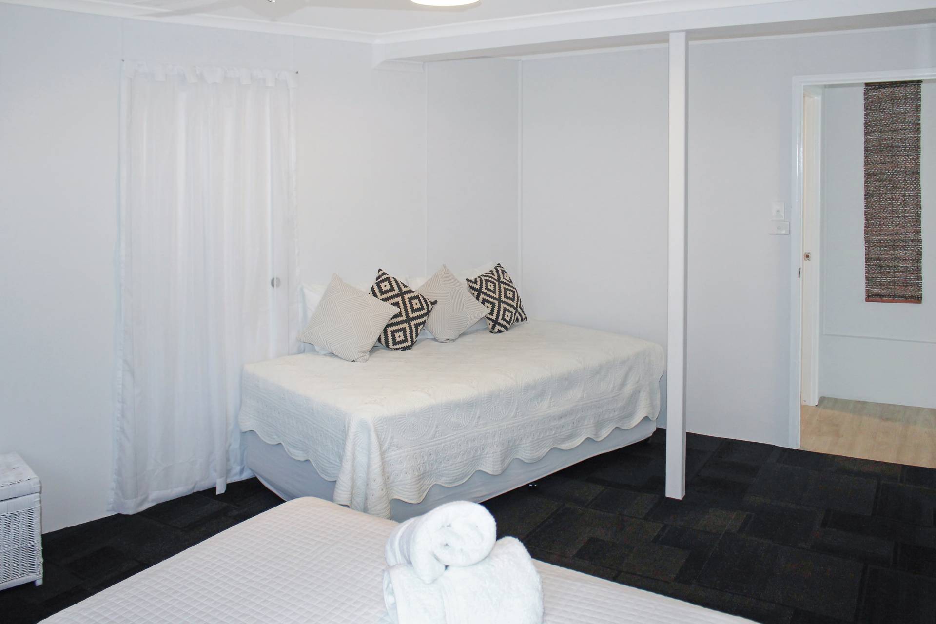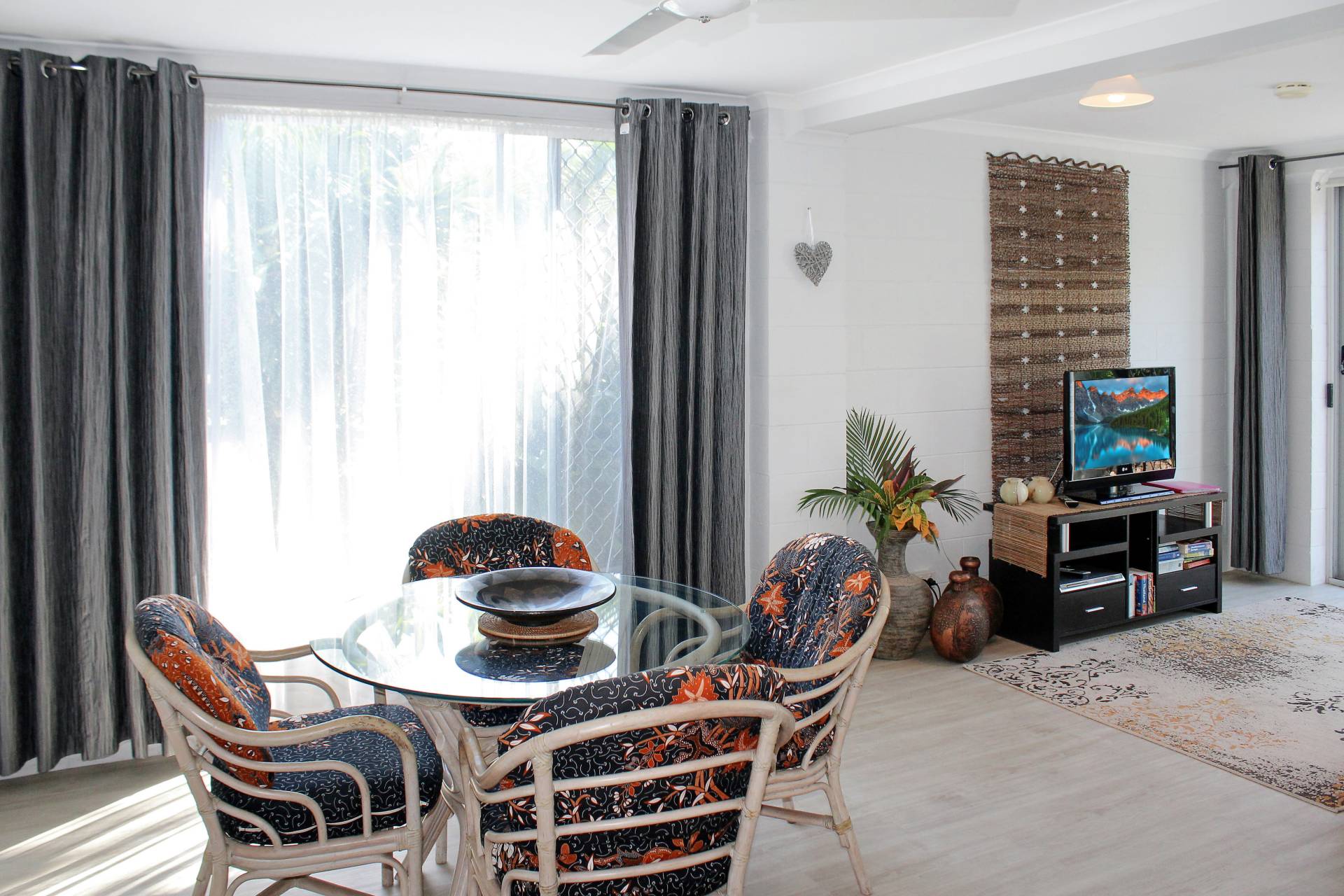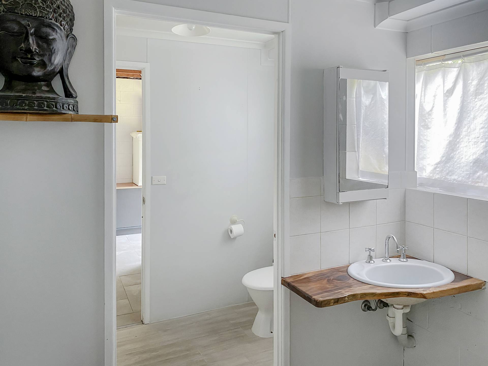 Downstairs is a shared laundry and roomy lock-up-garage. The unit has two very large bedrooms, shower & vanity with separate toilet, and an air-conditioned living/dining/kitchenette with sliding glass doors opening onto a paved patio.