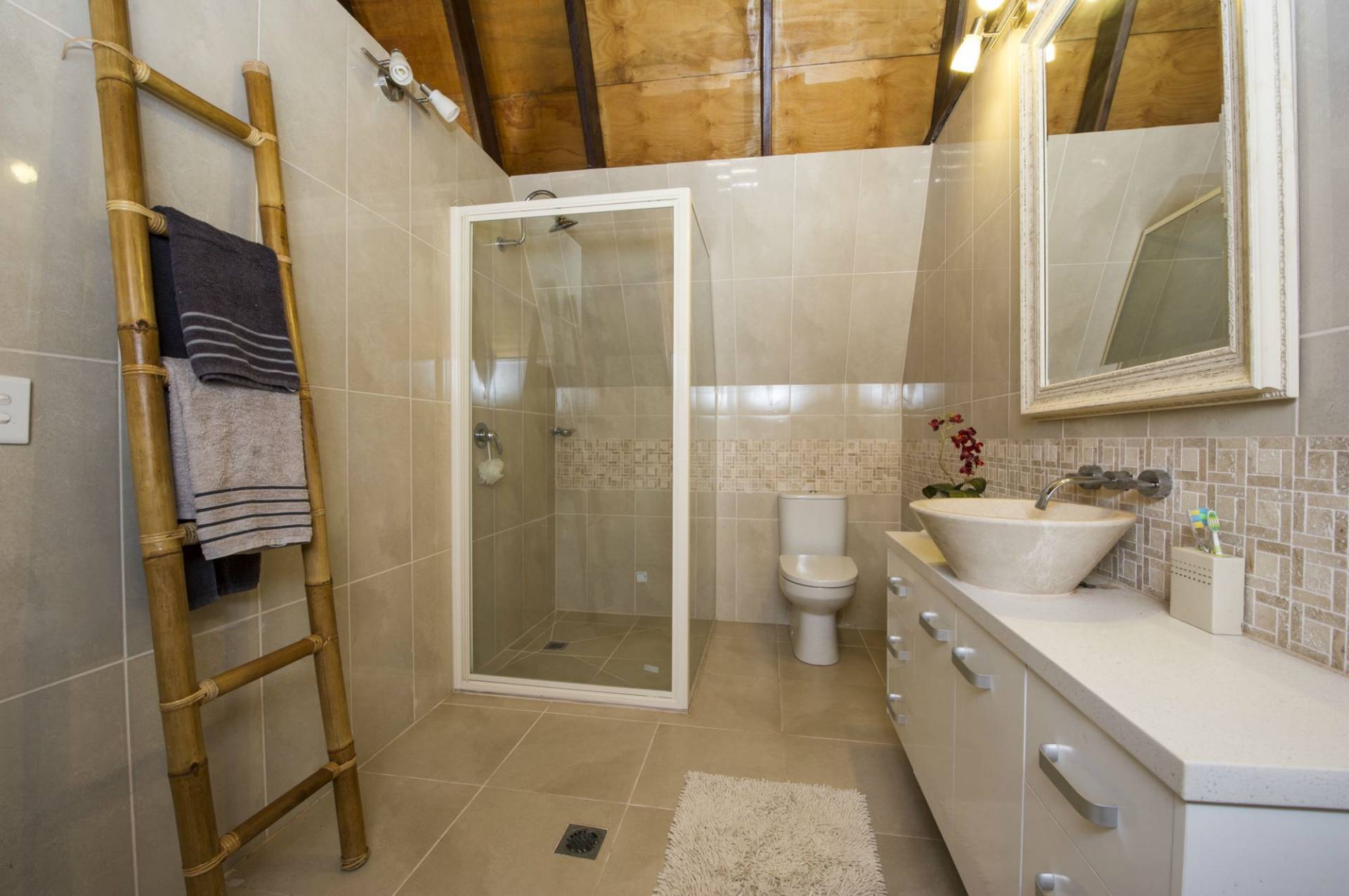 * The stylish main bathroom offers a relaxing bathtub with views onto the garden, walk-in rainhead shower, and very smart laundry area