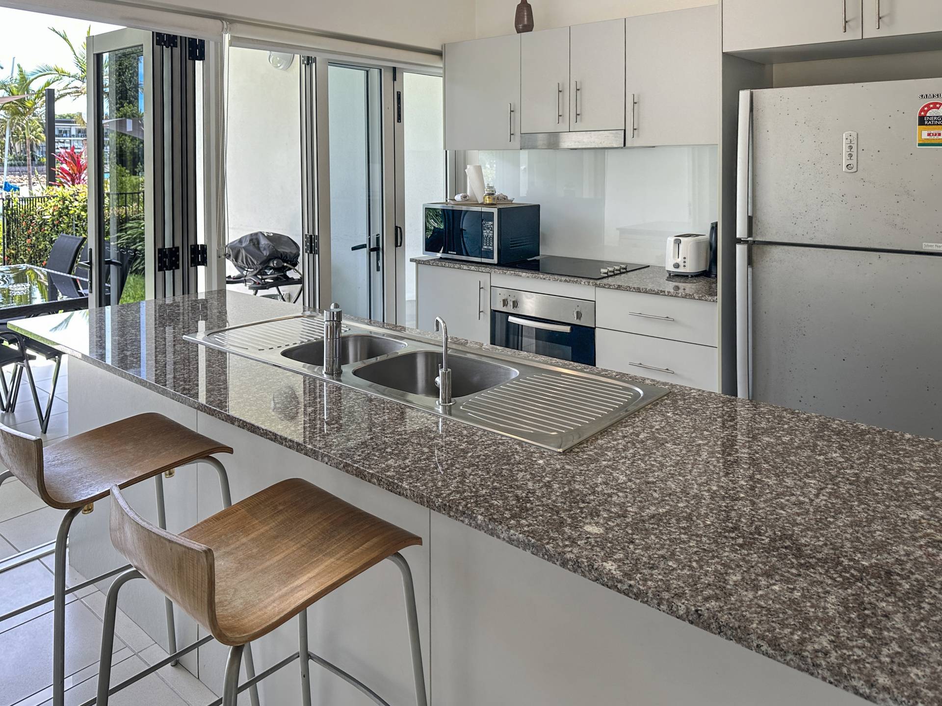 The modern kitchen features granite benchtops and plenty of cupboard and bench space and is designed to cater for indoor or outdoor entertaining.