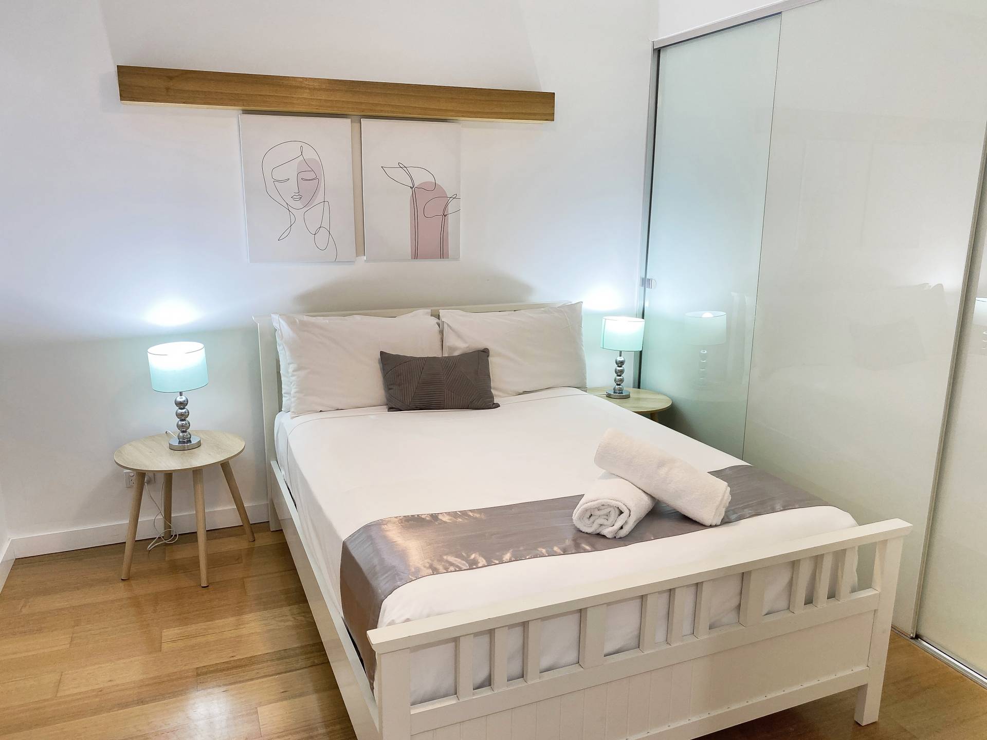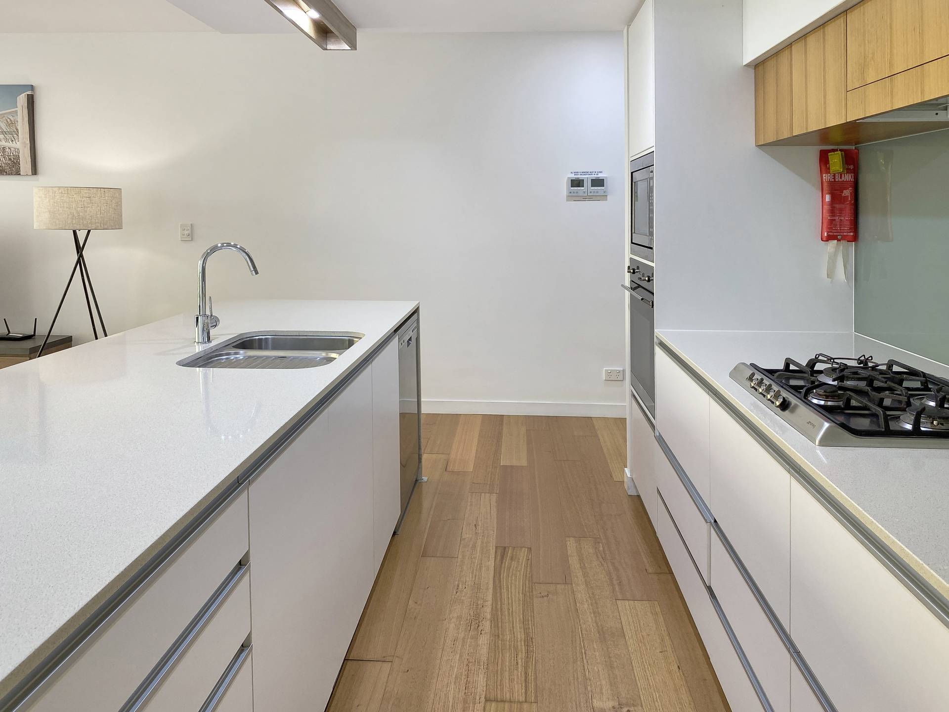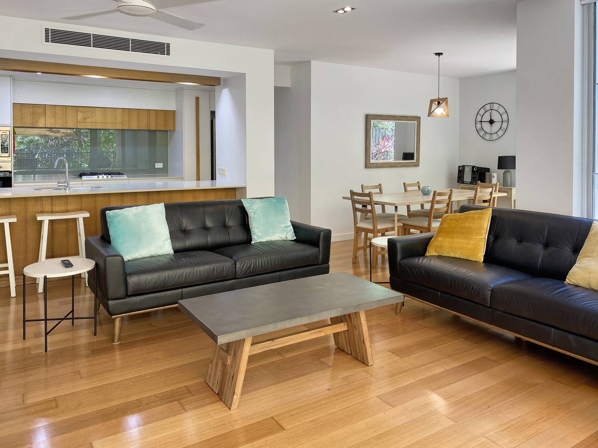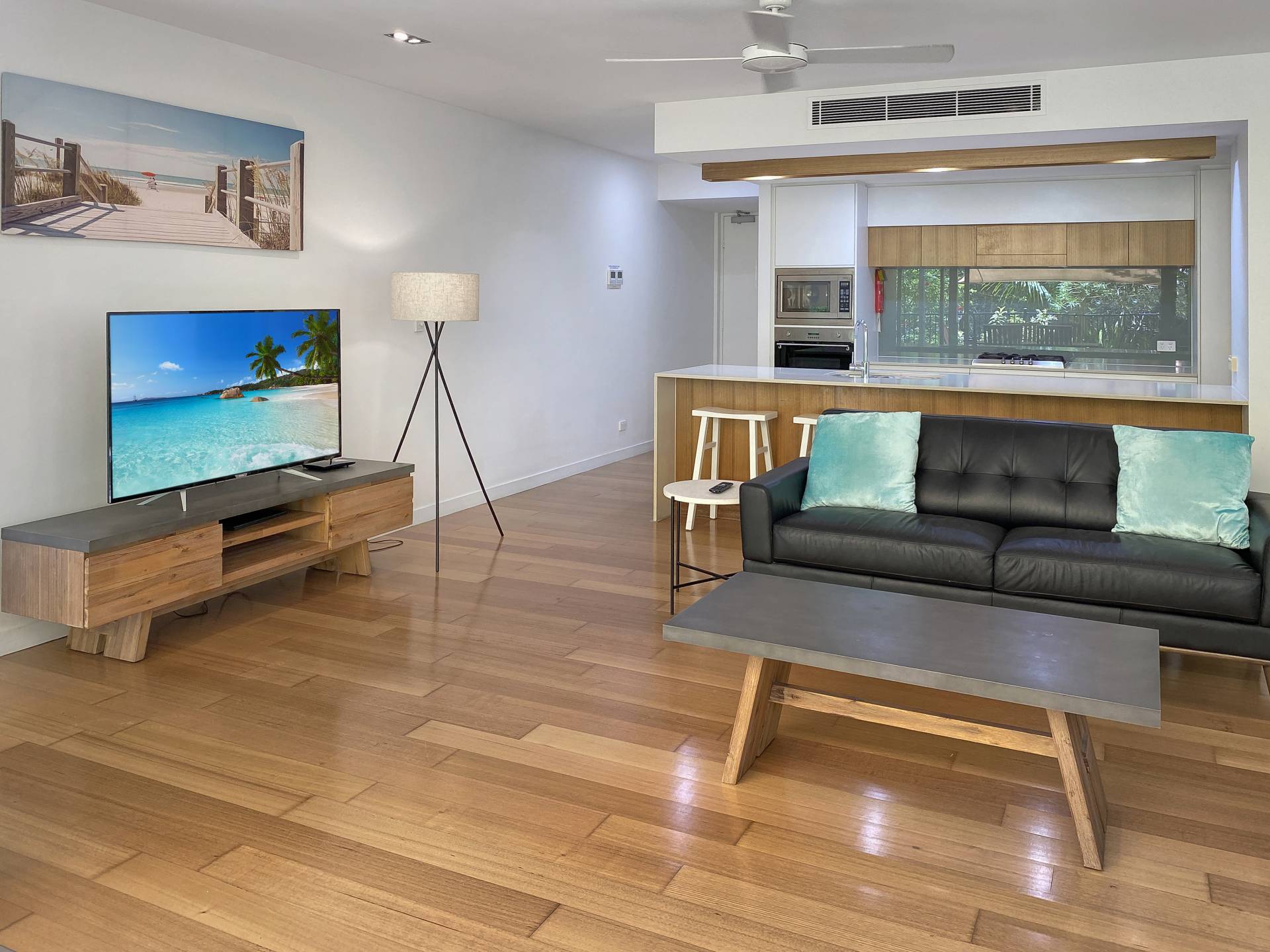 The interior exudes a warmth missing from most modern apartments, with beautiful polished wood floors throughout the living areas and bedrooms. Ducted reverse cycle air conditioning and ceiling fans are installed throughout to keep you comfortable in any weather. The galley-style kitchen is sleek and modern with Smeg oven & microwave, dishwasher, gas cooktop, stone benchtops and breakfast bar and comes fully equipped, right down to the teaspoons. The apartment is offered fully furnished so you can continue to holiday let or simply move in.