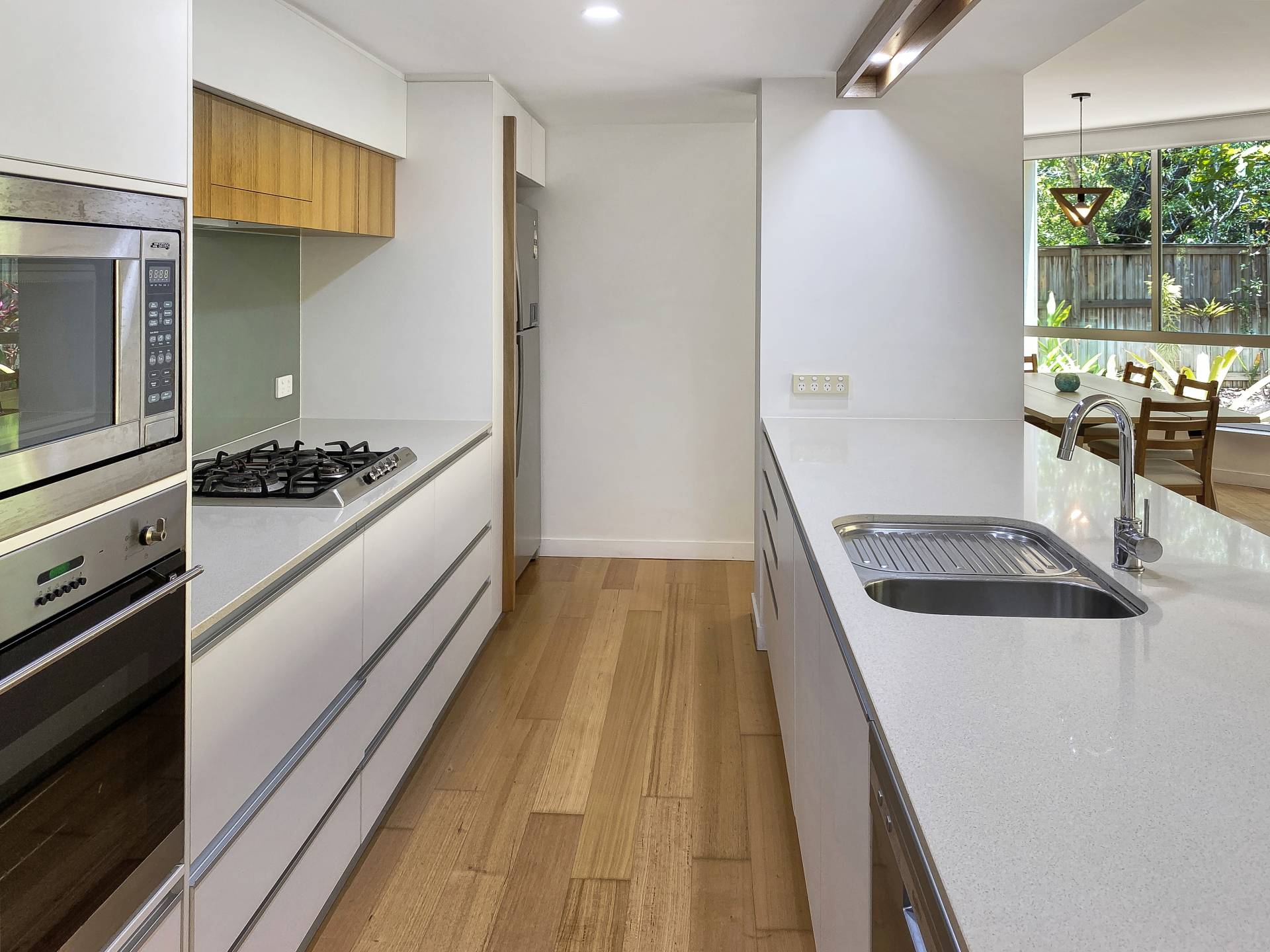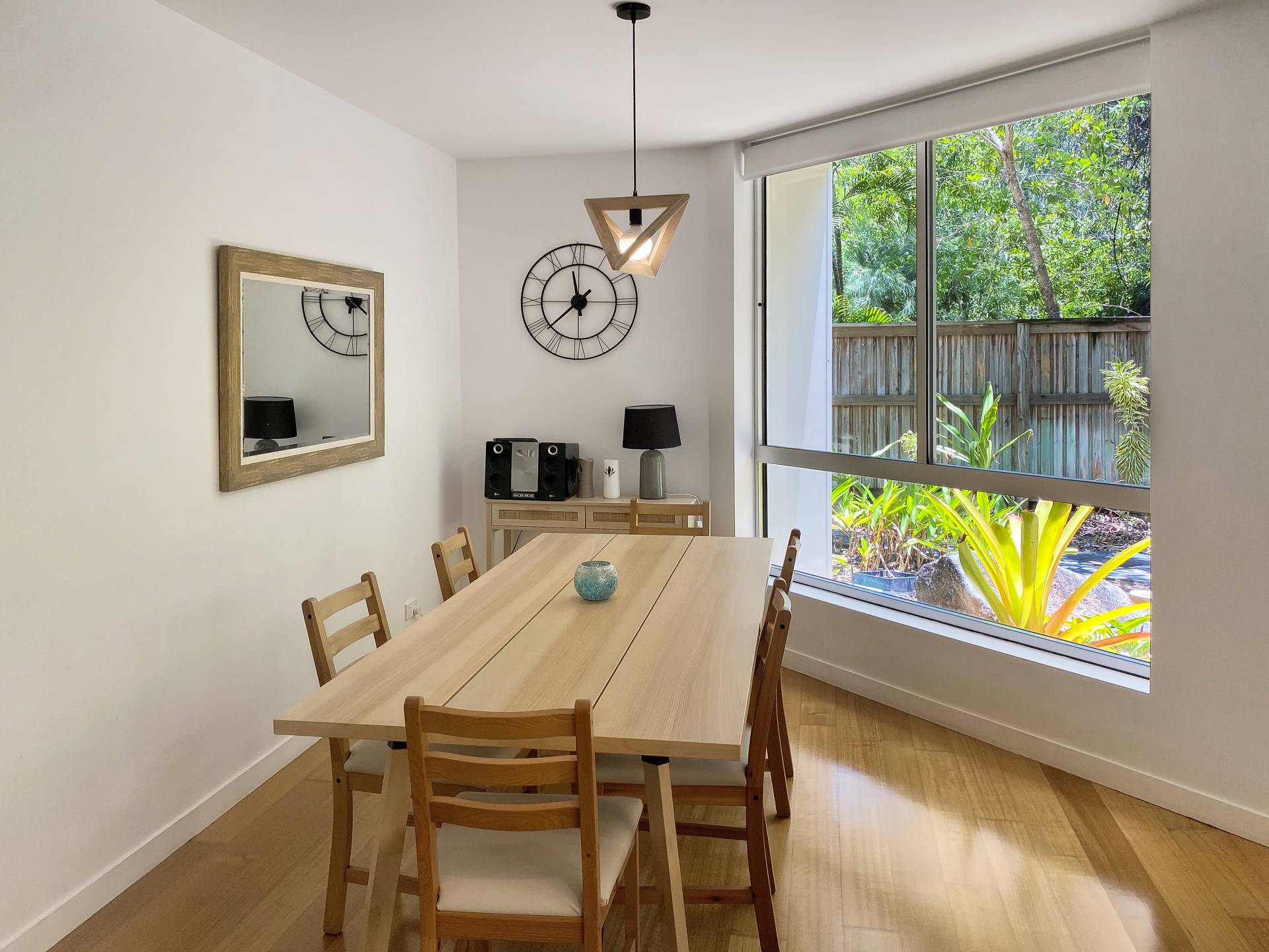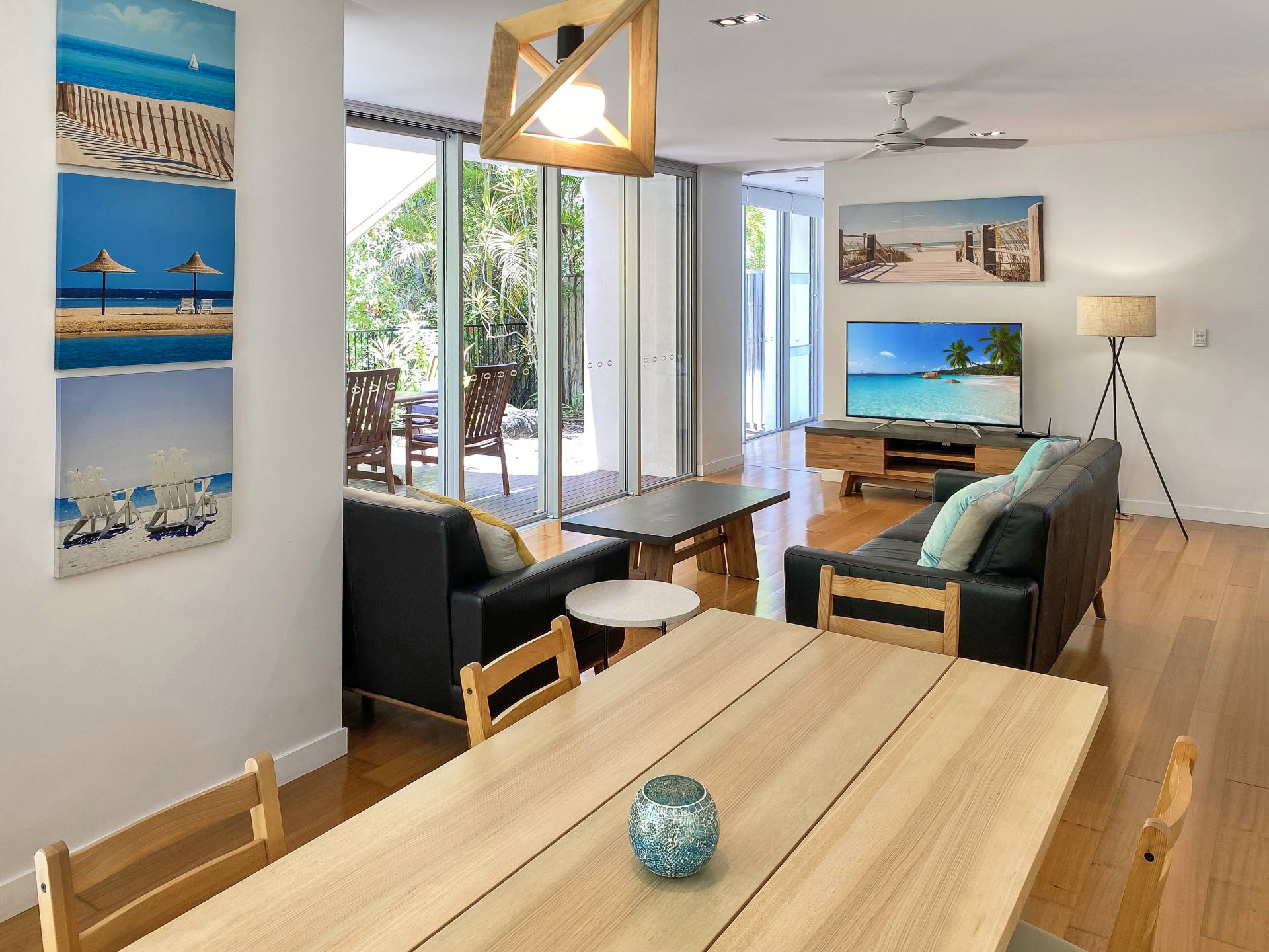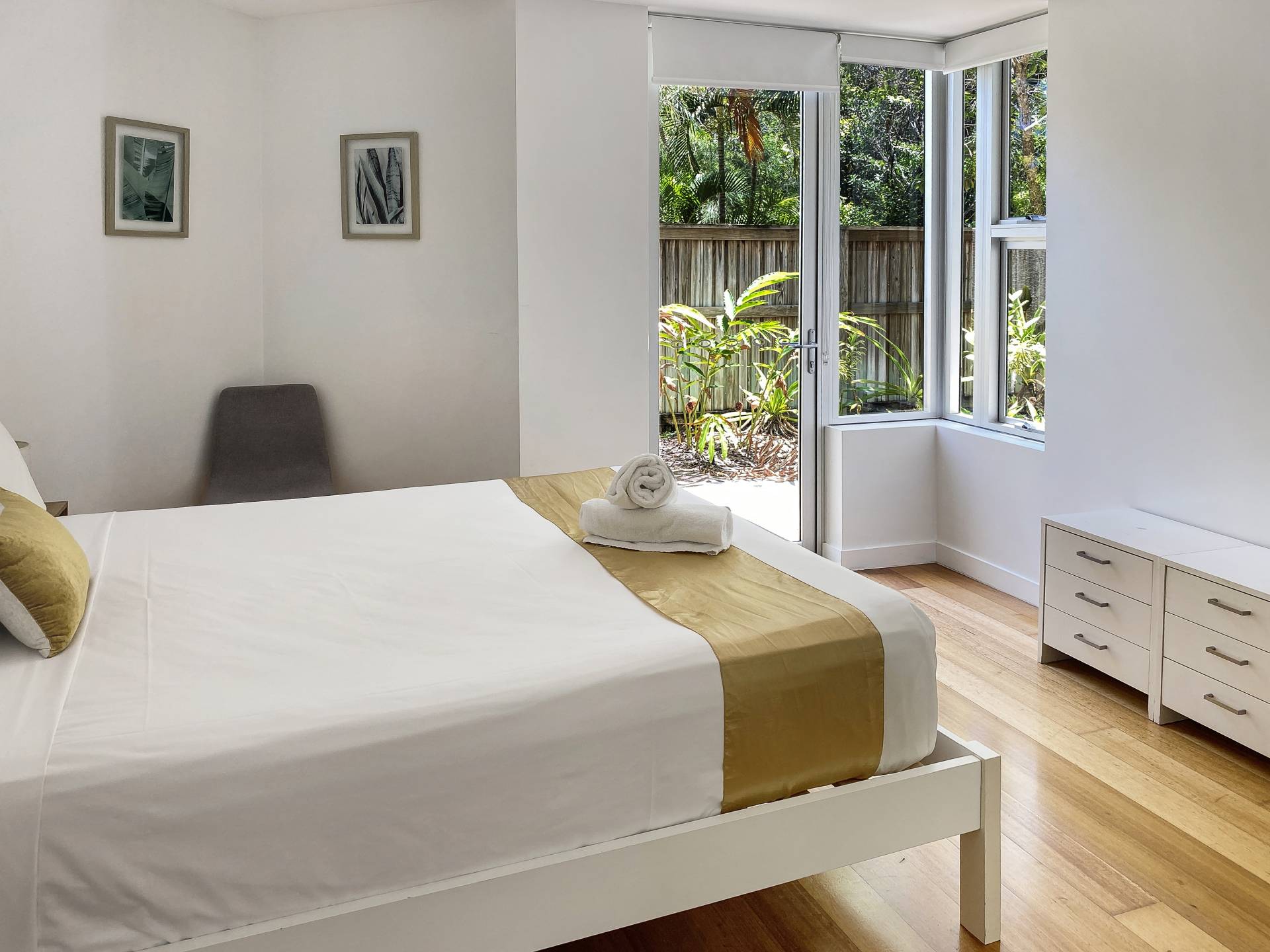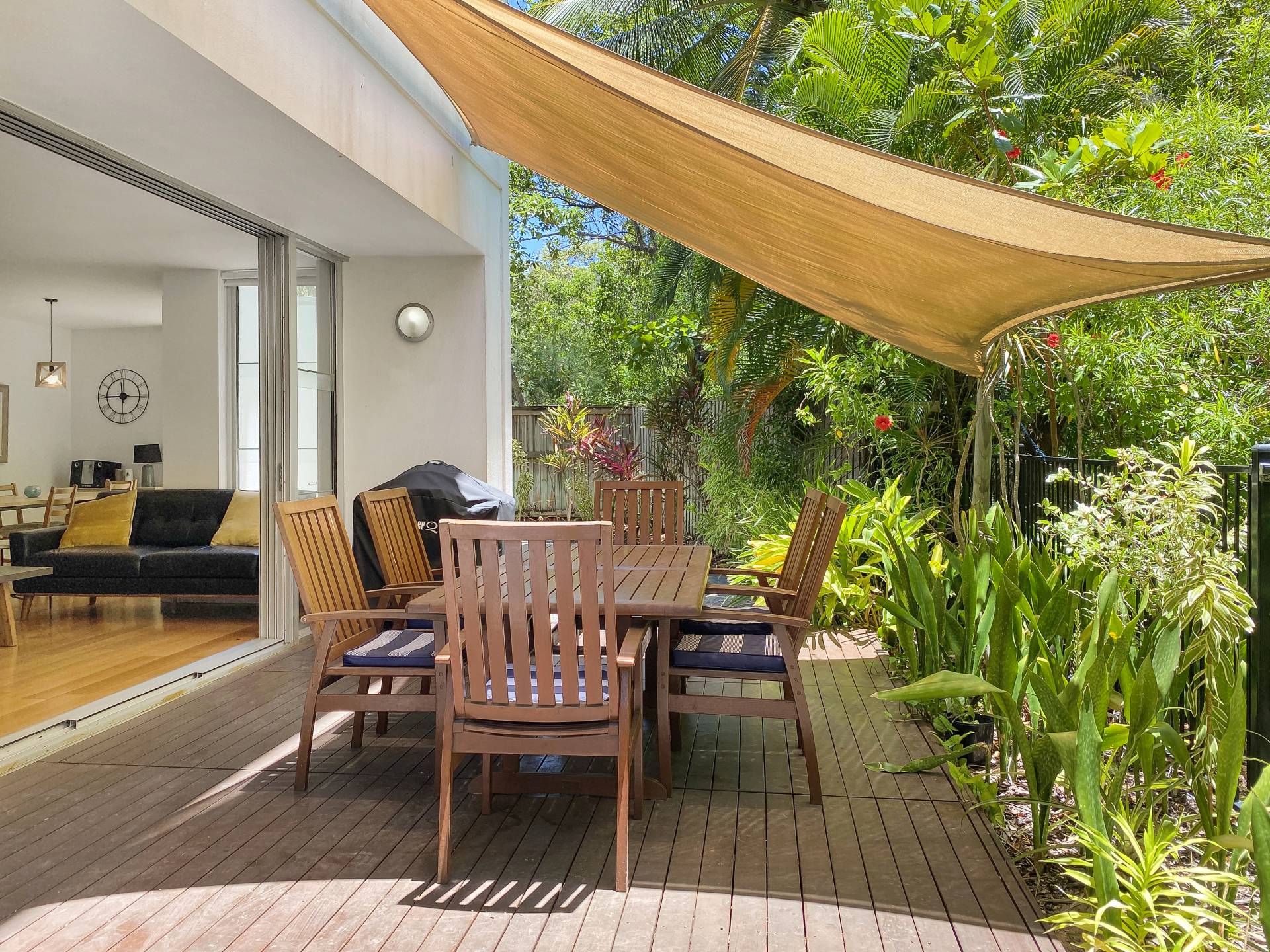Maggies Apartment 9 takes a step back from the busy beachfront and is popular amongst holiday guests for its ground floor location with a 80m2 private exclusive use area courtyard garden with bush views to the tidal creek behind. Ideal for owners who would like to bring small pets, a simple body corp application is required to have owner pets approved, subject to very reasonable conditions. Large glass sliding doors open up from the deck into the open-plan living area, with the kitchen, lounge and dining all enjoying lovely garden views. Step out of the gate or the front door and you will see the beach just across the road.