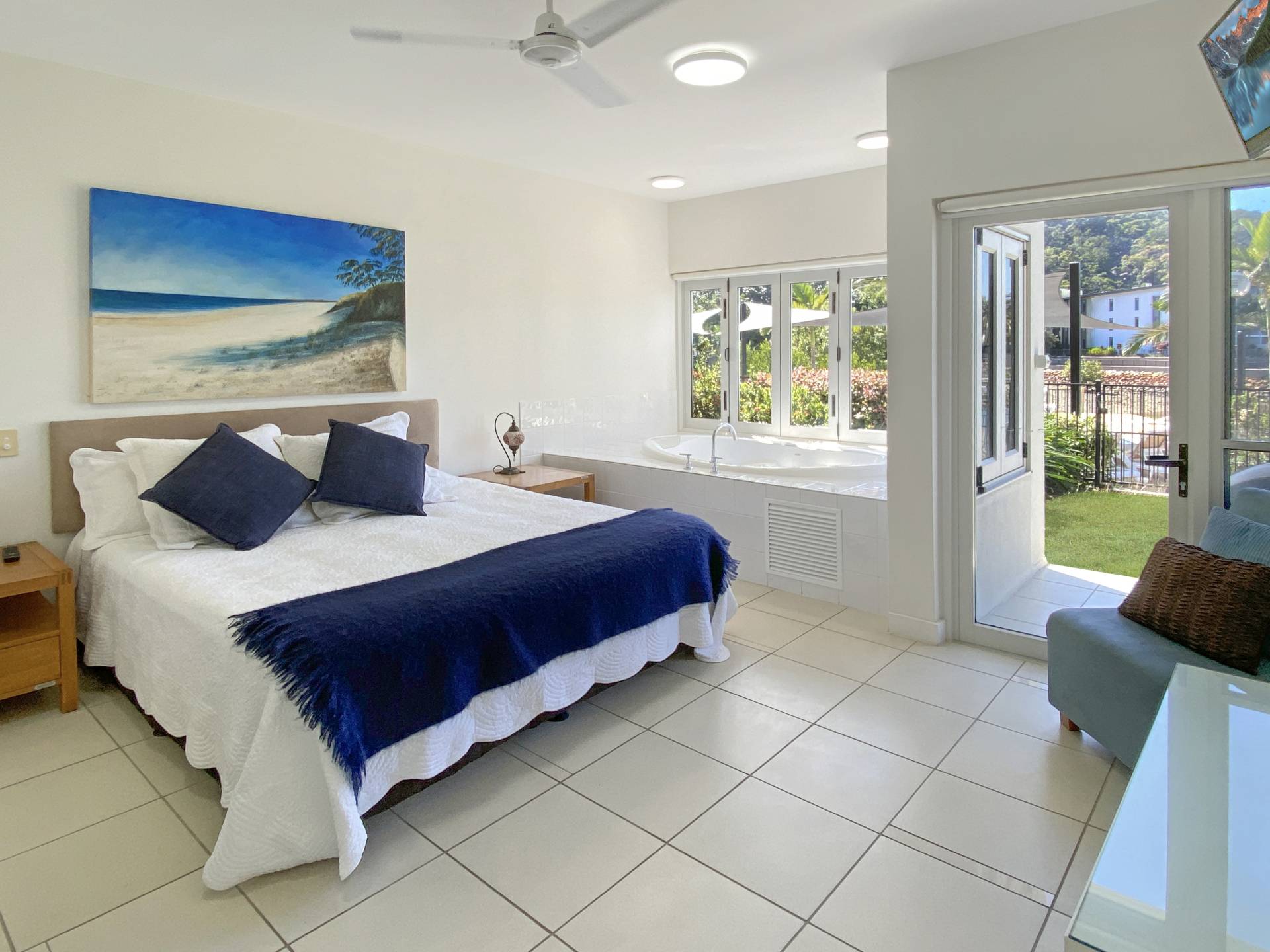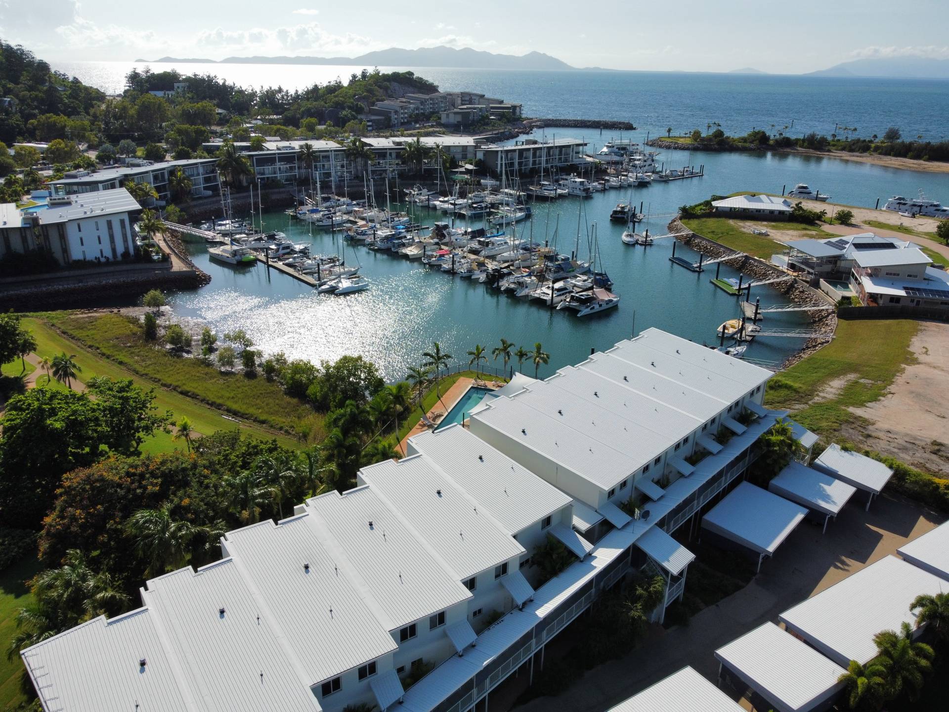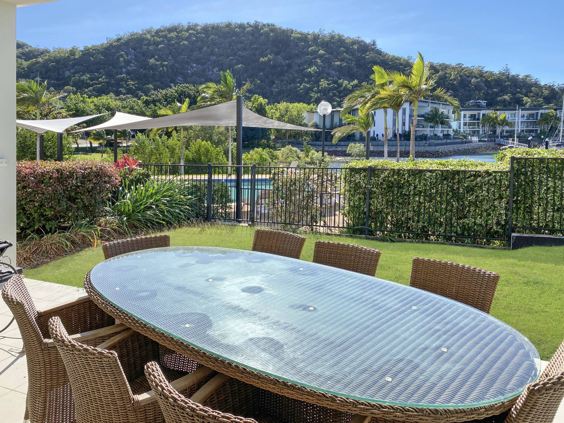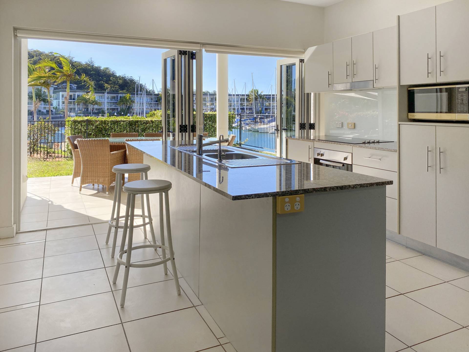 This ground floor corner apartment enjoys lovely views across the marina and to the green hills of the island dotted with their seemingly sculptured granite boulders and hoop pines.